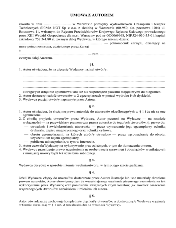 UMOWA Z AUTOREM zawarta w dniu ............................... w Warszawie pomiędzy Wydawnictwem Czasopism i Książek Technicznych SIGMA NOT Sp. z o.o. z siedzibą w Warszawie (00-950, skr. pocztowa 1004) ul. Ratuszowa 11, wpisanym do Rejestru Przedsiębiorców Krajowego Rejestru Sądowego prowadzonego przez XIII Wydział Gospodarczy dla m.st. Warszawy pod nr 0000069968, NIP 524-030-35-01, kapitał zakładowy 752 361,80 zł, zwanym dalej Wydawcą, w którego imieniu działa: .............................................................................................. — pełnomocnik Zarządu, działający na mocy pełnomocnictwa, udzielonego przez Zarząd a ............................................................................. — zam. ......................................................................... zwanym dalej Autorem. §1. 1. Autor oświadcza, że na zlecenie Wydawcy napisał utwór/y: ................................................................................................................................................................ ................................................................................................................................................................ ................................................................................................................................................................ którego/ych dotąd nie opublikował ani też nie rozporządził prawami majątkowymi do niego/nich. 2. Autor dostarczył całość utworu/ów w 2 egzemplarzach w postaci wydruku i/lub dyskietki. 3. Wydawca przyjął utwór/y napisany/e przez Autora. § 2. 1. Autor oświadcza, że służą mu prawa autorskie do utworu/ów określonego/ych w § 1 i że nie są one ograniczone. 2. Z chwilą przyjęcia utworu/ów przez Wydawcę, Autor przenosi na Wydawcę — na zasadzie wyłączności — na przewidziany prawem czas prawa autorskie do tego/ych utworu/ów, tj. prawo do: utrwalania i zwielokrotniania utworu/ów — przez wytwarzanie jego egzemplarzy techniką drukarską, zapisu magnetycznego oraz techniką cyfrową, obrotu egzemplarzami, na których utwór/y utrwalono — przez wprowadzanie do obrotu, użyczenie lub najem egzemplarzy, publiczne udostępnianie, w tym w Internecie. 3. Autor zezwala Wydawcy na wykonywanie praw zależnych, w tym do tłumaczenia utworu. 4. Wydawcy przysługuje prawo przeniesienia na osobę trzecią uprawnień i obowiązków wynikających z niniejszej umowy bądź też udzielenia sublicencji. § 3. Wydawca decyduje o sposobie i formie wydania utworu, w tym o jego szacie graficznej. § 4. Jeżeli Wydawca włączy do utworu/ów dostarczone przez Autora ilustracje lub inne materiały chronione prawem autorskim, Autor obowiązany jest do wcześniejszego uzyskania pisemnego zezwolenia na ich wykorzystanie przez Wydawcę oraz poniesienia związanych z tym kosztów, jak również oznaczenia włączanego/ych utworu/ów nazwiskiem i imieniem ich autora. § 5. Autor oświadcza, że zachowuje kompletny/e duplikat/y utworu/ów, a dostarczony/e Wydawcy oryginały w formie określonej w § 1 ust. 2 przechodzi/dzą na własność Wydawcy. § 6. 1. Wynagrodzenie Autora za przeniesienia praw w zakresie określonym w §§ 2.2 i 4 umowy Strony ustalają na kwotę zł ........nieodpłatnie....................... (słownie: ........................................................... ..............................................................................................................). 2. Za ewentualne wykorzystanie praw zależnych, w tym wydanie utworu w wersji przetłumaczonej ustala się wynagrodzenie w wysokości 25 % wynagrodzenia, o którym mowa w p. l. 3. Wynagrodzenie będzie wypłacone jednorazowo .............................—............................... w terminie 6 tygodni od daty opublikowania utworu/ów. 4. Autor oświadcza, że posiada konto w banku (nr konta) ..................—................................................. na które Wydawca przekaże wynagrodzenie z tytułu niniejszej umowy. § 7. Wynagrodzenie Autora ustalone w § 6 ust. l obejmuje należność za: 1) dostarczenie utworu/ów w umówionej postaci, 2) uzyskanie przez Wydawcę prawa do utworu/ów, wynikających z §§ 2.2. i 4 umowy, 3) wykonanie korekty autorskiej. § 8. Oprócz wynagrodzenia, Autor otrzyma 1 nie przeznaczony do sprzedaży egzemplarz autorski czasopisma, w którym zostanie/ną zamieszczony/ne napisany/e przez niego utwór/ry. § 9. Wydawca ma prawo dokonywania w utworze zmian wynikających. z opracowania redakcyjnego. W przypadku zmian głębiej ingerujących w treść utworu/ów konieczne jest ich skonsultowanie z Autorem. § 10. 1. Wydawca obowiązany jest wydać utwór i przystąpić do jego rozpowszechnienia w ciągu 2 lat, licząc od dnia przyjęcia utworu, co najmniej w jednej z form określonych w § 2 umowy. 2. Jeżeli Wydawca nie przystąpi do rozpowszechnienia utworu w określonym terminie, Autor może wyznaczyć Wydawcy dodatkowy termin, nie krótszy niż sześć miesięcy, z zagrożeniem, że po tym terminie odstąpi od umowy. § 11. Wszystkie zmiany i uzupełnienia niniejszej umowy oraz odstąpienie od umowy wymagają formy pisemnej. pod rygorem nieważności. Strony mogą dokonywać zmian lub uzupełnień dotyczących warunków niniejszej umowy również w formie pism, jeżeli z ich treści. wynika jednoznacznie, że zgadzają się na takie zmiany i uzupełnienia. § 12. W sprawach nie uregulowanych niniejszą umową mają zastosowanie przepisy ustawy z 4 lutego 1994 r. o prawie autorskim i prawach pokrewnych (Dz. U. 2006 Nr 90 poz. 631) z późniejszymi zmianami oraz kodeks cywilny. § 13. Wszystkie spory mogące wyniknąć z tytułu niniejszej umowy będą rozstrzygane przez sądy rzeczowo właściwe w Warszawie. § 14 Umowa zostaje sporządzona w 2 jednobrzmiących egzemplarzach: 1 dla Wydawcy i 1 dla Autora. AUTOR WYDAWCA ............................................ ......