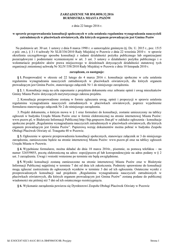 ZARZĄDZENIE NR BM.0050.32.2016 BURMISTRZA MIASTA PSZÓW z dnia 22 lutego 2016 r. w sprawie przeprowadzenia konsultacji społecznych w celu ustalenia regulaminu wynagradzania nauczycieli zatrudnionych w placówkach oświatowych, dla których organem prowadzącym jest Gmina Pszów Na podstawie art. 30 ust. 1 ustawy z dnia 8 marca 1990 r. o samorządzie gminnym (tj. Dz. U. 2015 r., poz. 1515 z póź. zm.), § 3 i 4 uchwały Nr XLII/336/2010 Rady Miejskiej w Pszowie z dnia 22 września 2010 r. w sprawie określenia szczegółowego sposobu konsultacji z radami działalności pożytku publicznego lub organizacjami pozarządowymi i podmiotami wymienionymi w art. 3 ust. 3 ustawy o działalności pożytku publicznego i o wolontariacie projektów aktów prawa miejscowego w dziedzinach dotyczących działalności statutowej tych organizacji zmienionej uchwałą Nr XLIV/358/2010 Rady Miejskiej w Pszowie z dnia 10 listopada 2010 r. zarządzam, co następuje: § 1. Przeprowadzić w okresie od 22 lutego do 4 marca 2016 r. konsultacje społeczne w celu ustalenia regulaminu wynagradzania nauczycieli zatrudnionych w placówkach oświatowych, dla których organem prowadzącym jest Gmina Pszów, stanowiącego załącznik Nr 1 do niniejszego zarządzenia. § 2. 1. Konsultacje mają na celu zapoznanie z projektem dokumentu oraz zebranie opinii i uwag mieszkańców Gminy Miasta Pszów dotyczących merytorycznego zakresu projektu. 2. Konsultacje przeprowadzone zostaną w formie zgłaszania uwag, opinii i propozycji w sprawie ustalenia regulaminu wynagradzania nauczycieli zatrudnionych w placówkach oświatowych, poprzez wypełnienie formularza stanowiącego załącznik Nr 2 do niniejszego zarządzenia. 3. Projekt dokumentu, o którym mowa w § 1 oraz formularz do konsultacji, zostanie umieszczony na tablicy ogłoszeń w budynku Urzędu Miasta Pszów oraz w formie elektronicznej na stronie internetowej Miasta Pszów: www.pszow.pl, w Biuletynie Informacji Publicznej http://bip.gmpszow.finn.pl/ w zakładce ogłoszenia - konsultacje społeczne projekt „Regulaminu wynagradzania nauczycieli zatrudnionych w placówkach oświatowych, dla których organem prowadzącym jest Gmina Pszów”. Papierową wersję dokumentów można pobrać w budynku Zespołu Obsługi Placówek Oświaty ul. Traugutta 48 w Pszowie. § 3. Ogłoszenie w sprawie przeprowadzenia konsultacji społecznych, stanowiące załącznik nr 3 do niniejszego zarządzenia, zamieszczone będzie na stronie internetowej Miasta Pszów: www.pszow.pl oraz na tablicy ogłoszeń Urzędu Miasta w Pszowie. § 4. Wypełnione formularze, można składać do dnia 18 marca 2016r., pisemnie, za pomocą telefaksu – na numer 324559055, pocztą elektroniczną na adres: [email protected] lub korespondencyjnie na adres podany w § 2 ust. 3 zarządzenia. Uwagi i wnioski wniesione po terminie nie będą uwzględnione. § 5. Wyniki konsultacji zostaną zamieszczone na stronie internetowej Miasta Pszów oraz w Biuletynie Informacji Publicznej najpóźniej w terminie 7 dni od dnia ich zakończenia. Podmioty uprawnione do konsultacji mogą zgłaszać zastrzeżenia do ogłoszonych wyników w terminie 3 dni od ich ogłoszenia. Ostateczne wyniki z przeprowadzonych konsultacji nad projektem „Regulaminu wynagradzania nauczycieli zatrudnionych w placówkach oświatowych, dla których organem prowadzącym jest Gmina Pszów” zostaną podane do publicznej wiadomości nie później niż 7 dni od ich ostatecznego rozstrzygnięcia. § 6. Wykonanie zarządzenia powierza się Dyrektorowi Zespołu Obsługi Placówek Oświaty w Pszowie Id: E343CE47-82C1-4A1C-B11A-3B4F88653C4B. Przyjęty Strona 1 § 7. Zarządzenie wchodzi w życie z dniem podpisania. Burmistrz Miasta Pszów Katarzyna Sawicka-Mucha Id: E343CE47-82C1-4A1C-B11A-3B4F88653C4B. Przyjęty Strona 2 Załącznik Nr 1 do Zarządzenia Nr BM.0050.32.2016 Burmistrza Miasta Pszów z dnia 22 lutego 2016 r. REGULAMIN określający niektóre zasady wynagradzania nauczycieli zatrudnionych w szkołach i przedszkolach, dla których organem prowadzącym jest Gmina Miasto Pszów Rozdział 1. Postanowienia ogólne § 1. 1. Regulamin określający niektóre zasady wynagradzania nauczycieli zatrudnionych w szkołach i przedszkolach, dla których organem prowadzącym jest Gmina Miasto Pszów, zwany dalej, „regulaminem”, określa: 1) wysokość i szczegółowe warunki przyznawania nauczycielom dodatków: a) za wysługę lat, b) motywacyjnego, c) funkcyjnego, d) za warunki pracy, e) wychowawczego, 2) szczegółowe warunki obliczania i wypłacania wynagrodzenia za godziny ponadwymiarowe i godziny doraźnych zastępstw; 3) wysokość wypłacanych nagród; 4) wysokość i szczegółowe zasady przyznawania i wypłacania innych świadczeń wynikających ze stosunku pracy, z wyłączeniem świadczeń, o których mowa w art. 30 ust. 1 pkt 4 Karty Nauczyciela. § 2. 1. Ilekroć w regulaminie jest mowa o: 1) Karcie Nauczyciela – należy przez to rozumieć ustawę z dnia 26 stycznia 1982 r. Karta Nauczyciela (t. j. z Dz. U. 2014 r. poz. 191 z późn.zm.); 2) Rozporządzeniu – należy przez to rozumieć Rozporządzenie Ministra Edukacji i Sportu z dnia 31 stycznia 2005 r. w sprawie wysokości minimalnych stawek wynagrodzenia zasadniczego nauczycieli, ogólnych warunków przyznawania dodatków do wynagrodzenia zasadniczego oraz wynagradzania za pracę w dniu wolnym od pracy (t. j. Dz. U. z 2014 r. poz. 416 z późn.zm.); 3) dyrektorze, wicedyrektorze – należy przez to rozumieć dyrektora, wicedyrektora; 4) nauczycielu – należy przez to rozumieć nauczycieli, wychowawców i innych pracowników pedagogicznych zatrudnionych w szkołach i przedszkolach; 5) funduszu nagród – należy przez to rozumieć fundusz, o którym mowa w art. 49 ust. 1 Karty Nauczyciela; 6) nagrodzie dyrektora – należy przez to rozumieć nagrodę dyrektora szkoły; 7) nagrodzie Burmistrza – należy przez to rozumieć nagrodę Burmistrza; 8) roku szkolnym – należy przez to 
