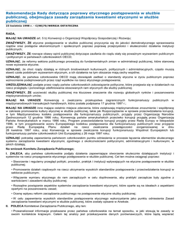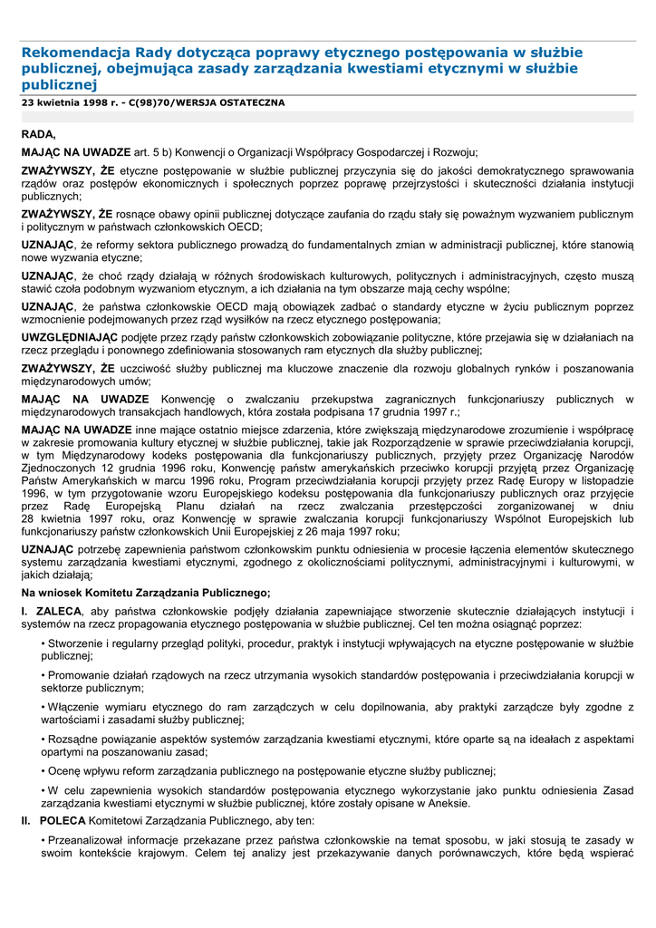 Rekomendacja Rady dotycząca poprawy etycznego postępowania w służbie publicznej, obejmująca zasady zarządzania kwestiami etycznymi w służbie publicznej 23 kwietnia 1998 r. - C(98)70/WERSJA OSTATECZNA RADA, MAJĄC NA UWADZE art. 5 b) Konwencji o Organizacji Współpracy Gospodarczej i Rozwoju; ZWAŻYWSZY, ŻE etyczne postępowanie w służbie publicznej przyczynia się do jakości demokratycznego sprawowania rządów oraz postępów ekonomicznych i społecznych poprzez poprawę przejrzystości i skuteczności działania instytucji publicznych; ZWAŻYWSZY, ŻE rosnące obawy opinii publicznej dotyczące zaufania do rządu stały się poważnym wyzwaniem publicznym i politycznym w państwach członkowskich OECD; UZNAJĄC, że reformy sektora publicznego prowadzą do fundamentalnych zmian w administracji publicznej, które stanowią nowe wyzwania etyczne; UZNAJĄC, że choć rządy działają w różnych środowiskach kulturowych, politycznych i administracyjnych, często muszą stawić czoła podobnym wyzwaniom etycznym, a ich działania na tym obszarze mają cechy wspólne; UZNAJĄC, że państwa członkowskie OECD mają obowiązek zadbać o standardy etyczne w życiu publicznym poprzez wzmocnienie podejmowanych przez rząd wysiłków na rzecz etycznego postępowania; UWZGLĘDNIAJĄC podjęte przez rządy państw członkowskich zobowiązanie polityczne, które przejawia się w działaniach na rzecz przeglądu i ponownego zdefiniowania stosowanych ram etycznych dla służby publicznej; ZWAŻYWSZY, ŻE uczciwość służby publicznej ma kluczowe znaczenie dla rozwoju globalnych rynków i poszanowania międzynarodowych umów; MAJĄC NA UWADZE Konwencję o zwalczaniu przekupstwa zagranicznych funkcjonariuszy międzynarodowych transakcjach handlowych, która została podpisana 17 grudnia 1997 r.; publicznych w MAJĄC NA UWADZE inne mające ostatnio miejsce zdarzenia, które zwiększają międzynarodowe zrozumienie i współpracę w zakresie promowania kultury etycznej w służbie publicznej, takie jak Rozporządzenie w sprawie przeciwdziałania korupcji, w tym Międzynarodowy kodeks postępowania dla funkcjonariuszy publicznych, przyjęty przez Organizację Narodów Zjednoczonych 12 grudnia 1996 roku, Konwencję państw amerykańskich przeciwko korupcji przyjętą przez Organizację Państw Amerykańskich w marcu 1996 roku, Program przeciwdziałania korupcji przyjęty przez Radę Europy w listopadzie 1996, w tym przygotowanie wzoru Europejskiego kodeksu postępowania dla funkcjonariuszy publicznych oraz przyjęcie przez Radę Europejską Planu działań na rzecz zwalczania przestępczości zorganizowanej w dniu 28 kwietnia 1997 roku, oraz Konwencję w sprawie zwalczania korupcji funkcjonariuszy Wspólnot Europejskich lub funkcjonariuszy państw członkowskich Unii Europejskiej z 26 maja 1997 roku; UZNAJĄC potrzebę zapewnienia państwom członkowskim punktu odniesienia w procesie łączenia elementów skutecznego systemu zarządzania kwestiami etycznymi, zgodnego z okolicznościami politycznymi, administracyjnymi i kulturowymi, w jakich działają; Na wniosek Komitetu Zarządzania Publicznego; I. ZALECA, aby państwa członkowskie podjęły działania zapewniające stworzenie skutecznie działających instytucji i systemów na rzecz propagowania etycznego postępowania w służbie publicznej. Cel ten można osiągnąć poprzez: • Stworzenie i regularny przegląd polityki, procedur, praktyk i instytucji wpływających na etyczne postępowanie w służbie publicznej; • Promowanie działań rządowych na rzecz utrzymania wysokich standardów postępowania i przeciwdziałania korupcji w sektorze publicznym; • Włączenie wymiaru etycznego do ram zarządczych w celu dopilnowania, aby praktyki zarządcze były zgodne z wartościami i zasadami służby publicznej; • Rozsądne powiązanie aspektów systemów zarządzania kwestiami etycznymi, które oparte są na ideałach z aspektami opartymi na poszanowaniu zasad; • Ocenę wpływu reform zarządzania publicznego na postępowanie etyczne służby publicznej; • W celu zapewnienia wysokich standardów postępowania etycznego wykorzystanie jako punktu odniesienia Zasad zarządzania kwestiami etycznymi w służbie publicznej, które zostały opisane w Aneksie. II. POLECA Komitetowi Zarządzania Publicznego, aby ten: • Przeanalizował informacje przekazane przez państwa członkowskie na temat sposobu, w jaki stosują te zasady w swoim kontekście krajowym. Celem tej analizy jest przekazywanie danych porównawczych, które będą wspierać działania państw członkowskich na rzecz utrzymania dobrze funkcjonujących instytucji i systemów promujących etyczne postępowanie; • Wspierał państwa członkowskie w działaniach na rzecz poprawy postępowania w służbie publicznej poprzez m. in. usprawnianie procesu wymiany informacji oraz popularyzację obiecujących praktyk w państwach członkowskich; • Przedstawił za dwa lata sprawozdanie na temat doświadczeń, działań i praktyk stosowanych w państwach członkowskich, które okazały się skuteczne w danym kontekście krajowym. ANEKS: ZASADY ZARZĄDZANIA KWESTIAMI ETYCZNYMI W SŁUŻBIE PUBLICZNEJ Przedmowa 1. Wysokie standardy postępowania w służbie publicznej stały się kluczową kwestią dla rządów w państwach członkowskich OECD. Reformy zarządzania publicznego, które pociągają za sobą przekazanie urzędnikom większego zakresu obowiązków i większego pola do podejmowania decyzji, presja budżetowa oraz nowe formy świadczenia usług publicznych stanowią wyzwanie dla tradycyjnych wartości służby publicznej. Globalizacja i dalszy rozwój międzynarodowych relacji gospodarczych, w tym handlu i inwestycji, wymagają wysokich i powszechnie uznawanych standardów postępowania w służbie publicznej. Przeciwdziałanie zachowaniom niezgodnym z etyką jest równie skomplikowanym zjawiskiem jak same zachowania tego typu, dlatego aby osiągnąć na tym polu sukces 