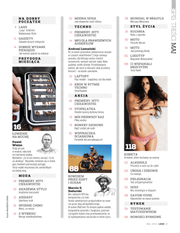 8 LANS „Logo” Arbitrem Najlepszego Stylu 10 GADŻETY Zabawki dużych chłopców 14 DOBRZE WYDANE PIENIĄDZE Jak wybrać aparat na wakacje PRZYGODA MIESIĄCA 112 MODNA SESJA Jak elegancko nosić dżinsy TECHNO 98 MUNDIAL W BRAZYLII Milcząca Maracana STYL ŻYCIA 42 PREMIERY, HITY, CIEKAWOSTKI 26 KUCHNIA Ryba z ogniska 44 MP3 DLA PRAWDZIWYCH AUDIOFILÓW 60 MOTO Porsche Macan Andrzej Lemański Po co komu przenośne odtwarzacze muzyki w czasach smartfonów? Z tego samego powodu, dla którego wolisz chodzić na koncerty zamiast słuchać radia. Małe pudełka, wielki dźwięk. Przedstawiamy patent, jak nosić w kieszeni swój prywatny koncert – na każde zawołanie. SPIS TREŚCI MAJ NA DOBRY POCZĄTEK 64 MOTO Jak powstają škody 102 LOGOTYP Bogusław Wołoszański 108 CI WSPANIALI MĘŻCZYŹNI Tony Hawk 50 LAPTOPY Pięć modeli – znajdziesz coś dla siebie 58 KROK W RYTMIE TECHNO Smartopaski AKCJA 66 PREMIERY, HITY, CIEKAWOSTKI 68 STOPKLATKA Ostatni wyścig Ayrtona Senny 70 MÓJ PIERWSZY RAZ Piłka wodna 16 ŁOWIENIE NA MUCHĘ Paweł Wiejas Stoję po pas w wodzie, ręka boli od machania wędką. Myślałem: „Co to do cholery ma być. Co to za atrakcja”. Wszystko zmieniło się w chwili, gdy złowiłem pierwszego pstrąga. Teraz wędki muchowej nie zamieniłbym na żadną inną. MODA 28 PREMIERY, HITY, CIEKAWOSTKI Rysunki: MAŁGORZATA ŚLIŃSKA 30 AKADEMIA STYLU Anatomia marynarki 32 ADIDASY Sportowy szyk 36 SPODNIE CHINO Wiesz, co nosisz 40 Z WYBIEGU Wersja niskobudżetowa 76 ROWERY SZOSOWE Bądź szybki jak wiatr 82 WSPINACZKA ŚCIANKOWA Poradnik dla początkujących 118 KOBIETA 10 kobiet, które kochamy na wiosnę 88 ROWEREM PRZEZ EGIPT I SUDAN Marcin S. Sadurski Bez żadnych GPS-ów, komputerów czy telefonów satelitarnych przejechałem na rowerze przez dwa afrykańskie kraje. W sumie 2400 km. Po drodze piękne widoki, tysiącletnie piramidy i świątynie, gościnni i przyjaźni ludzie oraz przeświadczenie, że to najwspanialsza wycieczka w moim życiu. 122 ALKOHOLE Procenty w sam raz do rybki 126 URODA I ZDROWIE Co nowego 128 PIELĘGNACJA Test antyperspirantów 132 SEKS Moc drzemiąca w stopach 138 SAVOIR-VIVRE Odpowiedzi na wasze pytania RYNEK 134 TESTOWANIE MATUSZEWSKIM 136 NOWOŚCI RYNKOWE MAJ 2014 LOGO 3