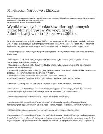 Mniejszości Narodowe i Etniczne Źródło: http://mniejszosci.narodowe.mswia.gov.pl/mne/dotacje/2007/konkursy/6606,Wyniki-otwartych-konkursow-ofert-oglosz onych-przez-Ministra-Spraw-Wewnetrznych-i.html Wygenerowano: Sobota, 4 marca 2017, 14:09 Wyniki otwartych konkursów ofert ogłoszonych przez Ministra Spraw Wewnętrznych i Administracji w dniu 13 czerwca 2007 r. W wyniku ogłoszonych w dniu 13 czerwca 2007 r. — na podstawie art. 13 ust. 1 ustawy z dnia 24 kwietnia 2003 r. o działalności pożytku publicznego i wolontariacie (Dz.U. Nr 96, poz. 873, z późn. zm.) — otwartych konkursów ofert, Minister Spraw Wewnętrznych i Administracji zlecił realizację następujących zadań: 1. Wsparcie projektów kulturalnych służących podtrzymaniu i rozwojowi tożsamości kulturowej mniejszości białoruskiej: - Stowarzyszeniu „Muzeum Małej Ojczyzny w Studziwodach” (tytuł zadania: „Popularyzacja Folkloru Tradycyjnego Białorusinów Podlasia”), - Stowarzyszeniu „Muzeum Małej Ojczyzny w Studziwodach” (tytuł zadania: „Monografia Wieś Reduty i Szerenie we włości orlańskiej”), - Towarzystwu Przyjaciół Ziemi Gródeckiej (tytuł zadania: „Zakup tradycyjnych strojów ludowych dla zespołu propagującego kulturę mniejszości białoruskiej w Polsce”), - Towarzystwu Kultury Białoruskiej (tytuł zadania: „Spotkanie z kolędą”), - Radzie Programowej Tygodnika „NIWA” (tytuł zadania: „Wydanie książki Mucha Cip-Top”), 2. Działalność dziecięcych i młodzieżowych zespołów artystycznych mniejszości białoruskiej: - Stowarzyszeniu na Rzecz Dzieci i Młodzieży Uczących się Języka Białoruskiego „AB-BA” (tytuł zadania: „Studio autentycznego folkloru białoruskiego „Tutaj się urodziłem” („Ja naradziusia tut”), 3. Działalność badawcza na temat kultury i historii mniejszości łemkowskiej: - Łemkowskiemu Zespołowi Pieśni i Tańca „Kyczera” (tytuł zadania: „Działalność pracowni badań łemkoznawczych przy Łemkowskim Zespole Pieśni i Tańca „Kyczera” (biblioteka, archiwum, wystawa)”, 4. Działalność artystyczna zespołów muzycznych i tanecznych mniejszości łemkowskiej: - Łemkowskiemu Zespołowi Pieśni i Tańca „Kyczera” (tytuł zadania: „Działalność artystyczna Łemkowskiego Zespołu Pieśni i Tańca „Kyczera” (opracowywanie programu, uzupełnienie strojów, prowadzenie garderoby, organizacja prób, zgrupowań i koncertów, udział w festiwalach i przeglądach na terenie kraju i zagranicą”), 5. Wsparcie projektów kulturalnych służących podtrzymaniu i rozwojowi tożsamości kulturowej mniejszości niemieckiej: - Domowi Współpracy Polsko-Niemieckiej z siedzibą w Gliwicach, (tytuł zadania: „Joseph von Eichendorff neu lesen/Joseph von Eichendorff na nowo odczytany – konferencja naukowa poświęcona twórczości Josepha von Eichendorffa z okazji 150 rocznicy śmierci górnośląskiego poety”), - Związkowi Niemieckich Stowarzyszeń Społeczno-Kulturalnych w Polsce (tytuł zadania: „Dzień otwartych drzwi mniejszości niemieckiej w Polsce”), - Związkowi Niemieckich Stowarzyszeń Społeczno-Kulturalnych w Polsce (tytuł zadania: „Publikacja – niemieckojęzyczna poezja”), - Związkowi Niemieckich Stowarzyszeń Społeczno-Kulturalnych w Polsce (tytuł zadania: „Publikacja duszpasterstwa grup mniejszościowych Die Heimatkirche”), - Towarzystwu Społeczno-Kulturalnemu Niemców na Śląsku Opolskim (tytuł zadania: „I Warsztaty Recytatorskie dla Nauczycieli”), 6. Zabezpieczenie, inwentaryzacja i konserwacja zabytków kultury mniejszości ormiańskiej w Polsce: - Fundacji Kultury i Dziedzictwa Ormian Polskich (tytuł zadania: „Zabezpieczenie, inwentaryzacja i konserwacja zabytków kultury mniejszości ormiańskiej w Polsce”), 7. Zadanie służące podtrzymaniu i rozwojowi tożsamości kulturowej mniejszości rosyjskiej w Polsce: - Fundacji Miasto (tytuł zadania: „Stworzenie internetowego, powszechnie dostępnego archiwum zbiorów dr hab. Eugeniusza Iwańca-badacza kultury polskich Rosjan – staroobrzędowców”), 8. Propagowanie w nowoczesnej formie dziedzictwa kulturalnego mniejszości żydowskiej w Polsce: - Fundacji SHALOM (tytuł zadania: „Budowa serwisu internetowego Świat kultury i języka jidysz – historia i współczesność”), - Fundacji Ochrony Dziedzictwa Żydowskiego (tytuł zadania: „Rozbudowa portalu internetowego POLIN. Dziedzictwo Polskich Żydów”), 9. Wydanie płyty dla młodzieżowych zespołów muzycznych mniejszości narodowych i etnicznych oraz społeczności posługującej się językiem regionalnym: - Stowarzyszeniu ZIEMIA PUCKA (tytuł zadania: „Produkcja i wydanie kaszubskojęzycznej płyty Wiwat Biesiada”), - Radzie programowej Tygodnika „NIWA” (tytuł zadania: „Wydanie płyty Zespołu Ilo&Friends”). Wstecz Drukuj Generuj PDF Powiadom znajomego