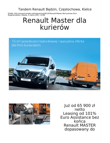 Tandem Renault Będzin, Częstochowa, Kielce Źródło: http://renault-tandem.pl/tre/promocje/9119,Renault-Master-dla-kurierow.html Wygenerowano: Sobota, 4 marca 2017, 14:09 Renault Master dla kurierów Już od 65 900 zł netto Leasing od 101% Euro Assistance bez końca Renault MASTER dopasowany do potrzeb firm kurierskich. Renault MASTER dopasowany do potrzeb firm kurierskich. Renault MASTER – lider niezawodności w rankingu DEKRA. 1. miejsce w swojej klasie*. + • do 15 m3 przestrzeni ładunkowej • praktyczne uchwyty do mocowania ładunku • antypoślizgowa podłoga chroniąca ładunek przed przemieszczaniem • nieskończone możliwości modyfikacji wnętrza Potrzebujesz więcej informacji? Skontaktuj się z nami Będzin Częstochowa Kielce ul. Czeladzka 67 (DK 68 ul. Krótka 16 ul. Transportowców 16 Katowice – Warszawa) 34 366 91 66 41 34 35 700 32 267 27 67 czestochowa@renault-tandem. [email protected] [email protected] pl