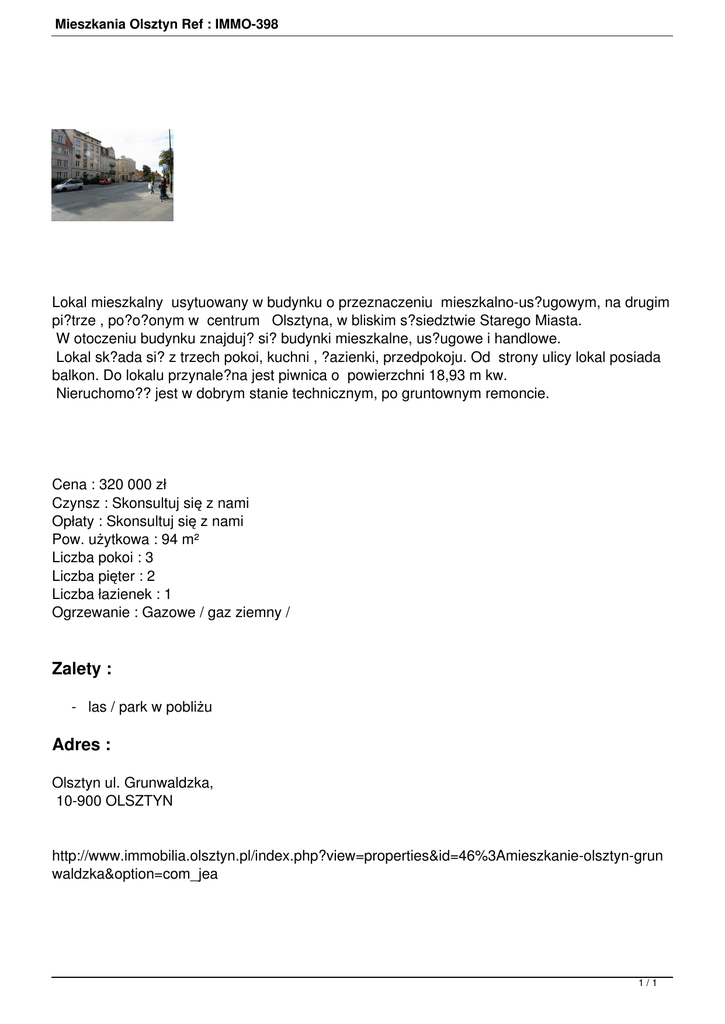Mieszkania Olsztyn Ref : IMMO-398 Lokal mieszkalny usytuowany w budynku o przeznaczeniu mieszkalno-us?ugowym, na drugim pi?trze , po?o?onym w centrum Olsztyna, w bliskim s?siedztwie Starego Miasta. W otoczeniu budynku znajduj? si? budynki mieszkalne, us?ugowe i handlowe. Lokal sk?ada si? z trzech pokoi, kuchni , ?azienki, przedpokoju. Od strony ulicy lokal posiada balkon. Do lokalu przynale?na jest piwnica o powierzchni 18,93 m kw. Nieruchomo?? jest w dobrym stanie technicznym, po gruntownym remoncie. Cena : 320 000 zł Czynsz : Skonsultuj się z nami Opłaty : Skonsultuj się z nami Pow. użytkowa : 94 m² Liczba pokoi : 3 Liczba pięter : 2 Liczba łazienek : 1 Ogrzewanie : Gazowe / gaz ziemny / Zalety : - las / park w pobliżu Adres : Olsztyn ul. Grunwaldzka, 10-900 OLSZTYN http://www.immobilia.olsztyn.pl/index.php?view=properties&id=46%3Amieszkanie-olsztyn-grun waldzka&option=com_jea 1/1