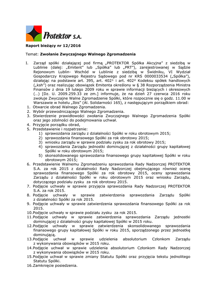 Raport bieżący nr 12/2016 Temat: Zwołanie Zwyczajnego Walnego Zgromadzenia I. Zarząd spółki działającej pod firmą „PROTEKTOR Spółka Akcyjna” z siedzibą w Lublinie (dalej: „Emitent” lub „Spółka” lub „PRT”), zarejestrowanej w Sądzie Rejonowym Lublin- Wschód w Lublinie z siedzibą w Świdniku, VI Wydział Gospodarczy Krajowego Rejestru Sądowego pod nr KRS 0000033534 („Spółka”), działając na podstawie art. 395, art. 402¹ i art. 402² Kodeksu spółek handlowych („ksh”) oraz realizując obowiązek Emitenta określony w § 38 Rozporządzenia Ministra Finansów z dnia 19 lutego 2009 roku w sprawie informacji bieżących i okresowych (…) [Dz. U. 2009.259.33 ze zm.] informuje, że na dzień 27 czerwca 2016 roku zwołuje Zwyczajne Walne Zgromadzenie Spółki, które rozpocznie się o godz. 11.00 w Warszawie w hotelu „Ibis” (Al. Solidarności 165), z następującym porządkiem obrad: 1. Otwarcie obrad Walnego Zgromadzenia. 2. Wybór przewodniczącego Walnego Zgromadzenia. 3. Stwierdzenie prawidłowości zwołania Zwyczajnego Walnego Zgromadzenia Spółki oraz jego zdolności do podejmowania uchwał. 4. Przyjęcie porządku obrad, 5. Przedstawienie i rozpatrzenie: 1) sprawozdania zarządu z działalności Spółki w roku obrotowym 2015; 2) sprawozdania finansowego Spółki za rok obrotowy 2015; 3) wniosku zarządu w sprawie podziału zysku za rok obrotowy 2015; 4) sprawozdania Zarządu jednostki dominującej z działalności grupy kapitałowej Spółki w roku obrotowym 2015; 5) skonsolidowanego sprawozdania finansowego grupy kapitałowej Spółki w roku obrotowym 2015; 6. Przedstawienie Walnemu Zgromadzeniu sprawozdania Rady Nadzorczej PROTEKTOR S.A. za rok 2015 z działalności Rady Nadzorczej obejmującego również ocenę sprawozdania finansowego Spółki za rok obrotowy 2015, oceny sprawozdania Zarządu z działalności Spółki w roku obrotowym 2015 oraz wniosku Zarządu, dotyczącego podziału zysku za rok obrotowy 2015. 7. Podjęcie uchwały w sprawie przyjęcia sprawozdania Rady Nadzorczej PROTEKTOR S.A. za rok 2015. 8. Podjęcie uchwały w sprawie zatwierdzenia sprawozdania Zarządu Spółki z działalności Spółki za rok 2015. 9. Podjęcie uchwały w sprawie zatwierdzenia sprawozdania finansowego Spółki za rok 2015. 10.Podjęcie uchwały w sprawie podziału zysku za rok 2015. 11.Podjęcie uchwały w sprawie zatwierdzenia sprawozdania Zarządu jednostki dominującej z działalności grupy kapitałowej Spółki w 2015 roku. 12.Podjęcie uchwały w sprawie zatwierdzenia skonsolidowanego sprawozdania finansowego grupy kapitałowej Spółki w roku 2015, sporządzonego przez jednostkę dominującą. 13.Podjęcie uchwał w sprawie udzielenia absolutorium Członkom Zarządu z wykonywania obowiązków w 2015 roku. 14.Podjęcie uchwał w sprawie udzielenia absolutorium Członkom Rady Nadzorczej z wykonywania obowiązków w 2015 roku. 15.Podjęcie uchwał w sprawie zmiany Statutu Spółki oraz przyjęcia tekstu jednolitego Statutu Spółki. 16.Zamknięcie posiedzenia. oraz przedstawia w załączeniu treść projektów uchwał, które mają być przedmiotem obrad Zwyczajnego Walnego Zgromadzenia. Ponadto, realizując obowiązek wskazany w § 38 ust. 1 pkt 1), 2), 3) Rozporządzenia Ministra Finansów z dnia 19 lutego 2009 roku w sprawie informacji bieżących i okresowych przekazywanych przez emitentów papierów wartościowych (…) [Dz.U. z 2014 r. poz. 133] w nawiązaniu do pkt 15 ww. porządku obrad Zwyczajnego Walnego Zgromadzenia, Emitent poniżej podaje do publicznej wiadomości obowiązujące postanowienia Statutu Spółki oraz treść proponowanych zmian: 1. Było: § 1.1 „Firma Spółki brzmi: „PROTEKTOR Spółka Akcyjna””. Jest: § 1.1 Firma Spółki brzmi: PROTEKTOR Spółka Akcyjna. 2. Było: § 7 Przedmiotem działalności Spółki jest: 1) Produkcja obuwia (15.20.Z), --------------------------------------------------------------2) Działalność agentów zajmujących się sprzedażą wyrobów tekstylnych, odzieży, wyrobów futrzarskich, obuwia i artykułów skórzanych (46.16.Z), -----------------------3) Sprzedaż detaliczna obuwia i wyrobów skórzanych prowadzona w wyspecjalizowanych sklepach (47.72.Z), ------------------------------------------------------------------------4) Transport drogowy towarów (49.41.Z),---------------------------------------------------5) Magazynowanie i przechowywanie pozostałych towarów (52.10.B), --------------------6) Kupno i sprzedaż nieruchomości na własny rachunek (68.10.Z), -----------------------7) Wynajem i zarządzanie nieruchomościami własnymi lub dzierżawionymi (68.20.Z), --8) Wynajem i dzierżawa pozostałych maszyn, urządzeń oraz dóbr materialnych, gdzie indziej niesklasyfikowane (77.39.Z)”. -----------------------------------------------------9) Wynajem i dzierżawa samochodów osobowych i furgonetek (77.11.Z) -----------------10) Pozostała działalność wspomagająca prowadzenie działalności gospodarczej, gdzie indziej niesklasyfikowana (82.99.Z). ------------------------------------------------------Jest: § 7 „Przedmiotem działalności Spółki jest: 1) Produkcja obuwia (15.20.Z),------------------------------------------------------2) Sprzedaż hurtowa odzieży i obuwia (46.42.Z),-------------------------------------3) Sprzedaż detaliczna obuwia i wyrobów skórzanych prowadzona w wyspecjalizowanych sklepach (47.72.Z),-------------------------------------------------------------------------4) Działalność agentów zajmujących się sprzedażą wyrobów tekstylnych, odzieży, wyrobów futrzarskich, obuwia i artykułów skórzanych (46.16.Z),-----------------------5) Magazynowanie i przechowywanie pozostałych towarów (52.10.B),------------------6) Kupno i sprzedaż nieruchomości na własny rachunek (68.10.Z),---------------------7) Wynajem i zarządzanie nieruchomościami własnymi lub dzierżawionymi (68.20.Z),---8) Wynajem i dzierżawa pozostałyc