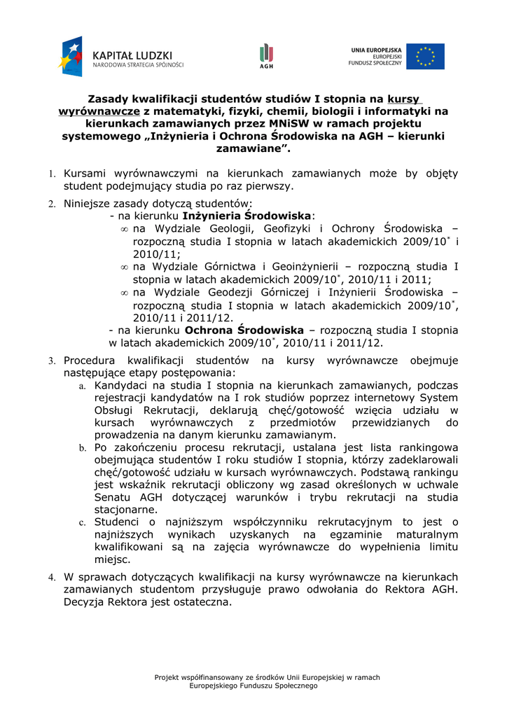 Zasady kwalifikacji studentów studiów I stopnia na kursy wyrównawcze z matematyki, fizyki, chemii, biologii i informatyki na kierunkach zamawianych przez MNiSW w ramach projektu systemowego „Inżynieria i Ochrona Środowiska na AGH – kierunki zamawiane”. 1. Kursami wyrównawczymi na kierunkach zamawianych może by objęty student podejmujący studia po raz pierwszy. 2. Niniejsze zasady dotyczą studentów: - na kierunku Inżynieria Środowiska: • na Wydziale Geologii, Geofizyki i Ochrony Środowiska – rozpoczną studia I stopnia w latach akademickich 2009/10* i 2010/11; • na Wydziale Górnictwa i Geoinżynierii – rozpoczną studia I stopnia w latach akademickich 2009/10*, 2010/11 i 2011; • na Wydziale Geodezji Górniczej i Inżynierii Środowiska – rozpoczną studia I stopnia w latach akademickich 2009/10 *, 2010/11 i 2011/12. - na kierunku Ochrona Środowiska – rozpoczną studia I stopnia w latach akademickich 2009/10*, 2010/11 i 2011/12. 3. Procedura kwalifikacji studentów na kursy wyrównawcze obejmuje następujące etapy postępowania: a. Kandydaci na studia I stopnia na kierunkach zamawianych, podczas rejestracji kandydatów na I rok studiów poprzez internetowy System Obsługi Rekrutacji, deklarują chęć/gotowość wzięcia udziału w kursach wyrównawczych z przedmiotów przewidzianych do prowadzenia na danym kierunku zamawianym. b. Po zakończeniu procesu rekrutacji, ustalana jest lista rankingowa obejmująca studentów I roku studiów I stopnia, którzy zadeklarowali chęć/gotowość udziału w kursach wyrównawczych. Podstawą rankingu jest wskaźnik rekrutacji obliczony wg zasad określonych w uchwale Senatu AGH dotyczącej warunków i trybu rekrutacji na studia stacjonarne. c. Studenci o najniższym współczynniku rekrutacyjnym to jest o najniższych wynikach uzyskanych na egzaminie maturalnym kwalifikowani są na zajęcia wyrównawcze do wypełnienia limitu miejsc. 4. W sprawach dotyczących kwalifikacji na kursy wyrównawcze na kierunkach zamawianych studentom przysługuje prawo odwołania do Rektora AGH. Decyzja Rektora jest ostateczna. Projekt współfinansowany ze środków Unii Europejskiej w ramach Europejskiego Funduszu Społecznego * Kandydatów na studia w roku 2009/10 nie dotyczyła deklaracja poprzez internetowy System Obsługi Rekrutacji. Projekt współfinansowany ze środków Unii Europejskiej w ramach Europejskiego Funduszu Społecznego