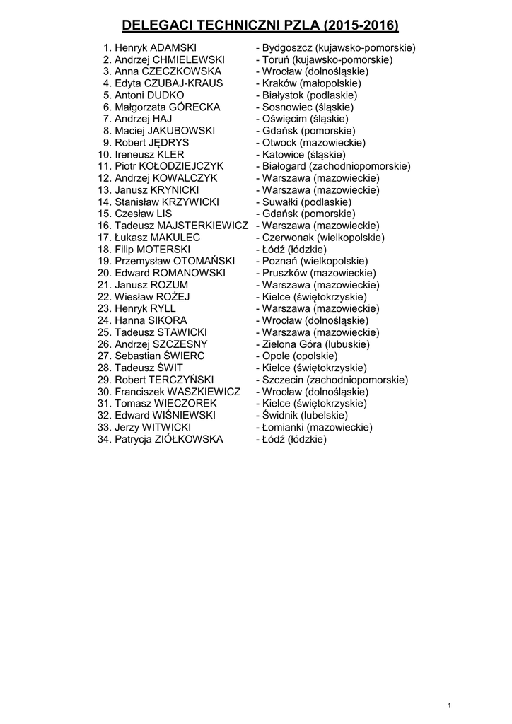 DELEGACI TECHNICZNI PZLA (2015-2016) 1. Henryk ADAMSKI 2. Andrzej CHMIELEWSKI 3. Anna CZECZKOWSKA 4. Edyta CZUBAJ-KRAUS 5. Antoni DUDKO 6. Małgorzata GÓRECKA 7. Andrzej HAJ 8. Maciej JAKUBOWSKI 9. Robert JĘDRYS 10. Ireneusz KLER 11. Piotr KOŁODZIEJCZYK 12. Andrzej KOWALCZYK 13. Janusz KRYNICKI 14. Stanisław KRZYWICKI 15. Czesław LIS 16. Tadeusz MAJSTERKIEWICZ 17. Łukasz MAKULEC 18. Filip MOTERSKI 19. Przemysław OTOMAŃSKI 20. Edward ROMANOWSKI 21. Janusz ROZUM 22. Wiesław ROŻEJ 23. Henryk RYLL 24. Hanna SIKORA 25. Tadeusz STAWICKI 26. Andrzej SZCZESNY 27. Sebastian ŚWIERC 28. Tadeusz ŚWIT 29. Robert TERCZYŃSKI 30. Franciszek WASZKIEWICZ 31. Tomasz WIECZOREK 32. Edward WIŚNIEWSKI 33. Jerzy WITWICKI 34. Patrycja ZIÓŁKOWSKA - Bydgoszcz (kujawsko-pomorskie) - Toruń (kujawsko-pomorskie) - Wrocław (dolnośląskie) - Kraków (małopolskie) - Białystok (podlaskie) - Sosnowiec (śląskie) - Oświęcim (śląskie) - Gdańsk (pomorskie) - Otwock (mazowieckie) - Katowice (śląskie) - Białogard (zachodniopomorskie) - Warszawa (mazowieckie) - Warszawa (mazowieckie) - Suwałki (podlaskie) - Gdańsk (pomorskie) - Warszawa (mazowieckie) - Czerwonak (wielkopolskie) - Łódź (łódzkie) - Poznań (wielkopolskie) - Pruszków (mazowieckie) - Warszawa (mazowieckie) - Kielce (świętokrzyskie) - Warszawa (mazowieckie) - Wrocław (dolnośląskie) - Warszawa (mazowieckie) - Zielona Góra (lubuskie) - Opole (opolskie) - Kielce (świętokrzyskie) - Szczecin (zachodniopomorskie) - Wrocław (dolnośląskie) - Kielce (świętokrzyskie) - Świdnik (lubelskie) - Łomianki (mazowieckie) - Łódź (łódzkie) 1