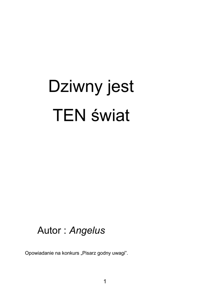 Dziwny jest TEN świat Autor : Angelus Opowiadanie na konkurs „Pisarz godny uwagi”. 1 Ależ TEN świat jest dziwny! Gdyby nie obietnica, już dawno bym się z nim pożegnał. Jednak wciąż miałem w uszach jej słowa: „Musisz zobaczyć prawdziwą polską jesień”! Przez to jej ględzenie jestem właśnie tutaj, a przecież normalnie byłbym w mojej ukochanej knajpce na Marsie. Przez jej głupi pomysł spędzam wakacje nie na tej planecie co trzeba. No właśnie – wszystko przez nią! Jakby nie było, nie mógłbym odmówić swojej ukochanej babci. Za dużo dla mnie zrobiła, bym teraz nie okazywał jej należytego szacunku. Nie ma na to rady – babcia każe, wnuczek spełnia. Chciała, bym zobaczył jej czasy, to się zgodziłem. Chociaż jak dla mnie to nie miałem niczego do oglądania. Ludzie, zwierzęta, rośliny, budowle, a nawet niebo jest dla mnie kompletnie obce w TYM świecie. Spojrzałem przelotnie na pogniecioną kartkę, na której miałem wypisaną listę punktów i podpunktów. Spędziłem tutaj tak dużo czasu, że trochę się moich uwag nazbierało. Westchnąłem ociężale. Minęło zaledwie kilka dni, a już czułem się zmęczony powierzonym mi zadaniem. W takich momentach najchętniej położyłbym się na moim szczycie Śnieżki – prezencie od babci - i liczyłbym własnoręcznie wykonane fioletowe chmurki. Kiedyś to ona mi je wytwarzała, ale siłą rzeczy sam musiałem się tego nauczyć. Ta zabawa od dziecka mnie uspokajała. Jednakże w TYM świecie jest to niemożliwe! Cofnąłem się w czasie zaledwie o sto lat, a tu proszę - ludzie nie potrafią kontrolować pogody! I ten właśnie zgryz znalazł się na zaszczytnym pierwszym miejscu mojej listy zdziwień. Nigdy, ale to przenigdy, nie będę mógł się nadziwić, dlaczego ludzie lubią, gdy zaskakują ich nagłe opady deszczu, mroźne wichury, albo nawet nagłe skoki temperatury. Ja natychmiast włączyłbym kontrolera nieba i po sprawie. Kto to słyszał, że w momencie, kiedy chciałbyś pojechać nad morze się opalać, padał śnieg? 2 Jakiś absurd! Gdybym zaraz po powrocie do moich „normalnych” czasów, nie dostał od babci nowej rakiety kosmicznej ŻuRoXY, w życiu nie spędziłbym w tych męczarniach ani minuty dłużej! Dzięki mojemu przyszłemu prezencikowi, jakimś cudem wytrzymuję tą „piękną, polską jesień XXI wieku” już czwarty dzień. Niejednokrotnie przez moje wzburzenia o mały włos nie wpadłbym na znany mi już znak. Na szczęście nie musiałem przybijać czoła Żurominowi – jak było napisane na owej tabliczce. Na widok tego miasta na nowo powróciły do mych myśli bluźniercze słowa. Specjalnie poszedłem na pobliskie pola, byle tylko nie móc oglądać swoistego rodzaju śmietniska. - Czy Ci ludzie nie znają prawa? – wysyczałem gniewnie. – Raz, dwa, trzy, wdech! – By się uspokoić, zaczerpnąłem świeżego, jakże zimnego powietrza. Dlaczego byłem tak zdziwiony? Przecież babcia wspominała mi kiedyś, że w XXI wszyscy ludzie budowali na stałe budynki. W tych czasach pewnie nikt nie przypuszcza, iż za sto lat, coś takiego będzie zakazane. Nawiasem mówiąc, uważam, że noszenie przy sobie zminiaturyzowanego domu jest bardziej komfortowe, aniżeli budowanie tych prawdziwych. Niechętnie wszedłem na teren miasta. Z dwojga złego wolę patrzeć na karygodne miasto, niż na coś, co ludzie nazywają Matką Naturą. Na myśli przychodzi mi tylko jedno pytanie – po co komu jakaś tam przyroda? Wszędzie widać ten nieciekawy kolor zieleni, pachnie jakąś obcą mi wonią, a w dodatku mieszkają tam zapchlone zwierząt. Czy nie lepiej zastąpić to szarością, przecież jest to bardziej uniwersalny kolor? Czy nie lepiej, by wszędzie dymił się zapach chemicznego powietrza? Przecież za niecały wiek najlepsi specjaliści z prezydentem na czele powiedzą, że jest to zdrowsze dla organizmu niż prawdziwy tlen. 3 Wzdrygnąłem się na wspomnienie mojej babuni, która, po emisji ogłaszającej tą wiadomość, była wściekła, co jest dla niej rzadkością. Do dziś nie mogę pojąć jej zachowania. Sam zgadzam się w stu procentach z politykami, żyjącymi w moich czasach. Dzięki ich zabiegom nie będzie w XXII wieku najmniejszego robactwa. Na całe szczęście wytępią wszystkie niepotrzebne owady, gdyż w TYM świecie jest ich aż za dużo. Gdzie nie spojrzeć, tam pełno zwierząt! Mogę już tylko odetchnąć z ulgą, że za sto lat władze zniszczą im domy – lasy, łąki, pola i gdzie one tam jeszcze się chowają. Dzięki takiemu myśleniu, przyglądałem się przydrożnym drzewom z miłą satysfakcją, niemalże podgwizdując. Nie będzie już ich za kilkanaście lat! Przejrzałem ponownie listę. Wykreśliłem na niej kolejno: budynki, rośliny, zwierzęta. Jedyne co zostało mi do omówienia to tutejsi ludzie i mogę spokojnie wracać do domu. I w tym momencie miałem problem. Co powinienem powiedzieć mojej babci o mieszkańcach Żuromina? Przez te kilka dni przyglądałem się im pogardliwie, a najchętniej odwracałem od nich wzrok. Żurominianie są o niebo dziwniejsi od dotąd znanych mi ludzi. Dlaczego ludzie nie chodzą w maskach tlenowych? Dlaczego ja w nich nie muszę teraz chodzić? Czemu żurominianie są zawsze uśmiechnięci, choć jest zimno? Czemu witają się ze sobą grzecznie – młodszy ze starszym, mężczyzna z kobietą? Nie jestem w stanie tego pojąć. Zazgrzytałem zębami i, choć niechętnie, napisałem te spostrzeżenia na kartce. Może jednak politycy przyszłości niepotrzebnie wycinali te wszystkie lasy? Jakby nie było, tlen jest potrzebny, by… Pokręciłem natychmiast głową. 4 - Nie daj się zwariować! – rozkazałem sobie. - Babcia nie mogła mieć racji…! – Ugryzłem się w język. Rozejrzałem się uważnie, czy aby nikt mnie nie usłyszał. To kogo zobaczyłem, wręcz mną wstrząsnęło. Nie powinno mnie to, aż tak zadziwić, ale jednak tak się stało. Przed przejściem d