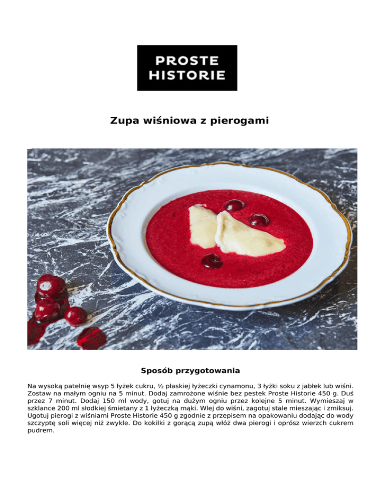 Zupa wiśniowa z pierogami Sposób przygotowania Na wysoką patelnię wsyp 5 łyżek cukru, ½ płaskiej łyżeczki cynamonu, 3 łyżki soku z jabłek lub wiśni. Zostaw na małym ogniu na 5 minut. Dodaj zamrożone wiśnie bez pestek Proste Historie 450 g. Duś przez 7 minut. Dodaj 150 ml wody, gotuj na dużym ogniu przez kolejne 5 minut. Wymieszaj w szklance 200 ml słodkiej śmietany z 1 łyżeczką mąki. Wlej do wiśni, zagotuj stale mieszając i zmiksuj. Ugotuj pierogi z wiśniami Proste Historie 450 g zgodnie z przepisem na opakowaniu dodając do wody szczyptę soli więcej niż zwykle. Do kokilki z gorącą zupą włóż dwa pierogi i oprósz wierzch cukrem pudrem. Zastosowany produkt PIEROGI z wiśniami Powered by TCPDF (www.tcpdf.org)