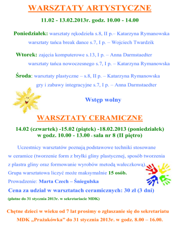 WARSZTATY ARTYSTYCZNE 11.02 - 13.02.2013r. godz. 10.00 - 14.00 Poniedziałek: warsztaty rękodzieła s.8, II p.– Katarzyna Rymanowska warsztaty tańca break dance s.7, I p. – Wojciech Twardzik Wtorek: zajęcia komputerowe s.13, I p. – Anna Darmstaedter warsztaty tańca nowoczesnego s.7, I p. – Katarzyna Rymanowska Środa: warsztaty plastyczne – s.8, II p. – Katarzyna Rymanowska gry i zabawy integracyjne s.7, I p. – Anna Darmstaedter Wstęp wolny WARSZTATY CERAMICZNE 14.02 (czwartek) -15.02 (piątek) -18.02.2013 (poniedziałek) w godz. 10.00 - 13.00 - sala nr 8 (II piętro) Uczestnicy warsztatów poznają podstawowe techniki stosowane w ceramice (tworzenie form z bryłki gliny plastycznej, sposób tworzenia z plastra gliny oraz formowanie wyrobów metodą wałeczkową). Grupa warsztatowa liczyć może maksymalnie 15 osób. Prowadzenie: Marta Czech – Śniegulska Cena za udział w warsztatach ceramicznych: 30 zł (3 dni) (płatne do 31 stycznia 2013r. w sekretariacie MDK) Chętne dzieci w wieku od 7 lat prosimy o zgłaszanie się do sekretariatu MDK „Prażakówka” do 31 stycznia 2013r. w godz. 8.00 – 16.00. WARSZTATY CYRKOWE 19.02 (wtorek) - 20.02 (środa) – 21.02 (czwartek) w godz. 10.00 - 13.00 - sala widowiskowa Na trzydniowych warsztatach cyrkowych dzieci będą miały okazję poznać tajniki żonglerki, nauczą się wykonania sztuczki nie-magicznej, poznają pierwsze rekwizyty cyrkowe. To wszystko przy dobrej muzyce i w radosnej atmosferze. Zajęcia cyrkowe są niezwykle przyjemnym dla dzieci sposobem wspierania ich całościowego rozwoju. W ramach warsztatów uczestnicy opanują żonglerkę technikami: poi, flowerstick, talerze. Grupa warsztatowa liczyć może maksymalnie 15 osób. Prowadzenie: Sławomira Kalisz Cena za udział w warsztatach cyrkowych: 35 zł (3 dni) (płatne do 31 stycznia 2013r. w sekretariacie MDK) WARSZTATY ARTYSTYCZNE 22.02.2013r. godz. 10.00 – 14.00 Piątek: warsztaty rękodzieła s.8, II p. – Katarzyna Rymanowska warsztaty tańca nowoczesnego s. 7, I p. – Anna Darmstaedter Wstęp wolny Chętne dzieci w wieku od 7 lat prosimy o zgłaszanie się do sekretariatu MDK „Prażakówka” do 31 stycznia 2013r. w godz. 8.00 – 16.00.