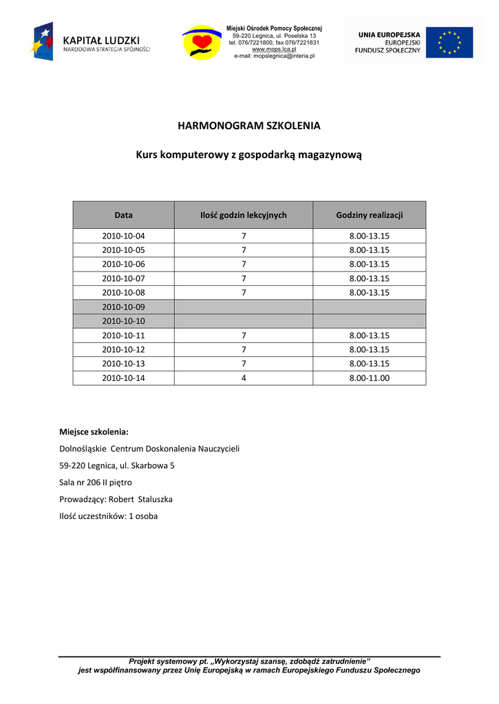 Miejski Ośrodek Pomocy Społecznej 59-220 Legnica, ul. Poselska 13 tel. 076/7221800, fax 076/7221831 www.mops.lca.pl e-mail: [email protected] HARMONOGRAM SZKOLENIA Kurs komputerowy z gospodarką magazynową Data Ilość godzin lekcyjnych Godziny realizacji 2010-10-04 7 8.00-13.15 2010-10-05 7 8.00-13.15 2010-10-06 7 8.00-13.15 2010-10-07 7 8.00-13.15 2010-10-08 7 8.00-13.15 2010-10-11 7 8.00-13.15 2010-10-12 7 8.00-13.15 2010-10-13 7 8.00-13.15 2010-10-14 4 8.00-11.00 2010-10-09 2010-10-10 Miejsce szkolenia: Dolnośląskie Centrum Doskonalenia Nauczycieli 59-220 Legnica, ul. Skarbowa 5 Sala nr 206 II piętro Prowadzący: Robert Staluszka Ilośd uczestników: 1 osoba Projekt systemowy pt. „Wykorzystaj szansę, zdobądź zatrudnienie” jest współfinansowany przez Unię Europejską w ramach Europejskiego Funduszu Społecznego