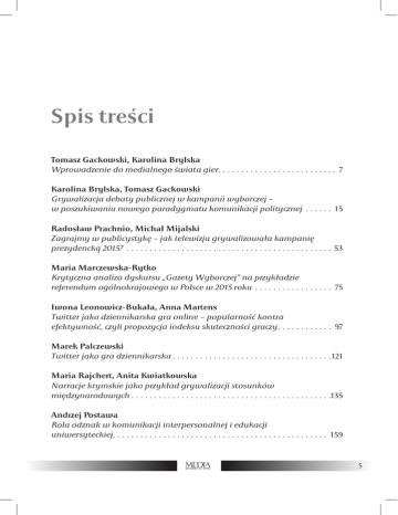 Spis treści Tomasz Gackowski, Karolina Brylska Wprowadzenie do medialnego świata gier. . . . . . . . . . . . . . . . . . . . . . . . . . 7 Karolina Brylska, Tomasz Gackowski Grywalizacja debaty publicznej w kampanii wyborczej – w poszukiwaniu nowego paradygmatu komunikacji politycznej . . . . . . 15 Radosław Prachnio, Michał Mijalski Zagrajmy w publicystykę – jak telewizja grywalizowała kampanię prezydencką 2015? . . . . . . . . . . . . . . . . . . . . . . . . . . . . . . . . . . . . . . . . . . . . . 53 Maria Marczewska-Rytko Krytyczna analiza dyskursu „Gazety Wyborczej” na przykładzie referendum ogólnokrajowego w Polsce w 2015 roku . . . . . . . . . . . . . . . . . 75 Iwona Leonowicz-Bukała, Anna Martens Twitter jako dziennikarska gra online – popularność kontra efektywność, czyli propozycja indeksu skuteczności graczy . . . . . . . . . . . . 97 Marek Palczewski Twitter jako gra dziennikarska . . . . . . . . . . . . . . . . . . . . . . . . . . . . . . . . . . . 121 Maria Rajchert, Anita Kwiatkowska Narracje krymskie jako przykład grywalizacji stosunków międzynarodowych . . . . . . . . . . . . . . . . . . . . . . . . . . . . . . . . . . . . . . . . . . . .135 Andrzej Postawa Rola odznak w komunikacji interpersonalnej i edukacji uniwersyteckiej. . . . . . . . . . . . . . . . . . . . . . . . . . . . . . . . . . . . . . . . . . . . . . . 159 5 Spis treści Patryk Gałuszka Platforma crowdfundingowa: między altruizmem a grą inwestycyjną . . .175 Marcin Łączyński Komentarze czytelników jako forma informacji zwrotnej dla dziennikarza – analiza reakcji czytelników na artykuły w portalach internetowych . . . . . . . . . . . . . . . . . . . . . . . . . . . . . . . . . . . . . .191 Notki o autorach . . . . . . . . . . . . . . . . . . . . . . . . . . . . . . . . . . . . . . . . . . . . . 205 Indeks osób . . . . . . . . . . . . . . . . . . . . . . . . . . . . . . . . . . . . . . . . . . . . . . . . . 209 6