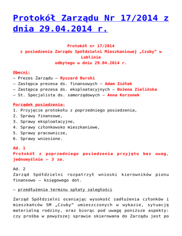 Protokół Zarządu Nr 17/2014 z dnia 29.04.2014 r.