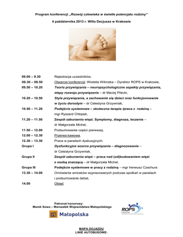 Program konferencji „Rozwój człowieka w świetle potencjału rodziny” 4 października 2013 r. Willa Decjusza w Krakowie 09.00 – 9.30 Rejestracja uczestników, 09.30 – 09.50 Otwarcie konferencji: Wioletta Wilimska – Dyrektor ROPS w Krakowie, 09.50 – 10.20 Teoria przywiązania – neuropsychologiczne aspekty przywiązania, etapy rozwoju przywiązania – dr Maciej Pilecki, 10.20 – 10.50 Style przywiązania, a zachowanie się dzieci oraz funkcjonowanie w życiu dorosłym – dr Celestyna Grzywniak, 10.50 – 11.20 Podejście systemowe – skuteczna terapia /praca z rodziną – mgr Ryszard Chłopek, 11.20 – 11.50 Zespół zaburzenia więzi. Symptomy, diagnoza, leczenie – dr Małgorzata Michel, 11.50 – 12.00 Podsumowanie części pierwszej, 12.00 – 12.30 Przerwa kawowa, 12.30 – 13.30 Praca w panelach dyskusyjnych: Grupa I Dysfunkcyjne wzorce przywiązania – diagnozowanie – dr Celestyna Grzywniak, Grupa II Zespół zaburzenia więzi – praca nad (od)budowaniem więzi z osobą znaczącą – dr Małgorzata Michel, Grupa III Podejście systemowe w pracy z rodziną – mgr Ireneusz Czachura 13.30 – 14.00 Omówienie wniosków wypracowanych podczas spotkań w panelach i podsumowanie debat, 14.00 Obiad. Patronat honorowy: Marek Sowa – Marszałek Województwa Małopolskiego MAPA DOJAZDU LINIE AUTOBUSOWE: z przystanku Dworzec Główny ul. Lubicz – linia 152 (kierunek Olszanica) z przystanku Dworzec Główny Wschód (przy dworcu autobusowym) linia 292 (kierunek Kraków Airport T1)– należy wysiąść na przystanku SIELANKA DOJŚCIE Z PRZYSTANKU SIELANKA DO WILLI DECJUSZA – ul. 28 lipca 1943 r., 17a (5 minut)