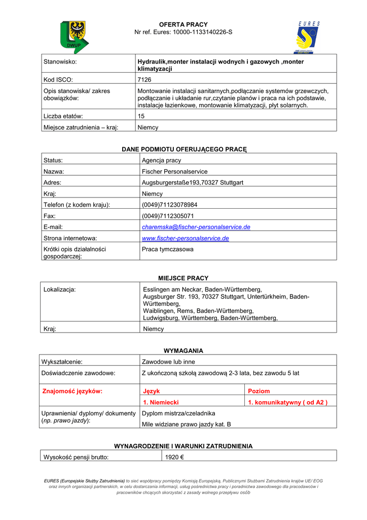 OFERTA PRACY Nr ref. Eures: 10000-1133140226-S Stanowisko: Hydraulik,monter instalacji wodnych i gazowych ,monter klimatyzacji Kod ISCO: 7126 Opis stanowiska/ zakres obowiązków: Montowanie instalacji sanitarnych,podłączanie systemów grzewczych, podłączanie i układanie rur,czytanie planów i praca na ich podstawie, instalacje łazienkowe, montowanie klimatyzacji, płyt solarnych. Liczba etatów: 15 Miejsce zatrudnienia – kraj: Niemcy DANE PODMIOTU OFERUJĄCEGO PRACĘ Status: Agencja pracy Nazwa: Fischer Personalservice Adres: Augsburgerstaße193,70327 Stuttgart Kraj: Niemcy Telefon (z kodem kraju): (0049)71123078984 Fax: (0049)7112305071 E-mail: [email protected] Strona internetowa: www.fischer-personalservice.de Krótki opis działalności gospodarczej: Praca tymczasowa MIEJSCE PRACY Lokalizacja: Esslingen am Neckar, Baden-Württemberg, Augsburger Str. 193, 70327 Stuttgart, Untertürkheim, BadenWürttemberg, Waiblingen, Rems, Baden-Württemberg, Ludwigsburg, Württemberg, Baden-Württemberg, Kraj: Niemcy WYMAGANIA Wykształcenie: Zawodowe lub inne Doświadczenie zawodowe: Z ukończoną szkołą zawodową 2-3 lata, bez zawodu 5 lat Znajomość języków: Język Poziom 1. Niemiecki 1. komunikatywny ( od A2 ) Uprawnienia/ dyplomy/ dokumenty (np. prawo jazdy): Dyplom mistrza/czeladnika Mile widziane prawo jazdy kat. B WYNAGRODZENIE I WARUNKI ZATRUDNIENIA Wysokość pensji brutto: 1920 € EURES (Europejskie Służby Zatrudnienia) to sieć współpracy pomiędzy Komisją Europejską, Publicznymi Służbami Zatrudnienia krajów UE/ EOG oraz innych organizacji partnerskich, w celu dostarczania informacji, usług pośrednictwa pracy i poradnictwa zawodowego dla pracodawców i pracowników chcących skorzystać z zasady wolnego przepływu osób Wysokość pensji netto: 1470,29 € Waluta, w jakiej wypłacana jest pensja: Euro (€) Rodzaj stawki wynagrodzenia: miesięczna Dodatkowe świadczenia - darmowe zakwaterowanie, - w każdy piątek grill w siedzibie firmy, - opieka polskiego koordynatora, - dodatki na dojazdy, - premia świąteczna, premia na urlop (po przepracowanym roku). Nazwa firmy, z którą zostanie podpisana umowa: Fischer Personalservice GmbH Rodzaj umowy: Umowa o prace Wymiar czasu pracy: Pełen etat Czas trwania umowy: Określony z możliwością przedłużenia Liczba godzin tygodniowo: 40 (+ mozliwe nadgodziny) Zmiany i praca w dni wolne: Pierwsza Data rozpoczęcia: Od zaraz Data wygaśnięcia umowy (w przypadku umowy na czas określony): 18.12.2015 SPOSÓB SKŁADANIA WNIOSKU Wymagane dokumenty: CV, dyplomy, certyfikaty (jeśli są) Język, w którym muszą być sporządzone przedkładane dokumenty: Polski Do kogo należy wysłać dokumenty: Do doradcy Eures z dopiskiem ‘Hydraulik, monter instalacji wodnych i gazowych, monter klimatyzacji – Fischer Personalservice’ Gdzie należy wysłać dokumenty: [email protected] Dane teleadresowe doradcy EURES lub przedstawiciela pracodawcy: Pani Anna Uznańska 71 39 74 310 WAŻNOŚĆ Data publikacji: 08.10.2015r. korekta 10.12.15 Termin przedkładania podań o pracę / zakończenia ważności oferty: Do odwołania Agencja pracy tymczasowej Fischer Personalservice oświadczyła, że prowadzi działalność zgodnie z przepisami obowiązującymi na terenie Niemiec. Uprzejmie informujemy, że skontaktujemy się wyłącznie z wybranymi kandydatami. UWAGA: EURES (Europejskie Służby Zatrudnienia) to sieć współpracy pomiędzy Komisją Europejską, Publicznymi Służbami Zatrudnienia krajów UE/ EOG oraz innych organizacji partnerskich, w celu dostarczania informacji, usług pośrednictwa pracy i poradnictwa zawodowego dla pracodawców i pracowników chcących skorzystać z zasady wolnego przepływu osób 1. Umowa z zagranicznym pracodawcą zostanie zawarta zgodnie z prawem kraju zatrudnienia. Oznacza to, że wszystkie roszczenia odnośnie do warunków, które obejmuje umowa, można kierować wyłącznie do odpowiedniego sądu w kraju zatrudnienia. Publiczne służby zatrudnienia (EURES) nie mogą pośredniczyć ani reprezentować pracownika w sądzie kraju zatrudnienia w przypadku sporu z pracodawcą. 2. Publiczne służby zatrudnienia (EURES) dokładają wszelkich starań, aby zapewnić rzetelność i wiarygodność ofert pracy zgłoszonych w lokalnym urzędzie pracy. Należy wyjaśnić, że oferta pracy została zgłoszona przez stronę trzecią i EURES nie odpowiada za ewentualne rozbieżności między warunkami pracy określonymi w ofercie pracy i warunkami oferowanymi przez potencjalnego pracodawcę. 3. Publiczne służby zatrudnienia (EURES) informują, że będą zbierać, przetwarzać i przekazywać potencjalnym pracodawcom zgodnie z przepisami dotyczącymi ochrony danych osobowych wszystkie dane osobowe dostarczone przez osoby poszukujące pracy. EURES (Europejskie Służby Zatrudnienia) to sieć współpracy pomiędzy Komisją Europejską, Publicznymi Służbami Zatrudnienia krajów UE/ EOG oraz innych organizacji partnerskich, w celu dostarczania informacji, usług pośrednictwa pracy i poradnictwa zawodowego dla pracodawców i pracowników chcących skorzystać z zasady wolnego przepływu osób
