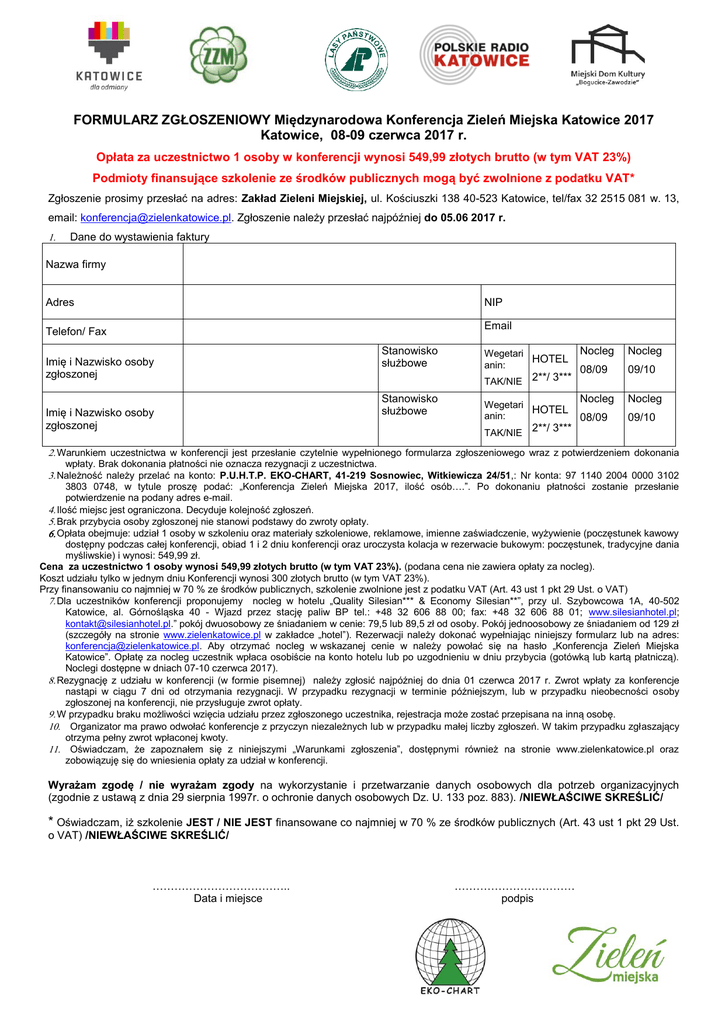 FORMULARZ ZGŁOSZENIOWY Międzynarodowa Konferencja Zieleń Miejska Katowice 2017 Katowice, 08-09 czerwca 2017 r. Opłata za uczestnictwo 1 osoby w konferencji wynosi 549,99 złotych brutto (w tym VAT 23%) Podmioty finansujące szkolenie ze środków publicznych mogą być zwolnione z podatku VAT* Zgłoszenie prosimy przesłać na adres: Zakład Zieleni Miejskiej, ul. Kościuszki 138 40-523 Katowice, tel/fax 32 2515 081 w. 13, email: [email protected]. Zgłoszenie należy przesłać najpóźniej do 05.06 2017 r. Dane do wystawienia faktury Nazwa firmy Adres NIP Email Telefon/ Fax Imię i Nazwisko osoby zgłoszonej Imię i Nazwisko osoby zgłoszonej Stanowisko służbowe Wegetari HOTEL anin: TAK/NIE Stanowisko służbowe 2**/ 3*** Wegetari HOTEL anin: TAK/NIE Nocleg Nocleg 08/09 09/10 Nocleg Nocleg 08/09 09/10 2**/ 3*** Warunkiem uczestnictwa w konferencji jest przesłanie czytelnie wypełnionego formularza zgłoszeniowego wraz z potwierdzeniem dokonania wpłaty. Brak dokonania płatności nie oznacza rezygnacji z uczestnictwa. Należność należy przelać na konto: P.U.H.T.P. EKO-CHART, 41-219 Sosnowiec, Witkiewicza 24/51,: Nr konta: 97 1140 2004 0000 3102 3803 0748, w tytule proszę podać: „Konferencja Zieleń Miejska 2017, ilość osób….”. Po dokonaniu płatności zostanie przesłanie potwierdzenie na podany adres e-mail. Ilość miejsc jest ograniczona. Decyduje kolejność zgłoszeń. Brak przybycia osoby zgłoszonej nie stanowi podstawy do zwroty opłaty. Opłata obejmuje: udział 1 osoby w szkoleniu oraz materiały szkoleniowe, reklamowe, imienne zaświadczenie, wyżywienie (poczęstunek kawowy dostępny podczas całej konferencji, obiad 1 i 2 dniu konferencji oraz uroczysta kolacja w rezerwacie bukowym: poczęstunek, tradycyjne dania myśliwskie) i wynosi: 549,99 zł. Cena za uczestnictwo 1 osoby wynosi 549,99 złotych brutto (w tym VAT 23%). (podana cena nie zawiera opłaty za nocleg). Koszt udziału tylko w jednym dniu Konferencji wynosi 300 złotych brutto (w tym VAT 23%). Przy finansowaniu co najmniej w 70 % ze środków publicznych, szkolenie zwolnione jest z podatku VAT (Art. 43 ust 1 pkt 29 Ust. o VAT) Dla uczestników konferencji proponujemy nocleg w hotelu „Quality Silesian*** & Economy Silesian**”, przy ul. Szybowcowa 1A, 40-502 Katowice, al. Górnośląska 40 - Wjazd przez stację paliw BP tel.: +48 32 606 88 00; fax: +48 32 606 88 01; www.silesianhotel.pl; [email protected].” pokój dwuosobowy ze śniadaniem w cenie: 79,5 lub 89,5 zł od osoby. Pokój jednoosobowy ze śniadaniem od 129 zł (szczegóły na stronie www.zielenkatowice.pl w zakładce „hotel”). Rezerwacji należy dokonać wypełniając niniejszy formularz lub na adres: [email protected]. Aby otrzymać nocleg w wskazanej cenie w należy powołać się na hasło „Konferencja Zieleń Miejska Katowice”. Opłatę za nocleg uczestnik wpłaca osobiście na konto hotelu lub po uzgodnieniu w dniu przybycia (gotówką lub kartą płatniczą). Noclegi dostępne w dniach 07-10 czerwca 2017). Rezygnację z udziału w konferencji (w formie pisemnej) należy zgłosić najpóźniej do dnia 01 czerwca 2017 r. Zwrot wpłaty za konferencje nastąpi w ciągu 7 dni od otrzymania rezygnacji. W przypadku rezygnacji w terminie późniejszym, lub w przypadku nieobecności osoby zgłoszonej na konferencji, nie przysługuje zwrot opłaty. W przypadku braku możliwości wzięcia udziału przez zgłoszonego uczestnika, rejestracja może zostać przepisana na inną osobę. Organizator ma prawo odwołać konferencje z przyczyn niezależnych lub w przypadku małej liczby zgłoszeń. W takim przypadku zgłaszający otrzyma pełny zwrot wpłaconej kwoty. Oświadczam, że zapoznałem się z niniejszymi „Warunkami zgłoszenia”, dostępnymi również na stronie www.zielenkatowice.pl oraz zobowiązuję się do wniesienia opłaty za udział w konferencji. Wyrażam zgodę / nie wyrażam zgody na wykorzystanie i przetwarzanie danych osobowych dla potrzeb organizacyjnych (zgodnie z ustawą z dnia 29 sierpnia 1997r. o ochronie danych osobowych Dz. U. 133 poz. 883). /NIEWŁAŚCIWE SKREŚLIĆ/ * Oświadczam, iż szkolenie JEST / NIE JEST finansowane co najmniej w 70 % ze środków publicznych (Art. 43 ust 1 pkt 29 Ust. o VAT) /NIEWŁAŚCIWE SKREŚLIĆ/ ……………………………….. Data i miejsce …………………………… podpis