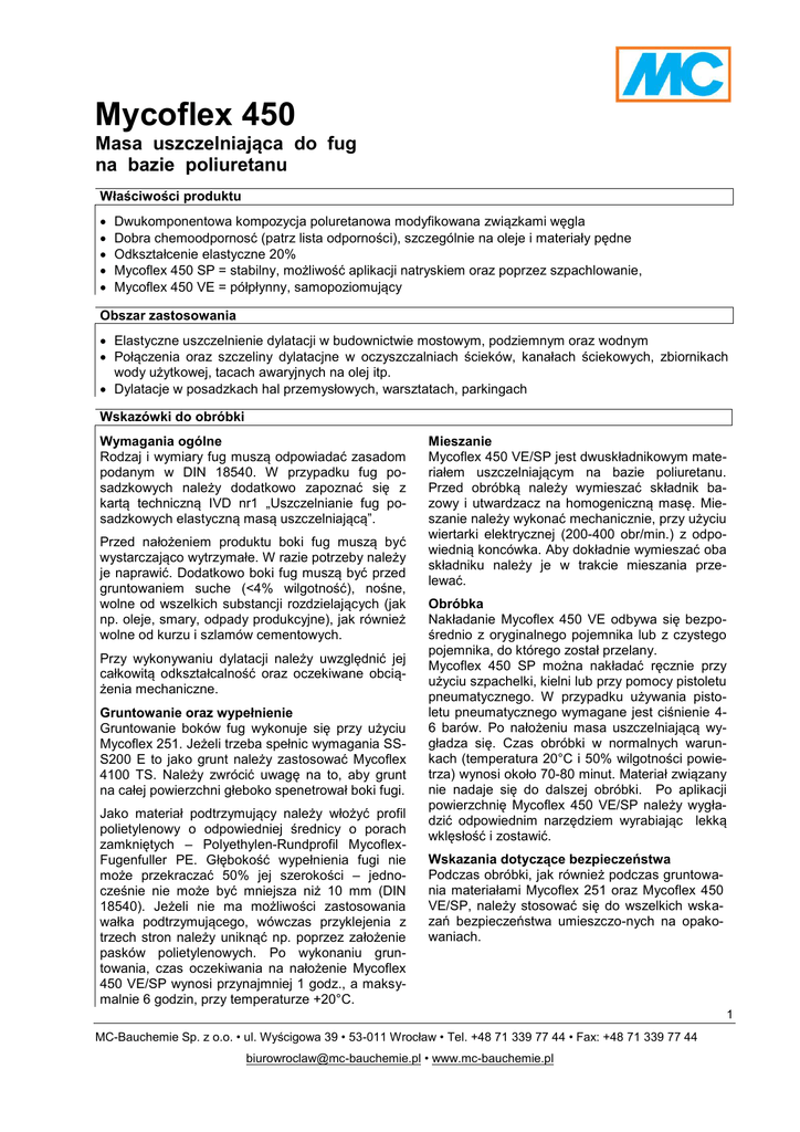 Mycoflex 450 Masa uszczelniająca do fug na bazie poliuretanu Właściwości produktu Dwukomponentowa kompozycja poluretanowa modyfikowana związkami węgla Dobra chemoodpornosć (patrz lista odporności), szczególnie na oleje i materiały pędne Odkształcenie elastyczne 20% Mycoflex 450 SP = stabilny, możliwość aplikacji natryskiem oraz poprzez szpachlowanie, Mycoflex 450 VE = półpłynny, samopoziomujący Obszar zastosowania Elastyczne uszczelnienie dylatacji w budownictwie mostowym, podziemnym oraz wodnym Połączenia oraz szczeliny dylatacjne w oczyszczalniach ścieków, kanałach ściekowych, zbiornikach wody użytkowej, tacach awaryjnych na olej itp. Dylatacje w posadzkach hal przemysłowych, warsztatach, parkingach Wskazówki do obróbki Wymagania ogólne Rodzaj i wymiary fug muszą odpowiadać zasadom podanym w DIN 18540. W przypadku fug posadzkowych należy dodatkowo zapoznać się z kartą techniczną IVD nr1 „Uszczelnianie fug posadzkowych elastyczną masą uszczelniającą”. Przed nałożeniem produktu boki fug muszą być wystarczająco wytrzymałe. W razie potrzeby należy je naprawić. Dodatkowo boki fug muszą być przed gruntowaniem suche (<4% wilgotność), nośne, wolne od wszelkich substancji rozdzielających (jak np. oleje, smary, odpady produkcyjne), jak również wolne od kurzu i szlamów cementowych. Przy wykonywaniu dylatacji należy uwzględnić jej całkowitą odkształcalność oraz oczekiwane obciążenia mechaniczne. Gruntowanie oraz wypełnienie Gruntowanie boków fug wykonuje się przy użyciu Mycoflex 251. Jeżeli trzeba spełnic wymagania SSS200 E to jako grunt należy zastosować Mycoflex 4100 TS. Należy zwrócić uwagę na to, aby grunt na całej powierzchni głeboko spenetrował boki fugi. Jako materiał podtrzymujący należy włożyć profil polietylenowy o odpowiedniej średnicy o porach zamkniętych – Polyethylen-Rundprofil MycoflexFugenfuller PE. Głębokość wypełnienia fugi nie może przekraczać 50% jej szerokości – jednocześnie nie może być mniejsza niż 10 mm (DIN 18540). Jeżeli nie ma możliwości zastosowania wałka podtrzymującego, wówczas przyklejenia z trzech stron należy uniknąć np. poprzez założenie pasków polietylenowych. Po wykonaniu gruntowania, czas oczekiwania na nałożenie Mycoflex 450 VE/SP wynosi przynajmniej 1 godz., a maksymalnie 6 godzin, przy temperaturze +20°C. Mieszanie Mycoflex 450 VE/SP jest dwuskładnikowym materiałem uszczelniającym na bazie poliuretanu. Przed obróbką należy wymieszać składnik bazowy i utwardzacz na homogeniczną masę. Mieszanie należy wykonać mechanicznie, przy użyciu wiertarki elektrycznej (200-400 obr/min.) z odpowiednią koncówka. Aby dokładnie wymieszać oba składniku należy je w trakcie mieszania przelewać. Obróbka Nakładanie Mycoflex 450 VE odbywa się bezpośrednio z oryginalnego pojemnika lub z czystego pojemnika, do którego został przelany. Mycoflex 450 SP można nakładać ręcznie przy użyciu szpachelki, kielni lub przy pomocy pistoletu pneumatycznego. W przypadku używania pistoletu pneumatycznego wymagane jest ciśnienie 46 barów. Po nałożeniu masa uszczelniającą wygładza się. Czas obróbki w normalnych warunkach (temperatura 20°C i 50% wilgotności powietrza) wynosi około 70-80 minut. Materiał związany nie nadaje się do dalszej obróbki. Po aplikacji powierzchnię Mycoflex 450 VE/SP należy wygładzić odpowiednim narzędziem wyrabiając lekką wklęsłość i zostawić. Wskazania dotyczące bezpieczeństwa Podczas obróbki, jak również podczas gruntowania materiałami Mycoflex 251 oraz Mycoflex 450 VE/SP, należy stosować się do wszelkich wskazań bezpieczeństwa umieszczo-nych na opakowaniach. 1 MC-Bauchemie Sp. z o.o. • ul. Wyścigowa 39 • 53-011 Wrocław • Tel. +48 71 339 77 44 • Fax: +48 71 339 77 44 [email protected] • www.mc-bauchemie.pl Właściwości techniczne Mycoflex 450 Parametr Jednostka Wartość Uwagi Proporcje mieszania SP (VE) wagowo 100 : 8,5 (7:1) baza : utwardzacz Gęstość SP (VE) g/cm³ ok. 1,4 (1,4) - Konsystencja SP (VE) stabilna, zdatna do obróbki natryskiem lub szpachlowania (samorozlewna) Czas obróbki SP (VE) minuty 70 – 80 przy. temp +23°C i 50% względnej wilgotności powietrza Czas wiązania godziny dni dni 24 3 7 możliwość chodzenia obciążenie mechaniczne pełne obciążenie chemiczne Konsystencja po związaniu przy. temp+ 23°C i 50% względnej wilgotności powietrza elastyczna Stabilność materiału stabilny, nie spływa z powierzchni pionowych (samorozlewny) Twardość Shore-A SP (VE) ok. 25 (30) Maksymalne odkształcenia całkowite SP (VE) % 20 Naprężenia rozciągające N/mm² 0,44 (0,47) przy temp 20°C Warunki obróbki °C % ≥5; ≤40 ≤85 temp. powietrza, podłoża i materiału wilgotność względna powietrza Właściwości produktu Mycoflex 450 Kolor Czarny Dostawa SP: karton 4 x 2,5 L (puszki); VE: pojemniki po. 3,3 L i 6,6 L Gruntowanie Mycoflex 251 (karton 3 x 1 kg) Jednoskładnikowa żywica reakcyjna na bazie poliuretanu do powierzchni porowatych, chłonnych, jak również do podłoży gładkich słabo nasiąkliwych. Nie stosować do asfaltu. Składowanie W zamkniętych, oryginalnych opakowaniach do 6 miesięcy. Składować w warunkach chłodnych i suchych (poniżej 20°C). Chronić przed mrozem! Utylizacja opakowań Należy całkowicie opróżniać opakowania. Dodatkowe informacje znajdują się w broszurce informacyjnej „System utylizacji pustych opakowań opracowany przez firmę MC”, którą na Państwa życzenie chętnie wyślemy. Wskazania bezpieczeństwa Prosimy o przestrzeganie wskazań dotyczących bezpieczeństwa zawartych na etykietach opakowań oraz w kartach bezpieczeństwa produktu. Pozostałe wskazania bezpieczeństwa znajdują się w karcie informacyjnej „Środki ostrożności przy obróbce żywic reakcyjnych”. GISCODE PU40 Uwaga! Wszelkie informacje zawarte w niniejszej karcie oparte są na naszym doświadczeniu i najlepsze