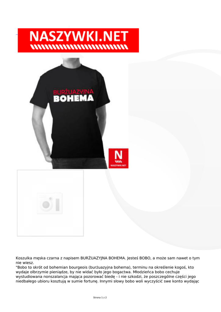 Koszulka męska czarna z napisem BURŻUAZYJNA BOHEMA. Jesteś BOBO, a może sam nawet o tym nie wiesz. "Bobo to skrót od bohemian bourgeois (burżuazyjna bohema), terminu na określenie kogoś, kto wydaje olbrzymie pieniądze, by nie widać było jego bogactwa. Młodzieńca bobo cechuje wystudiowana nonszalancja mająca pozorować biedę - i nie szkodzi, że poszczególne części jego niedbałego ubioru kosztują w sumie fortunę. Innymi słowy bobo woli wyczyścić swe konto wydając Strona 1 z 2 pieniądze na dodatki, jakich zwykły śmiertelnik nawet nie dostrzeże, za to doceni je każdy inny bobo. Bogacze w nowym stylu za nic mają modę kreowaną przez Donatellę Versace, za to fascynuje ich styl Johnny’ego Deppa czy bliźniaczek Olsen." Nie wiesz, co zrobić z kasą? Kup koszulkę! Dostępne rozmiary od XS do XXL. Strona 2 z 2