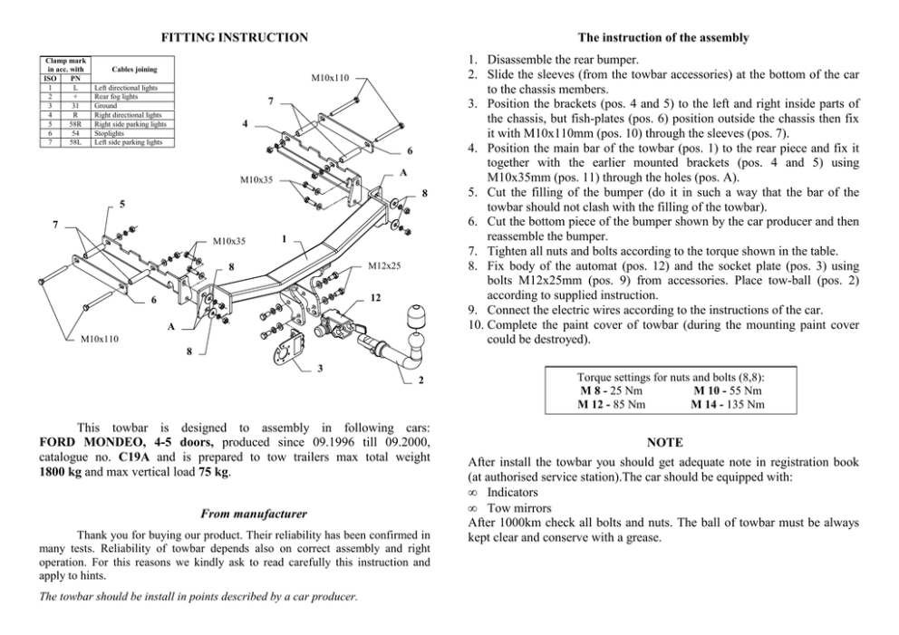 FITTING INSTRUCTION Clamp mark in acc. with ISO PN 1 L 2 + 3 31 4 R 5 58R 6 54 7 58L The instruction of the assembly Cables joining M10x110 Left directional lights Rear fog lights Ground Right directional lights Right side parking lights Stoplights Left side parking lights 7 4 6 A M10x35 8 5 7 M10x35 1 M12x25 8 12 6 A M10x110 1. Disassemble the rear bumper. 2. Slide the sleeves (from the towbar accessories) at the bottom of the car to the chassis members. 3. Position the brackets (pos. 4 and 5) to the left and right inside parts of the chassis, but fish-plates (pos. 6) position outside the chassis then fix it with M10x110mm (pos. 10) through the sleeves (pos. 7). 4. Position the main bar of the towbar (pos. 1) to the rear piece and fix it together with the earlier mounted brackets (pos. 4 and 5) using M10x35mm (pos. 11) through the holes (pos. A). 5. Cut the filling of the bumper (do it in such a way that the bar of the towbar should not clash with the filling of the towbar). 6. Cut the bottom piece of the bumper shown by the car producer and then reassemble the bumper. 7. Tighten all nuts and bolts according to the torque shown in the table. 8. Fix body of the automat (pos. 12) and the socket plate (pos. 3) using bolts M12x25mm (pos. 9) from accessories. Place tow-ball (pos. 2) according to supplied instruction. 9. Connect the electric wires according to the instructions of the car. 10. Complete the paint cover of towbar (during the mounting paint cover could be destroyed). 8 3 2 This towbar is designed to assembly in following cars: FORD MONDEO, 4-5 doors, produced since 09.1996 till 09.2000, catalogue no. C19A and is prepared to tow trailers max total weight 1800 kg and max vertical load 75 kg. From manufacturer Thank you for buying our product. Their reliability has been confirmed in many tests. Reliability of towbar depends also on correct assembly and right operation. For this reasons we kindly ask to read carefully this instruction and apply to hints. The towbar should be install in points described by a car producer. Torque settings for nuts and bolts (8,8): M 8 - 25 Nm M 10 - 55 Nm M 12 - 85 Nm M 14 - 135 Nm NOTE After install the towbar you should get adequate note in registration book (at authorised service station).The car should be equipped with: • Indicators • Tow mirrors After 1000km check all bolts and nuts. The ball of towbar must be always kept clear and conserve with a grease. PPUH AUTO-HAK S. J. Towbar accessories: Produkcja Haków Holowniczych Henryk & Zbigniew Nejman 76-200 SŁUPSK ul. Słoneczna 16K tel/fax (059) 8-414-414; 8-414-413 E-mail: [email protected] www.autohak.com.pl Towing hitch (without electrical set) Class: A50-X Cat. no. C19A Technical data: D-value: 8,83 kN maximum trailer weight: 1800 kg maximum vertical cup load: 75 kg Designed for: Manufacturer: FORD Model: MONDEO Type: 4-5 doors produced since 09.1996 till 09.2000 Approval number according to Directive 94/20/EC: e20*94/20*0970*00 Foreword This towbar is designed according to rules of safety traffic regulations. The towing hitch is a safety component and can be install only by qualified personnel. Any alteration or conversion of the towing hitch is prohibited and would lead to cancellation of design certification. Remove insulating compound and underseal from vehicle (if present) in the area of the matting surfaces of the towing hitch. The vehicle manufacturer’s specifications regarding trailer load and max. vertical cup load are decisive for driving whereat values for the towing hitch cannot be exceeded. D-value formula: Max trailer weight [kg] x Max trailer weight [kg] + Max vehicle weight [kg] Max vehicle weight [kg] X 9,81 = 1000 D [kN] INSTRUKCJA MontaŜu i eksploatacji zaczepu kulowego Oznaczenie zacisku wg ISO PN 1 L 2 + 3 31 4 R 5 58R 6 54 7 58L Kolejność czynności przy montaŜu M10x110 Łączenie przewodów 7 Kierunkowskazy lewe Tylne światła przeciwmgłowe Masa Kierunkowskazy prawe Światła pozycyjne prawe Światła hamowania Światła pozycyjne lewe 4 6 A M10x35 8 5 7 M10x35 1 M12x25 8 12 6 A M10x110 8 3 2 Zaczep kulowy przeznaczony jest do zamontowania w samochodzie: FORD MONDEO, 4-5 drz., produkowanym od 09.1996r. do 09.2000r., numer katalogowy C19A i słuŜy do ciągnięcia przyczep o masie całkowitej 1800 kg i nacisku na kulę max 75 kg. 1. W celu zamontowania zaczepu naleŜy zdemontować zderzak. 2. Od spodu samochodu od podłuŜnic w istniejące otwory włoŜyć tulejki dystansowe (poz. 7) z wyposaŜenia. 3. Od wewnętrznej strony podłuŜnic po lewej i prawej stronie przyłoŜyć wsporniki zaczepu (poz. 4 i 5), a od zewnętrznej strony podłuŜnic nakładki (poz. 6) i poprzez tulejki (poz. 7) skręcić śrubami M10x110mm (poz. 10) z wyposaŜenia. 4. Belkę główną zaczepu (poz. 1) przyłoŜyć do tylnego płata i poprzez istniejące otwory oraz otwory zaczepu (poz. A) skręcić śrubami M10x35mm (poz. 11) z zamontowanymi uprzednio wspornikami zaczepu (poz. 4 i 5). 5. Podciąć miękkie wypełnienie czaszy zderzaka tak, aby nie kolidowało z konstrukcją belki zaczepu. 6. W dolnej części spojlera zderzaka wyciąć fabrycznie zaznaczony fragment, a następnie zamontować zderzak. 7. Przykręcić korpus automatu (poz. 12) śrubami M12x25mm (poz. 9) wraz z blachą pod gniazdo (poz. 3). Zamocować kulę zgodnie z instrukcją dołączaną do zaczepu z końcówką szybkodemontowalną. 8. Dokręcić wszystkie śruby z momentem jak pokazano w tabeli. 9. Podłączyć przewody gniazdka 7 – bieg. do instalacji elektrycznej zgodnie z instrukcją fabryczną samochodu (zaleca się wykonanie w ASO). 10. Uzupełnić ewentualne ubytki powłoki malarskiej zaczepu powstałe w trakcie montaŜu. Zalecany moment skręcający dla śrub i nakrętek 8,8: M 8 - 25 Nm M 10 - 55 Nm M 12 - 85 Nm M 14 - 135 Nm OD PRODUCENTA UWAGA Dziękujemy za wybór produkowanego przez naszą firmę zaczepu kulowego. Jego niezawodność została potwierdzona licznymi testami oraz opiniami zadowolonych kl