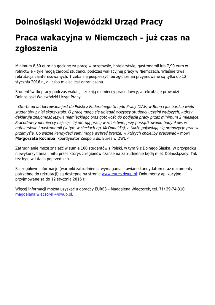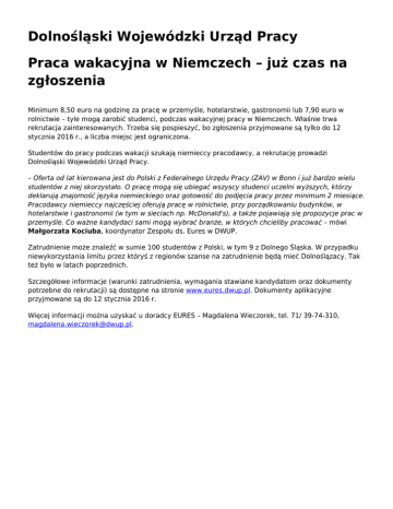 Dolnośląski Wojewódzki Urząd Pracy Praca wakacyjna w Niemczech – już czas na zgłoszenia Minimum 8,50 euro na godzinę za pracę w przemyśle, hotelarstwie, gastronomii lub 7,90 euro w rolnictwie – tyle mogą zarobić studenci, podczas wakacyjnej pracy w Niemczech. Właśnie trwa rekrutacja zainteresowanych. Trzeba się pospieszyć, bo zgłoszenia przyjmowane są tylko do 12 stycznia 2016 r., a liczba miejsc jest ograniczona. Studentów do pracy podczas wakacji szukają niemieccy pracodawcy, a rekrutację prowadzi Dolnośląski Wojewódzki Urząd Pracy. – Oferta od lat kierowana jest do Polski z Federalnego Urzędu Pracy (ZAV) w Bonn i już bardzo wielu studentów z niej skorzystało. O pracę mogą się ubiegać wszyscy studenci uczelni wyższych, którzy deklarują znajomość języka niemieckiego oraz gotowość do podjęcia pracy przez minimum 2 miesiące. Pracodawcy niemieccy najczęściej oferują pracę w rolnictwie, przy porządkowaniu budynków, w hotelarstwie i gastronomii (w tym w sieciach np. McDonald's), a także pojawiają się propozycje prac w przemyśle. Co ważne kandydaci sami mogą wybrać branże, w których chcieliby pracować – mówi Małgorzata Kociuba, koordynator Zespołu ds. Eures w DWUP. Zatrudnienie może znaleźć w sumie 100 studentów z Polski, w tym 9 z Dolnego Śląska. W przypadku niewykorzystania limitu przez któryś z regionów szanse na zatrudnienie będą mieć Dolnoślązacy. Tak też było w latach poprzednich. Szczegółowe informacje (warunki zatrudnienia, wymagania stawiane kandydatom oraz dokumenty potrzebne do rekrutacji) są dostępne na stronie www.eures.dwup.pl. Dokumenty aplikacyjne przyjmowane są do 12 stycznia 2016 r. Więcej informacji można uzyskać u doradcy EURES – Magdalena Wieczorek, tel. 71/ 39-74-310, [email protected].