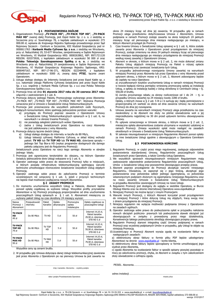 Regulamin Promocji TV-PACK HD, TV-PACK TOP HD, TV-PACK MAX HD prowadzonej przez Espol Kable Sp. z o.o. z siedzibą w Szczecinie § 1 POSTANOWIENIA OGÓLNE 1. Organizatorem Promocji „TV-PACK HD”, „TV-PACK TOP HD”, „TV-PACK MAX HD” zwanej dalej Promocją, jest Espol Kable Sp. z o. o. z siedzibą w Szczecinie przy ul. Sowińskiego 78, o kapitale zakładowym w wysokości 273 000.00 zł, wpisana do Krajowego Rejestru Sądowego prowadzonego przez Sąd Rejonowy Szczecin - Centrum w Szczecinie, XIII Wydział Gospodarczy pod nr 0000611763 i Korbank Media Cyfrowe Sp. z o.o. z siedzibą we Wrocławiu, przy ul. Nabycińskiej 19, 53-677 Wrocław, zarejestrowaną w Sądzie Rejonowym we Wrocławiu, VI Wydział Gospodarczy KRS: 0000263862, NIP: 8971721120 REGON: 020373926, z kapitałem zakładowym w wysokości 50 000 zł oraz Polska Telewizja Szerokopasmowa Spółką z o. o. z siedzibą we Wrocławiu przy ul. Nabycińskiej 19 zarejestrowaną w Sądzie Rejonowym we Wrocławiu, VI Wydział Gospodarczy Krajowego Rejestru Sądowego, KRS: 0000497167, NIP: 897-17-96-371, REGON: 022348499, z kapitałem zakładowym w wysokości 5000 zł, zwaną dalej PTSZ, łącznie zwani Operatorem. 2. Usługa stałego dostępu do Internetu świadczona jest przez Espol Kable sp. z o.o. natomiast Usługa Platformy Cyfrowej świadczona jest przez Espol Kable Sp. z o.o. wspólnie z Korbank Media Cyfrowe Sp. z o.o oraz Polska Telewizja Szerokopasmowa Spółka z o.o. 3. Promocja trwa od dnia 01 stycznia 2017 roku do 30 czerwca 2017 roku włącznie z zastrzeżeniem § 1 ust. 8. 4. Promocja dotyczy jednego Pakietu Promocyjnego wybranego przez Abonenta: „TV-PACK HD”, „TV-PACK TOP HD”, „TV-PACK MAX HD”. Wybrana Promocja oznaczona jest w Umowie o Świadczenie Usług Telekomunikacyjnych. 5. Promocja jest przeznaczona dla wszystkich pełnoletnich osób fizycznych, będących konsumentami, które spełniają jednocześnie poniższe warunki: a) przystąpią do Promocji poprzez zawarcie z Operatorem Umowy o Świadczenie Usług Telekomunikacyjnych opisanych w § 1 ust. 6, na warunkach i w okresie trwania Promocji, b) nie posiadają zaległości płatniczych wobec Operatora, c) żadna z Usług świadczonych przez Operatora na rzecz Abonenta nie jest zablokowana z winy Abonenta. 6. Promocja dotyczy łącznie dwóch Usług: a) Usługi stałego dostępu do internetu w taryfie do 80 Mb/s, b) Usługi telewizji cyfrowej Platforma Cyfrowa, w skład której wchodzi pakiet: TV HD lub TV TOP HD lub TV MAX HD, dzierżawa sprzętu – jednego Set Top Box-a HD (wykaz programów dostępnych dla danego pakietu załączony jest do Regulaminu Promocji) świadczonych przez Operatora na rzecz tego samego Abonenta w obrębie jednego lokalu. 7. Promocja jest ograniczona terytorialnie do obszaru, na którym Operator świadczy jednocześnie dwie Usługi wskazane w § 1 ust. 6. 8. Operator zastrzega sobie prawo do stosowania Promocji tylko w miejscach, w których posiada infrastrukturę telekomunikacyjną spełniającą warunki techniczne umożliwiające równoczesne świadczenie wszystkich Usług objętych Promocją. 9. Operator zastrzega sobie prawo do zakończenia Promocji w terminie wcześniejszym niż oznaczony § 1 ust. 3, jeżeli z przyczyn technicznych nie będzie miał możliwości podłączenia nowych Abonentów. § 2 ZASADY PROMOCJI 1. Do momentu uruchomienia wszystkich Usług w Pakiecie, Abonent będzie ponosił opłatę cząstkową za wybrane Usługi. Wszystkie profity przynależne Abonentowi w tej Promocji przysługują proporcjonalnie od dnia uruchomienia poszczególnych Usług opisanych w § 1 ust. 6. Abonament miesięczny za wybrany pakiet Usług na czas określony 24 miesięcy wynosi: Nazwa Promocji i Abonament Przepustowość internetu Pakiet Opłata Kanałów aktywacyjna Promocyjna opłata instalacyjna Opłaty cząstkowe za poszczególne Usługi TV-PACK HD 49 zł Do 80 Mb/s TV HD 5 zł 50 zł Internet 14,10 zł, Pakiet kanałów 29,90 zł, dzierżawa STB HD 5 zł TV-PACK TOP HD 79 zł Do 80 Mb/s TV TOP HD 5 zł 50 zł Internet 14,10 zł, Pakiet kanałów 59,90 zł, dzierżawa STB HD 5 zł TV-PACK MAX HD 99 zł Do 80 Mb/s TV MAX HD 5 zł 50 zł Internet 14,10 zł, Pakiet kanałów 79,90 zł, dzierżawa STB HD 5 zł Wszystkie ceny są cenami brutto. 2. W przypadku gdy Umowa dotycząca danej Usługi telekomunikacyjnej zawierana jest przez Abonenta z Operatorem po raz pierwszy Umowa ta jest zawarta na ................................................................................................. 3. 4. 5. 6. 7. 8. okres 24 miesięcy licząc od dnia jej zawarcia. W przypadku gdy w ramach Promocji ulega przedłużeniu dotychczasowa Umowa z Abonentem, Umowa podpisana w ramach Promocji zostaje zawarta na okres kolejnych 24 pełnych miesięcy licząc od pierwszego dnia miesiąca następującego po miesiącu, w którym Abonent przystąpił do Promocji. Czas trwania Umowy o Świadczenie Usług opisanej w § 1 ust. 6, która została zawarta przez Abonenta z Operatorem przed przystąpieniem do niniejszej Promocji, zostaje zmieniony na okres 24 pełnych miesięcy licząc od pierwszego dnia miesiąca następującego po miesiącu przystąpienia do niniejszej Promocji według nowej zawartej z Operatorem Umowy. Abonent w okresie, o którym mowa w § 2 ust. 2, nie może dokonać zmiany Pakietu Usług objętych niniejszą Promocją na Pakiet o niższej opłacie abonamentowej oraz zawieszać świadczenia tych Usług. W przypadku jednostronnego rozwiązania Umowy zawartej na warunkach niniejszej Promocji przez Abonenta lub przez Operatora z winy Abonenta przed upływem okresu, o którym mowa w § 2 ust. 2, Abonent zobowiązany będzie do zapłaty na rzecz Operatora: a) zryczałtowanych kosztów uruchomienia Usług w ramach niniejszej Promocji w kwocie będącej różnicą pomiędzy wniesioną promocyjną opłatą za instalację Usług, a opłatą za instalację każdej z Usług określoną w Cennikach Usług – tj. 550,00 zł brutto, b) zwrot