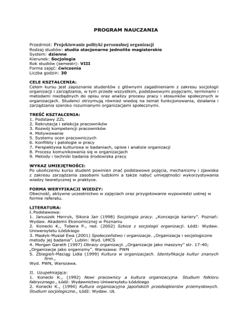 PROGRAM NAUCZANIA Przedmiot: Projektowanie polityki personalnej organizacji Rodzaj studiów: studia stacjonarne jednolite magisterskie System: dzienne Kierunek: Socjologia Rok studiów (semestr): VIII Forma zajęć: ćwiczenia Liczba godzin: 30 CELE KSZTAŁCENIA: Celem kursu jest zapoznanie studentów z głównymi zagadnieniami z zakresu socjologii organizacji i zarządzania, w tym przede wszystkim, podstawowymi pojęciami, terminami i metodami niezbędnych do opisu oraz analizy procesu pracy i stosunków społecznych w organizacjach. Studenci otrzymują również wiedzę na temat funkcjonowania, działania i zarządzania szeroko rozumianymi organizacjami społecznymi. TREŚĆ KSZTAŁCENIA: 1. Podstawy ZZL 2. Rekrutacja i selekcja pracowników 3. Rozwój kompetencji pracowników 4. Motywowanie 5. Systemy ocen pracowniczych 6. Konflikty i patologie w pracy 7. Perspektywa kulturowa w badaniach, opisie i analizie organizacji 8. Procesy komunikowania się w organizacjach 9. Metody i techniki badania środowiska pracy WYKAZ UMIEJĘTNOŚCI: Po ukończeniu kursu student powinien znać podstawowe pojęcia, mechanizmy i zjawiska z zakresu zarządzania zasobami ludzkimi a także nabyć umiejętności wykorzystywania wiedzy teoretycznej w praktyce. FORMA WERYFIKACJI WIEDZY: Obecność, aktywne uczestnictwo w zajęciach oraz przygotowanie wypowiedzi ustnej w formie referatu. LITERATURA: I. Podstawowa: 1. Januszek Henryk, Sikora Jan (1998) Socjologia pracy. „Koncepcje kariery”. Poznań: Wydaw. Akademii Ekonomicznej w Poznaniu 2. Konecki K., Tobera P., red. (2002) Szkice z socjologii organizacji. Łódź: Wydaw. Uniwersytetu Łódzkiego 3. Masłyk-Musiał Ewa (2001) Społeczeństwo i organizacje. „Organizacja i socjologiczne metody jej badania”. Lublin: Wyd. UMCS 4. Morgan Gareth (1997) Obrazy organizacji. „Organizacje jako maszyny” str. 17-40; „Organizacje jako organizmy”. Warszawa: PWN 5. Zbiegień-Maciąg Lidia (1999) Kultura w organizacjach. Identyfikacja kultur znanych firm., Wyd. PWN, Warszawa. II. Uzupełniająca: 1. Konecki K., (1992) Nowi pracownicy a kultura organizacyjna. Studium folkloru fabrycznego., Łódź: Wydawnictwo Uniwersytetu Łódzkiego 2. Konecki K., (1994) Kultura organizacyjna japońskich przedsiębiorstw przemysłowych. Studium socjologiczne., Łódź: Wydaw. UŁ 3. Morgan G., (2001) Wyobraźnia organizacyjna. Nowe sposoby postrzegania, organizowania i zarzadzania. Warszawa: Wydaw. Naukowe PWN 4. Listwan T., (1994) Zarządzanie Kadrami. Materiały do ćwiczeń. Akademia Ekonomiczna im. Oskara Langego, Wrocław