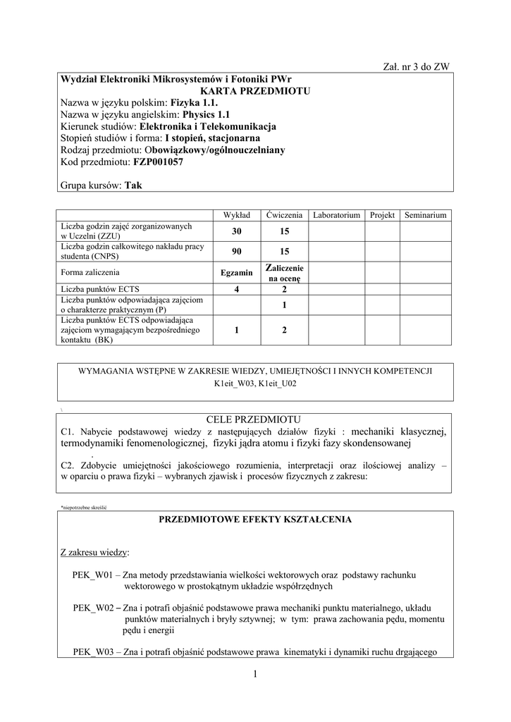 Zał. nr 3 do ZW Wydział Elektroniki Mikrosystemów i Fotoniki PWr KARTA PRZEDMIOTU Nazwa w języku polskim: Fizyka 1.1. Nazwa w języku angielskim: Physics 1.1 Kierunek studiów: Elektronika i Telekomunikacja Stopień studiów i forma: I stopień, stacjonarna Rodzaj przedmiotu: Obowiązkowy/ogólnouczelniany Kod przedmiotu: FZP001057 Grupa kursów: Tak Liczba godzin zajęć zorganizowanych w Uczelni (ZZU) Liczba godzin całkowitego nakładu pracy studenta (CNPS) Forma zaliczenia Liczba punktów ECTS Liczba punktów odpowiadająca zajęciom o charakterze praktycznym (P) Liczba punktów ECTS odpowiadająca zajęciom wymagającym bezpośredniego kontaktu (BK) Wykład Ćwiczenia 30 15 90 15 Egzamin Zaliczenie 4 2 Laboratorium Projekt Seminarium na ocenę 1 1 2 WYMAGANIA WSTĘPNE W ZAKRESIE WIEDZY, UMIEJĘTNOŚCI I INNYCH KOMPETENCJI K1eit_W03, K1eit_U02 \ CELE PRZEDMIOTU C1. Nabycie podstawowej wiedzy z następujących działów fizyki : mechaniki klasycznej, termodynamiki fenomenologicznej, fizyki jądra atomu i fizyki fazy skondensowanej . C2. Zdobycie umiejętności jakościowego rozumienia, interpretacji oraz ilościowej analizy – w oparciu o prawa fizyki – wybranych zjawisk i procesów fizycznych z zakresu: *niepotrzebne skreślić PRZEDMIOTOWE EFEKTY KSZTAŁCENIA Z zakresu wiedzy: PEK_W01 – Zna metody przedstawiania wielkości wektorowych oraz podstawy rachunku wektorowego w prostokątnym układzie współrzędnych PEK_W02 – Zna i potrafi objaśnić podstawowe prawa mechaniki punktu materialnego, układu punktów materialnych i bryły sztywnej; w tym: prawa zachowania pędu, momentu pędu i energii PEK_W03 – Zna i potrafi objaśnić podstawowe prawa kinematyki i dynamiki ruchu drgającego 1 PEK_W04 – Zna i potrafi objaśnić podstawowe prawa termodynamiki fenomenologicznej, w tym: model i własności gazu doskonałego, przemiany stanu gazu, pojęcia: pracy, ciepła, energi wewnętrznej i entropi. PEK_W05 – Zna i potrafi objaśnić podstawowe założenia, prawa oraz rozwiązania prostych zagadnień w kwantowym modelu mikroświata PEK_W06 – Zna i potrafi objaśnić podstawowe właściwości krystalicznych ciał stałych; w tym: podstawy teorii pasmowej ciał stałych, właściwości półprzewodników, w tym właściwości elektryczne i optyczne, oraz fizyczne podstawy działania przyrządów półprzewodnikowych PEK_W07 – Zna i potrafi objaśnić podstawowe własności jadra atomowego; w tym: modele jadra atomowego, własności sił jądrowych, reakcje rozpadu i syntezy jądrowej Z zakresu umiejętności: PEK_U01 – Potrafi opisać ilościowo i jakościowo zjawiska fizyczne posługując się podstawowymi prawami mechaniki klasycznej i termodynamiki PEK_U02 – Potrafi rozwiązywać praktyczne problemy wymagające wykonywania rachunków w zakresie zjawisk zachodzących w półprzewodnikach Z zakresu kompetencji społecznych: PEK_K01 – Potrafi ocenić otaczające go zjawiska w kategoriach naukowych TREŚCI PROGRAMOWE Forma zajęć – wykład Liczba godzin Sprawy organizacyjne Przedstawienie wielkości wektorowych w kartezjańskim układzie Wy 1 współrzędnych, rachunek wektorowy Kinematyka i dynamika punktu materialnego. Równania ruchu dla prostych Wy 2 przypadków Dynamika układu punktów materialnych i bryły sztywnej. Zasady zachowania Wy 3, Wy 4 pędu i momentu pędu. Praca i energia mechaniczna, zasada zachowania energii mechanicznej Wy 5 Ruch drgający nietłumiony, tłumiony i wymuszony, rezonans Elementy teorii kinetyczno-molekularnej gazu doskonałego, rozkłady Wy 6 Maxwella i Boltzmanna Zasady termodynamiki, praca, ciepło, energia wewnętrzna, entropia, zasada Wy 7, Wy 8 ekwipartycji energii, przemiany stanu gazu Równanie Schrödingera, interpretacja funkcji falowej, zasada Wy 9, Wy 10 nieoznaczoności. Rozwiązania równania Schrödingera dla prostych 1 Wy 1 2 1 2 4 2 2 4 4 przypadków (cząstka w studni potencjału, zjawisko tunelowania) Podstawy teorii pasmowej ciał stałych. Właściwości elektryczne i optyczne Wy 11, W 12 półprzewodników Wy 13 Postawy fizyki wybranych przyrządów półprzewodnikowych Fizyka atomu ( budowa, poziomy energetyczne, liczby kwantowe elektronów, Wy 14 zasada Pauliego, wiązania chemiczne) Fizyka jądrowa –siły jądrowe, promieniotwórczość, reakcje rozpadu i Wy 15 syntezy jądrowej Wy 15 Standardowy model budowy materii : kwarki, oddziaływania elementarne Suma godzin Forma zajęć – ćwiczenia Ćw.1 Ćw. 2 Ćw. 3 Ćw. 4 Ćw. 5 Ćw. 6 Ćw.7 Ćw. 8 STOSOWANE NARZĘDZIA DYDAKTYCZNE 1. Wykład – metoda tradycyjna z wykorzystaniem multimediów 2. Ćwiczenia rachunkowe – metoda tradycyjna, dyskusja nad rozwiązaniami zadań 3. Ćwiczenia rachunkowe – krótkie 10 min. sprawdziany pisemne 4. Konsultacje 5. Praca własna – przygotowanie do ćwiczeń 6. Praca własna – przygotowanie do egzaminu OCENA OSIĄGNIĘCIA PRZEDMIOTOWYCH EFEKTÓW KSZTAŁCENIA Oceny (F – formująca Sposób oceny osiągnięcia (w trakcie semestru), P Numer efektu kształcenia efektu kształcenia – podsumowująca (na koniec semestru) F1 P = F1 3 2 2 1 1 30 Liczba Godzin Sprawy organizacyjne. Rozwiązywanie zadań z zakresu rachunku wektorowego Zastosowanie zasad Newtona do rozwiązywania równań ruchu; wyznaczanie zależności od czasu wartości podstawowych wielkości kinematycznych i dynamicznych Rozwiązywanie wybranych zagadnień z zakresu dynamiki punktu materialnego Rozwiązywanie zadań z zakresu kinematyki i dynamiki ruchu obrotowego bryły sztywnej wokół ustalonej osi oraz zasady zachowania momentu pędu Analiza i rozwiązywania zadań z zakresu dynamiki ruchu drgającego Rozwiązywanie zadań z zakresu fizyki fal mechanicznych Rozwiązywanie zadań z wykorzystaniem zasad termodynamiki Repetytorium Suma godzin K1eit_U04, K1eit_W04, K1eit_W07, K1eit_W19 4 Pisemne sprawdziany, egzamin 2 2 2 2 2 2 2 2 15 LITERATURA PODSTAWOWA I UZUPEŁNIAJĄCA LITERATURA PODSTAWOWA [1] D. Halliday, R. Resnick, J. Walker, Podstawy fizy