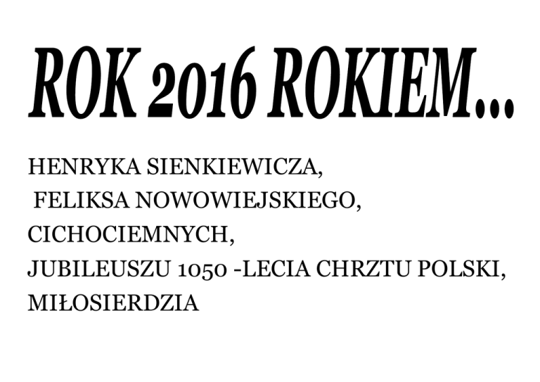 HENRYKA SIENKIEWICZA, FELIKSA NOWOWIEJSKIEGO, CICHOCIEMNYCH, JUBILEUSZU 1050 -LECIA CHRZTU POLSKI, MIŁOSIERDZIA JUBILEUSZ 1050 LECIA CHRZTU POLSKI „Chrzest władcy Polan i jego dworu, a w konsekwencji chrzest Polski, odbył się w Wigilię Paschalną, 14 kwietnia 966 roku. Akt ten miał decydujące znaczenie dla procesu jednoczenia plemion polskich pod władzą Piastów i kształtowania się chrześcijańskiej tożsamości naszego Narodu (...) Sejm czci pamięć przełomowego w historii Polski wydarzenia, jakim było przyjęcie chrztu przez księcia Mieszka I. Izba wyraża też nadzieję, że obchody rocznicy będą okazją do pojednania i odbudowy polskiej wspólnot y narodowej”. W dokumencie przypomniano też słowa Jana Pawła II: „Polska weszła w krąg kultury chrześcijańskiego Zachodu i zaczęła budować swą przyszłość na fundamencie Ewangelii. Od tamtych czasów staliśmy się pełnoprawnymi członkami europejskiej rodziny narodów ze wszystkimi wynikającymi z tego konsekwencjami. Wespół z innymi narodami Europy jeste śmy współtwórcami, a zarazem dziedzicami bogatej historii i kultury”. W uchwale przypomina się też obchodzone 50 lat temu, w 1966 r. uroczystości „Sacrum Millennium Poloniae” i ich znaczenie na polskiej drodze do wolności. Były one masową demonstracją wiary oraz wyrazem oporu wobec władz komunistycznych. Obchody centralne 1050. rocznicy chrztu Polski zaplanowano na 14-16 kwietnia. Odbędą się w Gnieźnie (14 kwietnia) i w Poznaniu (15-16 kwietnia). Honorowy patronat nad obchodami 1050. rocznicy Chrztu Polski objął prezydent Andrzej Duda. 75 LAT OD PIERWSZEGO SPADOCHRONOWEGO ZRZUTU TYCH ŻOŁNIERZY NA TEREN OKUPOWANEJ POLSKI Patronami roku 2016 Sejm ustanowił także Cichociemnych - żołnierzy polskich szkolonych w Wielkiej Brytanii do zadań specjalnych. W lutym minie 75 lat od pierwszego spadochronowego zrzutu tych żołnierzy na teren okupowanej Polski. W nocy z 15 na 16 lutego 1941 r. miał miejsce pierwszy zrzut do walki w okupowanej Polsce Cichociemnych – spadochroniarzy Związku Walki Zbrojnej, a następnie Armii Krajowej. „Działania Cichociemnych umożliwiły nawiązanie łączności z krajem drogą lotniczą oraz przeprowadzenie akcji sabotażowo-dywersyjnych przeciwko okupantom. Do końca 1944 roku na obszar Polski zrzuconych zostało 316 Cichociemnych, z których 112 oddało życie za wolną Ojczyznę. Kilkudziesięciu kolejnych żołnierzy polskich – spadochroniarzy – skierowano do innych okupowanych krajów w Europie” – napisano w uchwale. W dokumencie przypomniano, że Cichociemni stanowili elitę Polskich Sił Zbrojnych. Dodano, że z uwagi na swoje zasługi w walce o niepodległość Polski, powinni mieć oni stałe miejsce w panteonie polskich bohaterów narodowych. W uchwale podkreślono też kon ieczność upowszechniania wiedzy o osiągnięciach i poświęceniu Cichociemnych oraz inst ytucjonalnego i obywatelskiego wsparcia działań podejmowanych w tym zakresie m.in. przez ich rodziny oraz Fundację im. Cichociemnych Spadochroniarzy Armii Krajowej. FELIKS NOWOWIEJSKI PATRONEM 2016 ROKU – 70. ROCZNICA ŚMIERCI TWÓRCY Rok 2016 ustanowiono także Rokiem Feliksa Nowowiejskiego - kompozytora, dyrygenta, autora muzyki do „Roty”. „Nowowiejski zawsze stał po stronie polskości i polskiej kultury” - głosi uchwała. „Artysta był autorem wielu pieśni patriotycznych, które umacniały tożsamość narodową Polaków. W niepodległej Polsce brał czynny udział w tworzeniu i organizowaniu życia artystyczneg o. (...) Jego dorobek wywarł wpływ na kulturę muzyczną całego świata, a w szczególności Polski. Artysta zawsze stał po stronie pols kości i polskiej kultury” – czytamy w uchwale. 170. ROCZNICA URODZIN I 100. ROCZNICA ŚMIERCI PISARZA Patronem 2016 roku jest także Henryk Sienkiewicz. Okazją do ustanowienia patronatu jest 170. rocznica urodzin oraz 100. roczn ica śmierci pisarza. W uchwale podkreślono, że Sienkiewicz to „pierwszy Polak uhonorowany Nagrodą Nobla w dziedzinie literatury, doceniony za całokształt twórczości”. „Jego powieści historyczne podtrzymywały na duchu kolejne pokolenia Polaków w czasach narodowych niedoli” - czytamy. „Twórczość Henryka Sienkiewicza, działalność społeczna i nieustanne orędownictwo za niepodległym państwem polskim odegrały niezwykle istotną rolę w odzyskaniu przez Polskę państwowości. Niech Sienkiewiczowska spuścizna stanowi podstawę patriotyczne go wychowania młodych pokoleń Polaków” - głosi uchwała. Przytoczono w niej też słowa Stanisława Cata-Mackiewicza, który napisał o Sienkiewiczu: „My wszyscy z niego”. JUBILEUSZ MIŁOSIERDZIA BOŻEGO W bazylice watykańskiej 11 kwietnia 2015r. w czasie pierwszych Nieszporów z Niedzieli Miłosierdzia Ojciec Święty Franciszek ogłosił Nadzwyczajny Rok Święty Miłosierdzia. W homilii mówił m.in. o motywach tej decyzji: W wielu sercach pojawia się pytanie: dlaczego dziś Jubileusz Miłosierdzia? Po prostu dlatego, że Kościół, w tym czasie wielkich przemian epokowych jest wezwany do bardziej wyraźnego ukazywania znaków obecności i bliskości Boga. Nie jest to czas na rozrywkę, ale przeciwnie, by trwać na czuwaniu i rozbudzić w nas umiejętność spoglądania na to, co istotne. W Bulii zatytułowanej „Misericordiae vultus”, o Nadzwyczajnym Jubileuszu Miłosierdzia, który rozpocznie się 8 grudnia 2015r., a zakończy 20 listopada 2016 roku, Papież odwołał się m.in. do świadectwa życia św. Siostry Faustyny, pisząc: Nasza modlitwa rozciąga się również na wielu Świętych i Błogosławionych, którzy uczynili z miłosierdzia swoją misję życia. W sposób szczególny myśl kieruje się ku wielkiej apostołce miłosierdzia, świętej Faustynie Kowalskiej. Ta, która została wezwana do wejścia w głębokości Bożego miłosierdzia, niech wstawia się za nami i uzyska dla nas łaskę życia i chodzenia zawsze w świetl