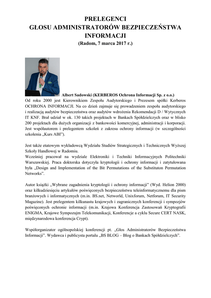 PRELEGENCI GŁOSU ADMINISTRATORÓW BEZPIECZEŃSTWA INFORMACJI (Radom, 7 marca 2017 r.) Albert Sadowski (KERBEROS Ochrona Informacji Sp. z o.o.) Od roku 2000 jest Kierownikiem Zespołu Audytorskiego i Prezesem spółki Kerberos OCHRONA INFORMACJI. Na co dzień zajmuje się prowadzeniem zespołu audytorskiego i realizacją audytów bezpieczeństwa oraz audytów wdrożenia Rekomendacji D / Wytycznych IT KNF. Brał udział w ok. 130 takich projektach w Bankach Spółdzielczych oraz w blisko 200 projektach dla dużych organizacji z bankowości komercyjnej, administracji i korporacji. Jest współautorem i prelegentem szkoleń z zakresu ochrony informacji (w szczególności szkolenia „Kurs ABI”). Jest także etatowym wykładowcą Wydziału Studiów Strategicznych i Technicznych Wyższej Szkoły Handlowej w Radomiu. Wcześniej pracował na wydziale Elektroniki i Techniki Informacyjnych Politechniki Warszawskiej. Praca doktorska dotyczyła kryptologii i ochrony informacji i zatytułowana była „Design and Implementation of the Bit Permutations of the Substituton Permutation Networks”. Autor książki „Wybrane zagadnienia kryptologii i ochrony informacji” (Wyd. Helion 2000) oraz kilkudziesięciu artykułów poświęconych bezpieczeństwu teleinformatycznemu dla pism branżowych i informatycznych (m.in. BS.net, Networld, Unixforum, Netforum, IT Security Magazine). Jest prelegentem kilkunastu krajowych i zagranicznych konferencji i sympozjów poświęconych ochronie informacji (m.in. Krajowa Konferencja Zastosowań Kryptografii ENIGMA, Krajowe Sympozujm Telekomunikacji, Konferencje a cyklu Secure CERT NASK, międzynarodowa konferencja Crypt). Współorganizator ogólnopolskiej konferencji pt. „Głos Administratorów Bezpieczeństwa Informacji”. Wydawca i publicysta portalu „BS BLOG – Blog o Bankach Spółdzielczych”. Paweł Waniek (Południowo-Mazowiecki Bank Spółdzielczy w Jedlińsku) Kierownik Zespołu Organizacyjno-Administracyjnego w Południowo-Mazowieckim Banku Spółdzielczym w Jedlińsku, gdzie pełni jednocześnie funkcję Administratora Bezpieczeństwa Informacji. Współpracuje także z telewizją ZEBRRA.tv działając jako Doradca klienta biznesowego oraz Komentator sportowy. Absolwent Wydziału Nauk Humanistycznych Katolickiego Uniwersytetu Lubelskiego Jana Pawła II, na którym w 2012 roku współorganizował międzynarodową konferencję w postaci IV Kongresu Kultury Chrześcijańskiej. Ukończył również Wyższą Szkołę Handlową w Radomiu na kierunku: rachunkowość i podatki. Uczestnik wielu szkoleń, seminariów i konferencji z zakresu ochrony danych osobowych, także w roli prelegenta. Współorganizator ogólnopolskiej konferencji pt. „Głos Administratorów Bezpieczeństwa Informacji”. Publicysta portalu „BS BLOG – Blog o Bankach Spółdzielczych”. Piotr Glen (WIKnet) Ekspert ds. ochrony danych osobowych. Praktyk, mający wieloletnie doświadczenie w stosowaniu prawa ochrony danych osobowych. Na co dzień zajmujący się wdrażaniem polityki bezpieczeństwa informacji i systemów zarządzania ochroną danych osobowych w różnego rodzaju firmach i instytucjach. Jest członkiem Komisji rewizyjnej Stowarzyszenia Administratorów Bezpieczeństwa Informacji (SABI). Audytor Systemu Zarządzania Bezpieczeństwem Informacji wg PNISO/IEC 27001. Autor publikacji, książek w zakresie ochrony danych osobowych, trener i prelegent. Wykładowca akademicki. Uczestnik, jako ABI, postępowań administracyjnych oraz kontroli prowadzonych przez GIODO. Posiada duże doświadczenie i bardzo dobre umiejętności w prowadzeniu szkoleń z praktycznych aspektów ochrony danych osobowych. Autor i koordynator projektów edukacyjnych dotyczących ochrony danych osobowych. Jacek Zontek (Zontek i Wspólnicy) Trener, konsultant i audytor z 10-letnim doświadczeniem zawodowym w zakresie bezpieczeństwa informacji. Z wykształcenia magister inżynier telekomunikacji. Od 2003 Prezes Zarządu a obecnie Komplementariusz spółki komandytowej „Zontek i Wspólnicy”, specjalizującej się w doradztwie i szkoleniach z zakresu bezpieczeństwa informacji, ochrony danych osobowych oraz norm serii ISO. Jako trener przeprowadza szkolenia z zasad wykonywania przepisów Ustawy o Ochronie Danych Osobowych w aspekcie prawnym, jak i organizacyjno-technicznym. Ponadto prowadzi szkolenia z zakresu stosowania normy ISO 27001, Rekomendacji D dla bankowości, Rozporządzenia w sprawie Krajowych Ram Interoperacyjności. Do chwili obecnej przeszkolił ponad 5000 osób, głównie Administratorów Bezpieczeństwa Informacji, Administratorów Systemów Informatycznych, Pełnomocników ISO, pracowników Działu Kadr, Inspektorów bezpieczeństwa, między innymi ze spółek giełdowych, korporacji, fundacji, ministerstw, urzędów wojewódzkich, urzędów marszałkowskich, urzędów miejskich, uczelni, szkół i banków z całej Polski. Jako konsultant świadczy usługi opracowania i wdrożenia systemu ochrony danych osobowych w firmach i organizacjach. Z jego osobistej pomocy skorzystało ponad 300 podmiotów, np.: PGE Energia Odnawialna S.A., Aspiro S.A., Bank Spółdzielczy w Pszczynie, Komenda Wojewódzka Policji w Łodzi, Instytut Fizjologii i Patologii słuchu, Krajowa Rada Radiofonii i Telewizji, Małopolski Ośrodek Ruchu Drogowego, Pełni funkcję zewnętrznego Administratora Bezpieczeństwa Informacji w ponad 40 podmiotach w Polsce. Ponadto jako certyfikowany audytor wiodący normy ISO 27001, przeprowadza kontrole i audyty systemów bezpieczeństwa informacji, w tym ochrony danych osobowych. Sebastian Pabiasz (Wyższa Szkoła Handlowa w Radomiu) Administrator Sieci w Arbelon Sp. z o.o., Główny Informatyk w firmie Serix-Bis oraz wykładowca na Wyższej Szkole Handlowej w Radomiu. Absolwent Politechniki Częstochowskiej, gdzie ukończył studia doktoranckie. Tytuł pracy: „Metody rekonstrukcji i rozpoznawania twarzy z wykorzystaniem modelu trójwymiarowego”. Kierownik prac badawczy