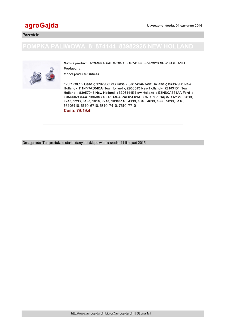 agroGajda Utworzono: środa, 01 czerwiec 2016 Pozostałe POMPKA PALIWOWA 81874144 83982926 NEW HOLLAND Nazwa produktu: POMPKA PALIWOWA 81874144 83982926 NEW HOLLAND Producent: Model produktu: 033039 1202938C92 Case -; 1202938C93 Case -; 81874144 New Holland -; 83982926 New Holland -; F1NN9A384BA New Holland -; 2900513 New Holland -; 72183181 New Holland -; 83957045 New Holland -; 83964115 New Holland -; E5NN9A384AA Ford -; E9NN9A384AA 100-086.183POMPA PALIWOWA FORDTYP CIĄGNIKA2610, 2810, 2910, 3230, 3430, 3610, 3910, 39304110, 4130, 4610, 4630, 4830, 5030, 5110, 56106410, 6610, 6710, 6810, 7410, 7610, 7710 Cena: 79.19zł Dostępność: Ten produkt został dodany do sklepu w dniu środa, 11 listopad 2015 http://www.agrogajda.pl | [email protected] | | Strona 1/1