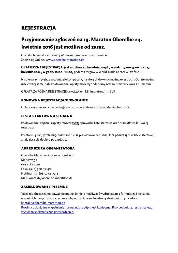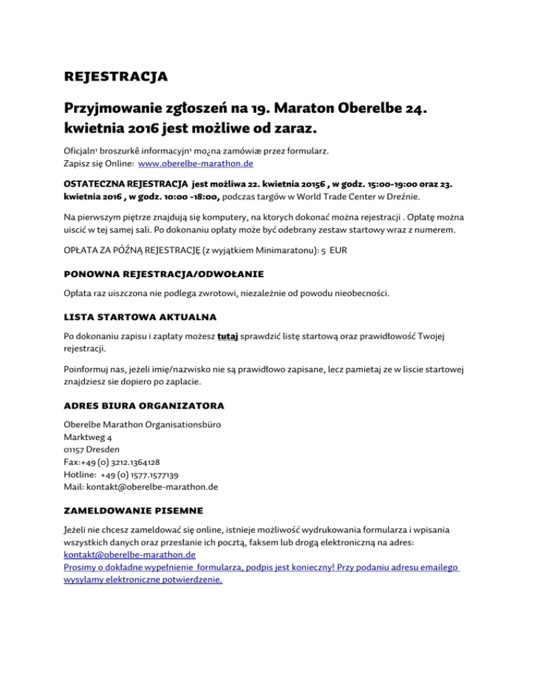 REJESTRACJA Przyjmowanie zgłoszeń na 19. Maraton Oberelbe 24. kwietnia 2016 jest możliwe od zaraz. Oficjaln¹ broszurkê informacyjn¹ mo¿na zamówiæ przez formularz. Zapisz się Online: www.oberelbe-marathon.de OSTATECZNA REJESTRACJA jest możliwa 22. kwietnia 20156 , w godz. 15:00-19:00 oraz 23. kwietnia 2016 , w godz. 10:00 -18:00, podczas targów w World Trade Center w Dreźnie. Na pierwszym piętrze znajdują się komputery, na ktorych dokonać można rejestracji . Opłatę można uiscić w tej samej sali. Po dokonaniu opłaty może być odebrany zestaw startowy wraz z numerem. OPŁATA ZA PÓŹNĄ REJESTRACJĘ (z wyjątkiem Minimaratonu): 5 EUR PONOWNA REJESTRACJA/ODWOŁANIE Opłata raz uiszczona nie podlega zwrotowi, niezależnie od powodu nieobecności. LISTA STARTOWA AKTUALNA Po dokonaniu zapisu i zapłaty możesz tutaj sprawdzić listę startową oraz prawidłowość Twojej rejestracji. Poinformuj nas, jeżeli imię/nazwisko nie są prawidłowo zapisane, lecz pamietaj ze w liscie startowej znajdziesz sie dopiero po zaplacie. Adres biura organizatora Oberelbe Marathon Organisationsbüro Marktweg 4 01157 Dresden Fax:+49 (0) 3212.1364128 Hotline: +49 (0) 1577.1577139 Mail: [email protected] ZAMELDOWANIE PISEMNE Jeżeli nie chcesz zameldować się online, istnieje możliwość wydrukowania formularza i wpisania wszystkich danych oraz przesłanie ich pocztą, faksem lub drogą elektroniczną na adres: [email protected] Prosimy o dokładne wypełnienie formularza, podpis jest konieczny! Przy podaniu adresu emailego wysylamy elektroniczne potwierdzenie. REGULAMIN ORGANIZATOR Oberelbe-Marathon e.V. Przewodniczacy Toralf Niese Am Dammberg 17 01445 Radebeul KIEROWNICTWO ORGANIZACYJNE Xperience sport & events Veranstaltungsagentur Kierownik Organizacji Uwe Sonntag Marktweg 4 01157 Dresden Tel.: +49 (0) 1577.1577139 Email: [email protected] Fax: +49 (0) 3212.1364128 Web: www.oberelbe-marathon.de PATRONAT Michael Geisler, czlonek rzadu kantonu szwajcarij saksonskiej OFERTA STARTOWA Ofertê startow¹ oraz program imprezy i czasy startów znajdziesz tutaj RZEPISY Trasa 18. Maratonu VVO Oberelbe 2015 jest oficjalnie i urzêdowo mierzona i posiada atest DLV. KLASYFIKACJE Podczas maratonu bêdzie prowadzona klasyfikacja LAO (min. wiek Marathon 18 lat!) WYDANIE PAKIETU STARTOWEGO/TARGI Atrium World Trade Center Drezno (Ammonstraße/naro¿nik Freiberger Strasse, oko³o 1km od Dworca Centralnego) Pi¹tek, 22. kwietnia 2016: godz. 15:00-19:00 Sobota, 23.kwietnia 20156: godz. 10:00-18:00 UWAGA! W dniu Maratonu odebranie pakietu startowego/numeru jest możliwe, za dodatkową opłatę 10 EUR. Po raz drugi oferujemy przesłanie pakietu pocztą za dodatkową oplatą 7 EUR. Prosimy podać odpowiednie życzenie w zameldowanju online. ZAMELDOWANIE DROG¥ POCZTOW¥ Prosimy dok³adnie i czytelnie wype³niæ zameldowanie drukowanymi literami. Proszê nie zapomnieæ o podpisie! Organizator nie odpowiada za nieprawidlowe informacje w zameldowaniu (adres). Pod haslem „Zameldowanie“ mo¿na znaleŸæ „pojedyñcze“ oraz „zbiorowe“ zameldowanie jako PDF (mo¿liwoœæ zameldowania klubów). ZG£OSZENIA ONLINE http://www.baer-service.de/uebersicht.php?id=ELB OP£ATA Do up³ywu okresu zg³oszeñ, p³atnoœæ odbywa siê tylko za pomoc¹ przelewu elektronicznego. Obcokrajowcy, którzy nie maj¹ mo¿liwoœci zap³aty SEPA, mog¹ zap³aciæ gotówk¹ podczas wydawania pakietu startowego w World Trade Center. Stawki op³at stratowych znajdziesz tutaj TERMIN UP£YWU ZG£OSZEÑ/ ZG£OSZENIA PÓNE Terminem up³ywu zg³oszeñ jest 15.kwietnia 2016 (Stempel pocztowy!)! Po tym terminie zgloszenia s¹ mo¿liwe 22. i 23. kwietnia na targach w WTC. Oplata za spozniona rezerwacije (poza minimaraton) 5€ POTWIERDZENIE Potwierdzenie rejestracji nastêpuje tylko elektronicznie mailem! Proszê wydrukowaæ potwierdzenie rejestracji i okazaæ przy odbiorze pakietu startowego. ODWO£ANIE UDZIA£U Op³ata raz uiszczona nie podlega zwrotowi, niezaleznie od powodu nieobecnosci. NAGRODY PIENIʯNE Zwyciêzcy w kategorii kobiet i mê¿czyzn otrzymuja nagrody pieniê¿ne (500, 300, 200 EUR) Bonusy za pobicie rekordu trasy (mê¿czyzn 2:23:38/ kobiet 2:38:41) – 300 EUR Bonus za czas ponizej 2:22:00 / 2:35 dodatkowo 300 EUR Zwyciêzcy Lichtenauer Pó³maratonu otrzymuj¹ nagrody pieniê¿ne (200, 100, 50 EUR) Bonusy za pobicie rekordu czasu (mê¿czyzn 1:07:46/ kobiet 1:19:07)- dodatkowo 150 EUR PREMIA SPECJALNA W MARATONIE 2015 Na rynku w Pirna na km18 przy punktcie pomiaru czasu (powered by Pura Hotels) pierwsza kobieta/pierwszy mê¿czyzna otrzymuj¹ 300 EUR Warunek: ukoñczenie maratonu w jako jeden z pierwszych dziesiêciu uczestnikow. NAGRODY Maraton: miejsce 1-6 kobiet/mê¿czyzn oraz uhonorowanie we wszystkich klasach wiekowych Pól-maraton Lichtenauer: miejsce 1-6 kobiet/mê¿czyzn Schulz aktiv 10-km-bieg: miejsce 1-6 kobiet/mê¿czyzn 7-km-walking: 3 kobiety orat 3 mê¿czyzn - wybrani przez przypadek AOK PLUS 3,7-km-Minimaraton: Nowe: klasy wiekowe 7/8, 9/10, 11/12, 13/14, 15/16, miejsca 1-3 dziewczynki oraz ch³opcy DYPLOM mo¿e byæ odebrany po biegu przy mecie. Nie odebrane dyplomy bêd¹ przys³ane (jeœli zosta³y zamowione), poczt¹ w czerwcu 2016. WYNIKI/ZESZYT WYNIKÓW Nieoficialne wyniki brutto bêd¹ dostêpne na mecie oraz tego samego dnia na stronie internetowej. W wynikach koñcowych biegu, zawodnik otrzymuje informacjê o oficialnym czasie netto. ZESZYT WYNIKIKÓW bedzie wysylany pod koniec czerwca 2016. Kto nie zyczy zeszytu wyników moze to podac przy zameldowaniu. MEDALE Wszyscy zawodnicy/zawodniczki, którzy ukoñcz¹ bieg otrzymaj¹ medal. POMIAR CZASU Podstaw¹ wszystkich biegów jest elektoniczny pomiar czasu przez transponder w numerze startowym. Prosze nie zginaæ numeru startowego! NUMER STARTOWY Musi byæ przymocowany do koszulki sportowej na piersiach, logo sponsorów musi byæ widoczne. TOWARZYSZENIE BIEGACZOWI Towarzyszenie biegaczowi na rowerze NIE jest dozwolone. Naruszenie tego przepisu pr