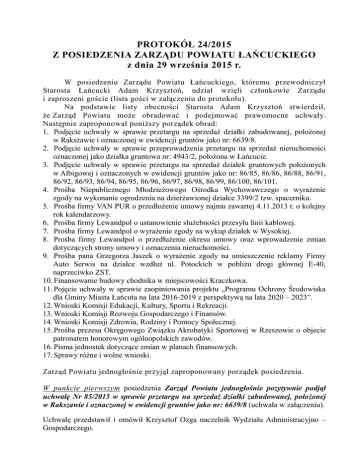 PROTOKÓŁ 24/2015 Z POSIEDZENIA ZARZĄDU POWIATU ŁAŃCUCKIEGO z dnia 29 września 2015 r. W posiedzeniu Zarządu Powiatu Łańcuckiego, któremu przewodniczył Starosta Łańcucki Adam Krzysztoń, udział wzięli członkowie Zarządu i zaproszeni goście (lista gości w załączeniu do protokołu). Na podstawie listy obecności Starosta Adam Krzysztoń stwierdził, że Zarząd Powiatu może obradować i podejmować prawomocne uchwały. Następnie zaproponował poniższy porządek obrad: 1. Podjęcie uchwały w sprawie przetargu na sprzedaż działki zabudowanej, położonej w Rakszawie i oznaczonej w ewidencji gruntów jako nr: 6639/8. 2. Podjęcie uchwały w sprawie przeprowadzenia przetargu na sprzedaż nieruchomości oznaczonej jako działka gruntowa nr: 4943/2, położona w Łańcucie. 3. Podjęcie uchwały w sprawie przetargu na sprzedaż działek gruntowych położonych w Albigowej i oznaczonych w ewidencji gruntów jako nr: 86/85, 86/86, 86/88, 86/91, 86/92, 86/93, 86/94, 86/95, 86/96, 86/97, 86/98, 86/99, 86/100, 86/101. 4. Prośba Niepublicznego Młodzieżowego Ośrodka Wychowawczego o wyrażenie zgody na wykonanie ogrodzenia na dzierżawionej działce 3399/2 tzw. spacerniku. 5. Prośba firmy VAN PUR o przedłożenie umowy najmu zawartej 4.11.2013 r. o kolejny rok kalendarzowy. 6. Prośba firmy Lewandpol o ustanowienie służebności przesyłu linii kablowej. 7. Prośba firmy Lewandpol o wyrażenie zgody na wykup działek w Wysokiej. 8. Prośba firmy Lewandpol o przedłużenie okresu umowy oraz wprowadzenie zmian dotyczących strony umowy i oznaczenia nieruchomości. 9. Prośba pana Grzegorza Jaszek o wyrażenie zgody na umieszczenie reklamy Firmy Auto Serwis na działce wzdłuż ul. Potockich w pobliżu drogi głównej E-40, naprzeciwko ZST. 10. Finansowanie budowy chodnika w miejscowości Kraczkowa. 11. Pojęcie uchwały w sprawie zaopiniowania projektu „Programu Ochrony Środowiska dla Gminy Miasta Łańcuta na lata 2016-2019 z perspektywą na lata 2020 – 2023”. 12. Wnioski Komisji Edukacji, Kultury, Sportu i Rekreacji. 13. Wnioski Komisji Rozwoju Gospodarczego i Finansów. 14. Wnioski Komisji Zdrowia, Rodziny i Pomocy Społecznej. 15. Prośba prezesa Okręgowego Związku Akrobatyki Sportowej w Rzeszowie o objecie patronatem honorowym ogólnopolskich zawodów. 16. Pisma jednostek dotyczące zmian w planach finansowych. 17. Sprawy różne i wolne wnioski. Zarząd Powiatu jednogłośnie przyjął zaproponowany porządek posiedzenia. W punkcie pierwszym posiedzenia Zarząd Powiatu jednogłośnie pozytywnie podjął uchwałę Nr 85/2015 w sprawie przetargu na sprzedaż działki zabudowanej, położonej w Rakszawie i oznaczonej w ewidencji gruntów jako nr: 6639/8 (uchwała w załączeniu). Uchwałę przedstawił i omówił Krzysztof Ozga naczelnik Wydziału Administracyjno – Gospodarczego. -2- W punkcie drugim Zarząd Powiatu jednogłośnie pozytywnie podjął uchwałę Nr 86/2015 w sprawie przeprowadzenia przetargu na sprzedaż nieruchomości oznaczonej jako działka gruntowa nr: 4943/2, położona w Łańcucie (uchwała w załączeniu). Uchwałę przedstawił i omówił K. Ozga naczelnik Wydziału Administracyjno – Gospodarczego. W punkcie trzecim porządku obrad członkowie zarządu jednogłośnie pozytywnie podjęli uchwałę Nr 87/2015 w sprawie przetargu na sprzedaż działek gruntowych położonych w Albigowej i oznaczonych w ewidencji gruntów jako nr: 86/85, 86/86, 86/88, 86/91, 86/92, 86/93, 86/94, 86/95, 86/96, 86/97, 86/98, 86/99, 86/100, 86/101 (uchwała w załączeniu). Uchwałę przedstawił i omówił K. Ozga naczelnik Wydziału Administracyjno – Gospodarczego. W punkcie czwartym członkowie Zarządu jednogłośnie pozytywnie ustosunkowali się do prośby Niepublicznego Młodzieżowego Ośrodka Wychowawczego o wyrażenie zgody na wykonanie ogrodzenia na dzierżawionej działce 3399/2 tzw. spacerniku (pismo w załączeniu do protokołu). Temat przedstawił K. Ozga naczelnik Wydziału Administracyjno – Gospodarczego. W punkcie piątym Zarząd Powiatu jednogłośnie pozytywnie ustosunkował się do prośby firmy VAN PUR o przedłożenie umowy najmu zawartej dniu 04.11.2013 r. o kolejny rok kalendarzowy (pismo w załączeniu do protokołu). Temat przedstawił K. Ozga naczelnik Wydziału Administracyjno – Gospodarczego, informując, że jest to ostatni rok kiedy można przedłużyć umowę bez konieczności ogłaszania przetargu. W punkcie szóstym posiedzenia Zarząd Powiatu jednogłośnie pozytywnie ustosunkował się do prośby firmy Lewandpol o ustanowienie służebności przesyłu linii kablowej (pismo w załączeniu do protokołu). Temat przedstawił K. Ozga naczelnik Wydziału Administracyjno – Gospodarczego, informując, że wszelkie koszty administracyjne leżą po stronie firmy Lewandpol. W punkcie siódmym Zarząd Powiatu po zapoznaniu się z prośbą firmy Lewandpol o wyrażenie zgody na wykup działek 1759/1, 1759/2, 1759/3, 1759/4, 1759/6 położonych w Wysokiej, wstępnie wyraził zainteresowanie przedstawioną propozycją, jednak ostateczną decyzję w tej sprawie podejmie po wykonaniu wyceny działek przez rzeczoznawcę (pismo w załączeniu do protokołu). Temat przedstawił Gospodarczego. K. Ozga naczelnik Wydziału Administracyjno – -3- W punkcie ósmym Zarząd Powiatu po zapoznaniu się z prośbą firmy Lewandpol o przedłużenie okresu umowy (umowa na postawienie masztu do pomiaru prędkości wiatru) oraz wprowadzenie zmian dotyczących stron umowy i oznaczenia nieruchomości, jednogłośnie pozytywnie przychylił się do przedstawionej prośby (pismo w załączeniu do protokołu). Temat przedstawił Gospodarczego. K. Ozga naczelnik Wydziału Administracyjno – W punkcie dziewiątym porządku obrad Zarząd Powiatu pozytywnie ustosunkował się do prośby pana Grzegorza Jaszek o wyrażenie zgody na umieszczenie reklamy Firmy Auto Serwis na działce wzdłuż ul. Potockich w pobliżu drogi głównej E-40, naprzeciwko ZST (pismo