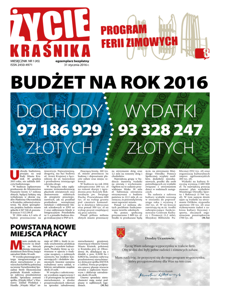 MIESIĘCZNIK NR 1 (45) ISSN 2450-4971 egzemplarz bezpłatny 31 stycznia 2016 r. BUDŻET NA ROK 2016 DOCHODY WYDATKI 97 186 929 93 328 247 złOTYCH złOTYCH U chwała budżetowa, przyjęta na sesji Rady Miasta Kraśnik 30 grudnia 2015 roku, nie zakłada deficytu budżetowego. W budżecie zaplanowano przekazanie do Ministerstwa Finansów kwoty 1,7 miliona złotych, będącej kolejną ratą wyłudzonej, w okresie rządów Platformy Obywatelskiej w Kraśniku, subwencji oświatowej. Na dzień sporządzenia projektu budżetu miasto spłaciło 4 367 546 zł, pozostało jeszcze 3 112 238 zł. W 2016 roku 4,5 mln zł będzie przeznaczone na inwestycje. Najważniejszą, drogową, ma być budowa ul. Armii Krajowej z łącznikiem do ul. Janowskiej i przebudowa istniejącego odcinka drogi. W bieżącym roku zaplanowano termomodernizację placówek oświatowych oraz dostosowanie niektórych do przepisów przeciwpożarowych, jak na przykład przebudowa wewnętrznej instalacji i oddymianie klatek schodowych w ZPO nr 2 oraz oddymianie klatek w Integracyjnym Przedszkolu nr 3, a ponadto budowa drogi ewakuacyjnej w PSP nr 6. Znaczącą kwotę, 160 tys. zł, miasto przeznaczy na budowę i doposażanie placów zabaw oraz miejsc rekreacji. W budżecie na rok 2016 zabezpieczono 200 tys. zł na remont skarpy i ogrodzenia przy Kościele Rektoralnym pw. Świętego Ducha. Przewidziano 600 tys. zł na wykup gruntu pod cmentarz komunalny w dzielnicy fabrycznej oraz ponad 300 tys. zł na wykup posesji znajdującej się przy zalewie. Ponad półtora miliona złotych miasto przeznaczy POWSTANĄ NOWE MIEJSCA PRACY M iasto znalazło nabywców na działki, na których planują rozpocząć działalność dwie firmy, mające zatrudnić blisko 50 osób. W wyniku pisemnego przetargu nieograniczonego na zbycie nieruchomości o powierzchni 0,6380 ha położonej na terenie Tarnobrzeskiej Specjalnej Strefy Ekonomicznej podstrefa Kraśnik wyłoniono nabywcę przedmiotowej działki. Sprzedana zostanie spółka „Wiejski Młyn” z Warszawy. Zakład Produkcji i Handlu „Wiejski Młyn” ist- nieje od 1980 r., kiedy to została uruchomiona produkcja pierogów i wyrobów kulinarnych. Produkty firmy są wytwarzane w oparciu o tradycyjne receptury, z rodzimych surowców, bez środków konserwujących i dodatków chemicznych. Inwestor zamierza wybudować nowy zakład, w którym zatrudnienie znajdzie około 25 osób. W związku z zakończonymi wynikiem negatywnym I i II przetargiem na sprzedaż nieruchomości, w drodze przeprowadzonych rokowań na sprzedaż zabudowanej nieruchomości gruntowej, stanowiącej własność Gminy Miasto Kraśnik, położonej w Kraśniku przy ul. Obwodowej 36, składającej się z działek o pow. 0,3038 ha i 0,0824 ha, ustalono nabywcę przedmiotowej nieruchomości, którą jest spółka EMTEX z Lublina. Firma po podpisaniu umowy planuje otwarcie szwalni z zapleczem biurowym i deklaruje zatrudnienie około 20 osób. Umowy sprzedaży nieruchomości mają zostać podpisane w najbliższych tygodniach. (M.Sz) na utrzymanie dróg oraz 1,1 mln na remonty dróg i chodników. Największą grupę w budżecie stanowią wydatki na oświatę i wychowanie. Ogółem na to zadanie przewidziano blisko 39 mln zł. Subwencja oświatowa otrzymywana z budżetu państwa to 22,5 mln zł, co oznacza, że pozostałą kwotę musi zapewnić miasto. Ponad 1,1 miliona złotych pochłonie funkcjonowanie świetlic szkolnych. Na pomoc społeczną przeznaczono 5 809 tys. zł. Środki te przekazane będą m.in. na utrzymanie Miejskiego Ośrodka Pomocy Społecznej, wypłaty zasiłków, dodatków mieszkaniowych, posiłki dla osób potrzebujących czy wydatki związane z utrzymaniem dzieci w rodzinach zastępczych. Na zadania z zakresu kultury w ydatki wzrosną w stosunku do poprzedniego roku i w yniosą 2 242 tys. zł. W tej kwocie zawierają się m.in. środki zabezpieczające funkcjonowanie Centrum Kultury i Promocji (1,2 mln), Miejskiej Biblioteki Pu- blicznej (952 tys. zł) oraz organizację kulturalnych imprez ogólnomiejskich (80 tys. zł). Wydatki na kulturę fizyczną wyniosą 2 680 000 zł. Tu największą pozycję stanowi plan wydatków Miejskiego Ośrodka Sportu i Rekreacji (1 766 tys. zł). W tym samym dziale ujęte są wydatki na utrzymanie Orlików, stypendia sportowe (50 tys. zł) oraz wykonywanie zadań z zakresu kultury fizycznej i sportu, zlecanych organizacjom pozarządowym (700 tys. zł). (M.Sz) Bliższa ciału koszula? OKIEM NACZELNEGO Na sesji, 30 grudnia, rada miasta uchwaliła plan przychodów i wydatków na rok 2016 O tym, że będzie to sesja pełna mocnych argumentów, z osobistymi wycieczkami, wiadomo było już na początku, w trakcie składania interpelacji. Otóż, dwaj liderzy opozycji, radni Piotr Iwan (niezależny) i Tadeusz Członka (SLD), zarzucili redaktorowi naczelnemu „Życia Kraśnika” manipulację w relacjonowaniu sesji, podczas której uchwalono stawki podatków lokalnych na rok 2016. Zarzut nie dotyczył podania nieprawdy w tekście, ale zdjęcia. Pod tytułem artykułu „Radni uchwalili podatki” znalazła się fotografia dokumentująca obrady. Na niej siedmiu radnych opozycji (w tym dwaj wymienieni) podnosi do góry rękę. Zdaniem P. Iwana i wtórującego mu T. Członki czytelnik mógł zrozumieć, że podatki przegłosowali podnoszący ręce. Rada miasta to 21 osób, na zdjęciu rękę podnosi siedem, a w tekście wyraźnie napisano, że podwyżkę popierała większość z klubu PiS. Należy wierzyć, że kraśniczanie, wbrew odczuciu liderów opozycji, rozumieją to, co czytają i obrazki nie zastępują im myślenia. Wróćmy jednak do debaty nad budżetem. Oświata kością niezgody - Przyznaję, że pani skarbnik udało się skonstruować budżet spokojny. Ale jest to budżet stagnacji, bowiem uwzględnia wzrost wydatków bieżących przy braku inwestycji – mówił T. Członka. Radny wypowiadając krytyczne słowa na temat budżetu silnie zaakcentował, że „pisowska większość i t