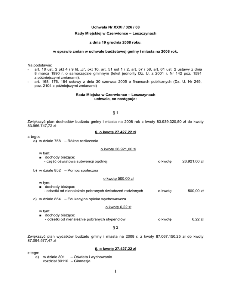 Uchwała Nr XXXI / 326 / 08 Rady Miejskiej w Czerwionce – Leszczynach z dnia 19 grudnia 2008 roku. w sprawie zmian w uchwale budżetowej gminy i miasta na 2008 rok. Na podstawie: - art. 18 ust. 2 pkt 4 i 9 lit. „c”, pkt 10, art. 51 ust 1 i 2, art. 57 i 58, art. 61 ust. 2 ustawy z dnia 8 marca 1990 r. o samorządzie gminnym (tekst jednolity Dz. U. z 2001 r. Nr 142 poz. 1591 z późniejszymi zmianami), - art. 168, 176, 184 ustawy z dnia 30 czerwca 2005 o finansach publicznych (Dz. U. Nr 249, poz. 2104 z późniejszymi zmianami) Rada Miejska w Czerwionce – Leszczynach uchwala, co następuje: §1 Zwiększyć plan dochodów budżetu gminy i miasta na 2008 rok z kwoty 83.939.320,50 zł do kwoty 83.966.747,72 zł tj. o kwotę 27.427,22 zł z tego: a) w dziale 758 – Różne rozliczenia o kwotę 26.921,00 zł w tym: ■ dochody bieżące: - część oświatowa subwencji ogólnej o kwotę 26.921,00 zł o kwotę 500,00 zł o kwotę 6,22 zł b) w dziale 852 – Pomoc społeczna o kwotę 500,00 zł w tym: ■ dochody bieżące: - odsetki od nienależnie pobranych świadczeń rodzinnych c) w dziale 854 – Edukacyjna opieka wychowawcza o kwotę 6,22 zł w tym: ■ dochody bieżące: - odsetki od nienależnie pobranych stypendiów §2 Zwiększyć plan wydatków budżetu gminy i miasta na 2008 r. z kwoty 87.067.150,25 zł do kwoty 87.094.577,47 zł tj. o kwotę 27.427,22 zł z tego: a) w dziale 801 – Oświata i wychowanie rozdział 80110 – Gimnazja 1 o kwotę 26.921,00 zł w tym: - wydatki bieżące w tym: - wynagrodzenia i pochodne od wynagrodzeń o kwotę o kwotę 26.921,00 zł 26.921,00 zł z przeznaczeniem tych środków na pokrycie kosztów związanych z wypłatą odpraw emerytalnych dla nauczycieli Gimnazjum Nr 2. b) w dziale 852 – Pomoc społeczna rozdział 85212 – Świadczenia rodzinne, zaliczka alimentacyjna oraz składki na ubezpieczenia emerytalne i rentowe z ubezpieczenia społecznego o kwotę 500,00 zł w tym: - wydatki bieżące o kwotę 500,00 zł z przeznaczeniem tych środków na zwrot odsetek związany z nienależnie pobranymi świadczeniami rodzinnymi. c) w dziale 854 – Edukacyjna opieka wychowawcza rozdział 85415 – Pomoc materialna dla uczniów o kwotę 6,22 zł w tym: - wydatki bieżące o kwotę 6,22 zł z przeznaczeniem tych środków na zwrot odsetek związanych z nienależnie pobranym stypendium. §3 Dokonać zmian w planie wydatków budżetu gminy i miasta na 2008 rok w sposób następujący: 1. Zmniejszyć plan wydatków o kwotę 54.518,00 zł, z tego: a) w dziale 710 – Działalność usługowa rozdział 71014 – Opracowania geodezyjne i kartograficzne o kwotę 5.400,00 zł w tym: - wydatki bieżące o kwotę 5.400,00 zł b) w dziale 754 – Bezpieczeństwo publiczne i ochrona przeciwpożarowa rozdział 75414 – Obrona cywilna o kwotę 500,00 zł w tym: - wydatki bieżące c) w dziale 801 o kwotę 500,00 zł o kwotę 200,00 zł – Oświata i wychowanie o kwotę 40.200,00 zł z tego: rozdział 80104 – Przedszkola o kwotę 200,00 zł w tym: - wydatki bieżące 2 rozdział 80110 – Gimnazja o kwotę 40.000,00 zł w tym: - wydatki bieżące w tym: - wynagrodzenia i pochodne o kwotę 40.000,00 zł o kwotę 40.000,00 zł o kwotę 8.418,00 zł o kwotę 8.418,00 zł o kwotę 5.400,00 zł d) w dziale 852 – Pomoc społeczna rozdział 85219 – Ośrodki pomocy społecznej o kwotę 8.418,00 zł w tym: - wydatki bieżące w tym: - wynagrodzenia i pochodne 2. Zwiększyć plan wydatków o kwotę 54.518,00 zł, z tego: a) w dziale 700 – Gospodarka mieszkaniowa rozdział 70005 – Gospodarka gruntami i nieruchomościami o kwotę 5.400,00 zł w tym: - wydatki majątkowe z przeznaczeniem tych środków na wykup drogi dojazdowej do obiektu sportowego w Przegędzy. b) w dziale 750 – Administracja publiczna rozdział 75023 – Urzędy gmin (miast i miast na prawach powiatu) o kwotę 500,00 zł w tym: - wydatki bieżące o kwotę 500,00 zł z przeznaczeniem tych środków na zakup wyposażenia i materiałów biurowych na potrzeby związane z obroną cywilną. c) w dziale 801 – Oświata i wychowanie rozdział 80104 – Przedszkola o kwotę 200,00 zł w tym: - wydatki majątkowe o kwotę 200,00 zł z przeznaczeniem na uzupełnienie środków na zakup zmywarki dla Przedszkola Nr 1. d) w dziale 852 – Pomoc społeczna o kwotę 48.418,00 zł w tym: rozdział 85212 – Świadczenia rodzinne, zaliczka alimentacyjna oraz składki na ubezpieczenia emerytalne i rentowe z ubezpieczenia społecznego o kwotę 40.000,00 zł w tym: - wydatki bieżące w tym: - wynagrodzenia i pochodne 3 o kwotę 40.000,00 zł o kwotę 40.000,00 zł z przeznaczeniem tych środków na wynagrodzenia dla pracowników Biura Świadczeń Rodzinnych. rozdział 85219 – Ośrodki pomocy społecznej o kwotę 8.418,00 zł w tym: - wydatki majątkowe o kwotę 8.418,00 zł z przeznaczeniem tych środków na realizację zadania „Monitoring wizyjny dla Ośrodka Pomocy Społecznej”. §4 Przyjąć nową treść Załącznika Nr 4 do uchwały budżetowej na 2008 r. pt. „Wieloletni Program Inwestycyjny Gminy i Miasta Czerwionka – Leszczyny na lata 2008 - 2012” w brzmieniu jak w załączniku Nr 1 do niniejszej uchwały. §5 Przyjąć nową treść Załącznika Nr 4A do uchwały budżetowej na 2008 r. pt. „Zakupy inwestycyjne Gminy i Miasta Czerwionka – Leszczyny w roku 2008” w brzmieniu jak w załączniku Nr 2 do niniejszej uchwały. §6 Przyjąć nową treść Załącznika Nr 6 do uchwały budżetowej na 2008 r. pt. „Zestawienie dochodów własnych i wydatków nimi sfinansowanych w roku 2008” w brzmieniu jak w załączniku Nr 3 do niniejszej uchwały. §7 Przyjąć nową treść Załącznika Nr 5 do uchwały budżetowej na 2008 r. pt. „Zestawienie przychodów i wydatków zakładu budżetowego pn. Zakład Gospodarki Mieszkaniowej w 2008 roku” w brzmieniu jak w załączniku Nr 4 do niniejszej uchwały. §8 Wykonanie uchwały powierza się Burmistrzowi Gminy i Miasta. §9 Uchwała wchodzi w