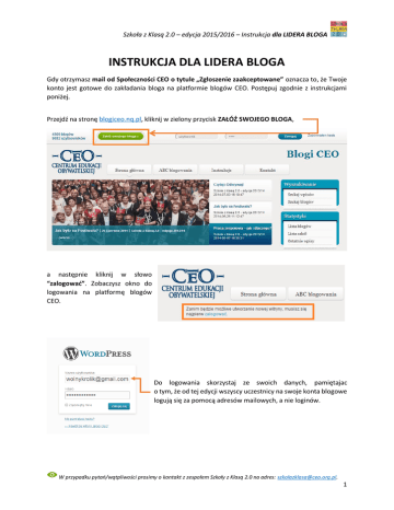 Szkoła z Klasą 2.0 – edycja 2015/2016 – Instrukcja dla LIDERA BLOGA INSTRUKCJA DLA LIDERA BLOGA Gdy otrzymasz mail od Społeczności CEO o tytule „Zgłoszenie zaakceptowane” oznacza to, że Twoje konto jest gotowe do zakładania bloga na platformie blogów CEO. Postępuj zgodnie z instrukcjami poniżej. Przejdź na stronę blogiceo.nq.pl, kliknij w zielony przycisk ZAŁÓŻ SWOJEGO BLOGA, a następnie kliknij w słowo “zalogować”. Zobaczysz okno do logowania na platformę blogów CEO. Do logowania skorzystaj ze swoich danych, pamiętajac o tym, że od tej edycji wszyscy uczestnicy na swoje konta blogowe logują się za pomocą adresów mailowych, a nie loginów. W przypadku pytań/wątpliwości prosimy o kontakt z zespołem Szkoły z Klasą 2.0 na adres: [email protected]. 1 Szkoła z Klasą 2.0 – edycja 2015/2016 – Instrukcja dla LIDERA BLOGA Po zalogowaniu zobaczysz ekran zakładania własnej witryny – własnego bloga na platformie blogów CEO: tutaj na liście rozwijanej zobaczysz program/programy, do których się zgłosiłeś/zgłosiłaś z chęcią założenia bloga. Jeśli jest ich więcej niż jeden, zwróć szczególną uwagę, w którym programie zakładasz blog. tutaj wpisz słowo/słowa, które ciekawie scharakteryzują Twój blog. Nazwa witryny może składać się wyłącznie z małych liter i cyfr (pamiętaj, aby nie używać polskich znaków i spacji!) i będzie częścią internetowego adresu Twojego bloga, np. jeśli w to pole wpiszesz pietruszka, adres Twojego bloga będzie wyglądał tak: http://blogiceo.nq.pl/pietruszka UWAGA: Nazwy witryny nie będziesz mógł/mogła edytować [zmieniać]. tutaj wpisz słowo/zdanie, które będzie widoczne w nagłówku Twojego bloga, np. Blog trzecioklasistów z Wrocławia. UWAGA: Tytuł witryny będziesz mógł/mogła później edytować [zmienić]. Przykład prawidłowo wypełnionych pól wygląda tak: Jeśli wszystkie pola zostały przez Ciebie uzupełnionione, przeczytaj i zaaakceptuj Regulamin platformy blogów CEO [NAJLEPIEJ PRZECZYTAJ GO WSPÓLNIE Z NAUCZYCIELEM], a następnie kliknij przycisk UTWÓRZ WITRYNĘ. GOTOWE! W przypadku pytań/wątpliwości prosimy o kontakt z zespołem Szkoły z Klasą 2.0 na adres: [email protected]. 2 Szkoła z Klasą 2.0 – edycja 2015/2016 – Instrukcja dla LIDERA BLOGA Wyswietli Ci się poniższy komunikat: Kliknij w link aby przejść do swojego bloga. W przypadku pytań/wątpliwości prosimy o kontakt z zespołem Szkoły z Klasą 2.0 na adres: [email protected]. 3 Szkoła z Klasą 2.0 – edycja 2015/2016 – Instrukcja dla LIDERA BLOGA Tak wygląda Twój blog dla wszystkich odwiedzających. Zwróć uwagę na: W pasku adresu jest link [adres internetowy] do Twojego bloga; Na górze, na czarnym pasku znajdują się przyciski, z których na pewno będziesz często korzystać podczas pracy na blogu; o Po prawej stronie będzie widoczny napis: “Jak się masz, … [twój E-MAIL bez znaku @]” o Po lewej stronie będzie widoczny przycisk “Moje witryny”, który [po najechaniu kursorem myszki] rozwija się i pokazuje tytuły wszystkich blogów, które są założone na twoim koncie. Tytuł witryny rozwija się i pokazuje opcje: Kokpit, Nowy wpis, Zarządzaj komentarzami i Przejdź do strony. Tytuł bloga, który wprowadziłeś/aś podczas zakładania bloga; Pierwszy wpis “Witaj, świecie!” – powstaje automatycznie i jest taki sam na wszystkich nowych blogach; Po prawej stronie znajduje się pole z widżetami. Pierwszy z nich to widżet, który pokazuje ikonę i nazwę programu, w którym założyłeś/aś blog – ważne, aby była to Szkoła z Klasą 2.0 – edycja 2015/16. UWAGA: jeśli w tym miejscu wyświetla się nazwa innego programu lub nie zgadza się edycja Szkoły z Klasą 2.0 – napisz na adres: [email protected] – pomożemy Ci to naprawić. W przypadku pytań/wątpliwości prosimy o kontakt z zespołem Szkoły z Klasą 2.0 na adres: [email protected]. 4 Szkoła z Klasą 2.0 – edycja 2015/2016 – Instrukcja dla LIDERA BLOGA Na samym dole po prawej stronie znajdziesz widżet META – zapamiętaj go, będzie służył do logowania/wylogowania z bloga i szybkiego wchodzenia na zaplecze [kokpit] Twojego bloga. *** WARTO PRZECZYTAĆ: Pierwsze kroki na blogu. Blogi grupowe – ważne rady. Poradniki blogera. Pomoc techniczna. W przypadku pytań/wątpliwości prosimy o kontakt z zespołem Szkoły z Klasą 2.0 na adres: [email protected]. 5