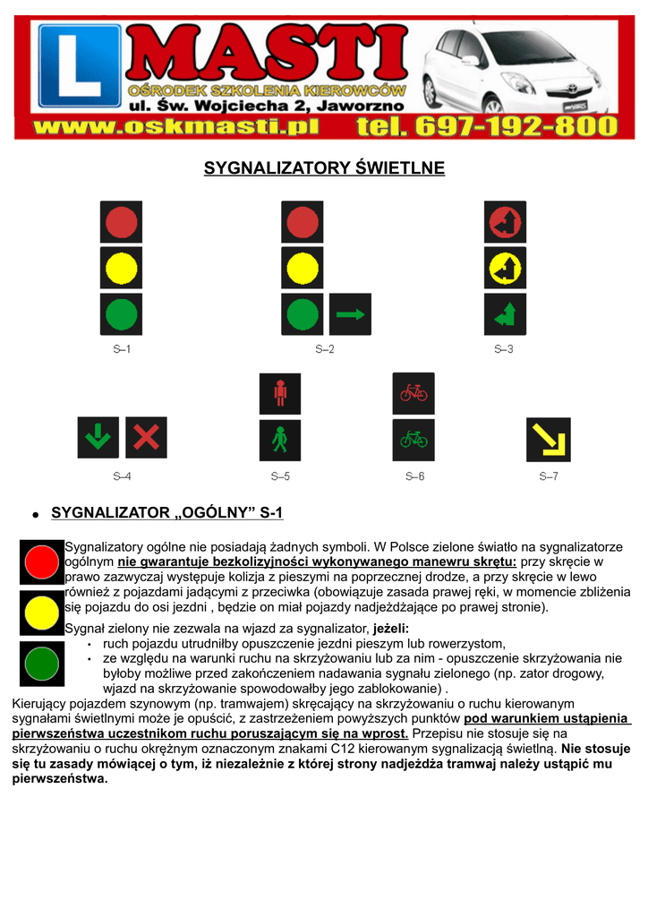 SYGNALIZATORY ŚWIETLNE ● SYGNALIZATOR „OGÓLNY” S-1 Sygnalizatory ogólne nie posiadają żadnych symboli. W Polsce zielone światło na sygnalizatorze ogólnym nie gwarantuje bezkolizyjności wykonywanego manewru skrętu: przy skręcie w prawo zazwyczaj występuje kolizja z pieszymi na poprzecznej drodze, a przy skręcie w lewo również z pojazdami jadącymi z przeciwka (obowiązuje zasada prawej ręki, w momencie zbliżenia się pojazdu do osi jezdni , będzie on miał pojazdy nadjeżdżające po prawej stronie). Sygnał zielony nie zezwala na wjazd za sygnalizator, jeżeli: • ruch pojazdu utrudniłby opuszczenie jezdni pieszym lub rowerzystom, • ze względu na warunki ruchu na skrzyżowaniu lub za nim - opuszczenie skrzyżowania nie byłoby możliwe przed zakończeniem nadawania sygnału zielonego (np. zator drogowy, wjazd na skrzyżowanie spowodowałby jego zablokowanie) . Kierujący pojazdem szynowym (np. tramwajem) skręcający na skrzyżowaniu o ruchu kierowanym sygnałami świetlnymi może je opuścić, z zastrzeżeniem powyższych punktów pod warunkiem ustąpienia pierwszeństwa uczestnikom ruchu poruszającym się na wprost. Przepisu nie stosuje się na skrzyżowaniu o ruchu okrężnym oznaczonym znakami C12 kierowanym sygnalizacją świetlną. Nie stosuje się tu zasady mówiącej o tym, iż niezależnie z której strony nadjeżdża tramwaj należy ustąpić mu pierwszeństwa. ● SYGNALIZATOR „WARUNKOWY” S-2 Nadawany przez sygnalizator S-2 sygnał czerwony wraz z sygnałem w kształcie zielonej strzałki oznacza, że dozwolone jest skręcanie w kierunku wskazanym strzałką w najbliższą jezdnię na skrzyżowaniu, z zastrzeżeniem spełnienia dwóch warunków: -zatrzymania się przed sygnalizatorem -nie spowodowania utrudnienia ruchu innym jego uczestnikom (należy ustąpić pierwszeństwa innym pojazdom). Na sygnalizatorze tym zezwala się również na zawracanie (w przypadku strzałki w lewo, ze skrajnego pasa lewego) pod warunkiem, że nie zabrania tego znak „zakaz zawracania”. NIE WOLNO MYLIĆ SYGNALIZATORA WARUNKOWEGO Z SYGNALIZATOREM KIERUNKOWYM!!! ● SYGNALIZATOR „KIERUNKOWY” S-3 Sygnały świetlne nadawane przez sygnalizator kierunkowy S-3 dotyczą kierujących jadących w kierunkach wskazanych strzałką (strzałkami). Sygnał zielony nadawany przez sygnalizator kierunkowy S-3 oznacza, że podczas jazdy we wskazanym kierunku nie występuje kolizja z innymi uczestnikami ruchu – przejazd jest bezkolizyjny. Oznacza to, iż na swojej drodze nie powinniśmy napotkać innego uczestnika ruchu. Sygnalizatory kierunkowe S-3 nadające sygnały przeznaczone tylko dla pojazdów skręcających w lewo mogą nie być umieszczone po prawej stronie drogi. Sygnalizator kierunkowy posiadający tylko strzałkę w lewo nie zezwala na zawracanie!!! OPRACOWANIE: OSK MASTI źródło: internet, informacje własne.