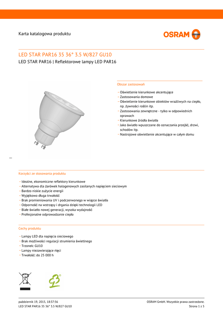 Karta katalogowa produktu LED STAR PAR16 35 36° 3.5 W/827 GU10 LED STAR PAR16 | Reflektorowe lampy LED PAR16 Obszar zastosowań _ Oświetlenie kierunkowe akcentujące _ Zastosowania domowe _ Oświetlenie kierunkowe obiektów wrażliwych na ciepło, np. żywności roślin itp. _ Zastosowania zewnętrzne - tylko w odpowiednich oprawach _ Kierunkowe źródła światła _ Jako światło wpuszczane do oznaczania przejść, drzwi, schodów itp. _ Nastrojowe oświetlenie akcentujące w całym domu __ Korzyści ze stosowania produktu _ Idealne, ekonomiczne reflektory kierunkowe _ Alternatywa dla żarówek halogenowych zasilanych napięciem sieciowym _ Bardzo niskie zużycie energii _ Wyjątkowo długa trwałość _ Brak promieniowania UV i podczerwonego w wiązce światła _ Odporność na wstrząsy i drgania dzięki technologii LED _ Białe światło nowej generacji, wysoka wydajność _ Profesjonalne odprowadzanie ciepła Cechy produktu _ Lampy LED dla napięcia sieciowego _ Brak możliwości regulacji strumienia świetlnego _ Trzonek: GU10 _ Lampy niezawierające rtęci _ Trwałość: do 25 000 h październik 19, 2015, 18:37:56 LED STAR PAR16 35 36° 3.5 W/827 GU10 OSRAM GmbH. Wszystkie prawa zastrzeżone. Strona 1 z 5 Karta katalogowa produktu Dane techniczne Dane elektryczne Moc znamionowa 3,10 W Moc znamionowy 3,50 W Napięcie znamionowy 230 V Ekwiwalentna moc żarówki 35 W Częstotliwość pracy 50…60 Hz Współczynnik mocy λ 0,51 Dane fotometryczne __ Światłość 565 cd Znamionowy strumień świetlny 230 lm Znamionowy strumień świetlny 230 lm Temperatura barwowa 2700 K Ogólny wskaźnik oddawania barw Ra 80 Barwa światła zgodna z EN 12464-1 Warm White Standardowe odchylenie dopasowania barw ≤6 sdcm Nominalny użyteczny strumień świetln 90° 230 lm Znamionowy użyteczny strumień świetl 90° 230 lm Znamionowa maksymalna światłość 565 cd Dane świetlne Kąt rozsyłu światła 36 ° Czas startu (60 %) 0,30 s Czas startu 0,1 s Nominalny kąt rozsyłu światła 36 ° Znamionowy kąt rozsyłu (kąt użyteczny) 36,00 ° październik 19, 2015, 18:37:56 LED STAR PAR16 35 36° 3.5 W/827 GU10 OSRAM GmbH. Wszystkie prawa zastrzeżone. Strona 2 z 5 Karta katalogowa produktu Wymiary i waga Długość całkowita 58,0 mm Średnica 49,6 mm Bańka zewnętrzna PAR51 Długość 58,0 mm Maksymalna średnica 50,0 mm Trwałość __ Znamionowa trwałość 15000 h Trwałość 15000 h Liczba cykli włączeniowych 100000 Wsp. zachowania str. świetlnego 0,70 Dodatkowe dane produktu Trzonek (standardowe rozwiązanie) GU10 Nominalna zawartość rtęci 0,0 mg Nie zawiera rtęci Tak Zgodnie z Dyrektywą WEEE Tak Uwaga dotycząca produktu Wszystkie parametry techniczne odnoszą się do kompletnej lampy/Ze względu na skomplikowany proces produkcji diod elektroluminescencyjnych (LED), typowe podawane wartości parametrów technicznych LED są czysto statystycznymi wartościami, które mogą się różnić od rzeczywistych parametrów technicznych poszczególnych produktów. Możliwości Ściemnianie Nie Certyfikaty i Normy październik 19, 2015, 18:37:56 LED STAR PAR16 35 36° 3.5 W/827 GU10 OSRAM GmbH. Wszystkie prawa zastrzeżone. Strona 3 z 5 Karta katalogowa produktu Klasa efektywności energetycznej A+ Zużycie energii 4 kWh/1000h Kraj - specyficzna kategoryzacja Międzynarodowy system kodowania DRPAR-4,5-100-240-GU10-50/36 Oznaczenie produktu STPAR163536 3.5 Rozsył światła __ Rozkład widmowy promieniowania Dane logistyczne Kod produktu Opis produktu Opakowanie (liczba produktów / opakowanie) Wymiary (długość x szerokość x wysokość) Objętość Waga brutto 4052899910348 LED STAR PAR16 35 36° 3.5 W/827 GU10 Karton wysylkowy 4 319 mm x 154 mm x 134 mm 6.58 dm³ 466.00 g 4052899910348 LED STAR PAR16 35 36° 3.5 W/827 GU10 Karton wysylkowy 6 319 mm x 154 mm x 134 mm 6.58 dm³ 638.00 g Wymieniony kod produktu oznacza najmniejszą ilość produktu, jaka może być zamówiona. Jednostka transportowa może zawierać jedną sztukę lub więcej. Składając zamówienie prosimy o zamawianie ilości odpowiadających jednej lub wielokrotności jednostki transportowej. październik 19, 2015, 18:37:56 LED STAR PAR16 35 36° 3.5 W/827 GU10 OSRAM GmbH. Wszystkie prawa zastrzeżone. Strona 4 z 5 Karta katalogowa produktu Odnośniki/łącza Więcej produktów i aktualne informacje na temat lamp LED na stronie www.osram.pl/ledlamps Gwarancja, patrz www.osram.pl/gwarancja Oświadczenie Zastrzega się możliwość zmian bez uprzedzenia. Błędy i ominięcia są możliwe. Należy zawsze upewnić się czy korzystasz z najnowszej wersji katalogu. __ październik 19, 2015, 18:37:56 LED STAR PAR16 35 36° 3.5 W/827 GU10 OSRAM GmbH. Wszystkie prawa zastrzeżone. Strona 5 z 5