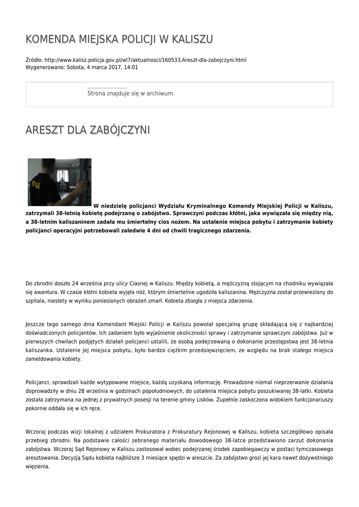 KOMENDA MIEJSKA POLICJI W KALISZU Źródło: http://www.kalisz.policja.gov.pl/wl7/aktualnosci/160533,Areszt-dla-zabojczyni.html Wygenerowano: Sobota, 4 marca 2017, 14:01 Strona znajduje się w archiwum. ARESZT DLA ZABÓJCZYNI W niedzielę policjanci Wydziału Kryminalnego Komendy Miejskiej Policji w Kaliszu, zatrzymali 38-letnią kobietę podejrzaną o zabójstwo. Sprawczyni podczas kłótni, jaka wywiązała się między nią, a 38-letnim kaliszaninem zadała mu śmiertelny cios nożem. Na ustalenie miejsca pobytu i zatrzymanie kobiety policjanci operacyjni potrzebowali zaledwie 4 dni od chwili tragicznego zdarzenia. Do zbrodni doszło 24 września przy ulicy Ciasnej w Kaliszu. Między kobietą, a mężczyzną stojącym na chodniku wywiązała się awantura. W czasie kłótni kobieta wyjęła nóż, którym śmiertelnie ugodziła kaliszanina. Mężczyzna został przewieziony do szpitala, niestety w wyniku poniesionych obrażeń zmarł. Kobieta zbiegła z miejsca zdarzenia. Jeszcze tego samego dnia Komendant Miejski Policji w Kaliszu powołał specjalną grupę składającą się z najbardziej doświadczonych policjantów. Ich zadaniem było wyjaśnienie okoliczności sprawy i zatrzymanie sprawczyni zabójstwa. Już w pierwszych chwilach podjętych działań policjanci ustalili, że osobą podejrzewaną o dokonanie przestępstwa jest 38-letnia kaliszanka. Ustalenie jej miejsca pobytu, było bardzo ciężkim przedsięwzięciem, ze względu na brak stałego miejsca zameldowania kobiety. Policjanci, sprawdzali każde wytypowane miejsce, każdą uzyskaną informację. Prowadzone niemal nieprzerwanie działania doprowadziły w dniu 28 września w godzinach popołudniowych, do ustalenia miejsca pobytu poszukiwanej 38-latki. Kobieta została zatrzymana na jednej z prywatnych posesji na terenie gminy Lisków. Zupełnie zaskoczona widokiem funkcjonariuszy pokornie oddała się w ich ręce. Wczoraj podczas wizji lokalnej z udziałem Prokuratora z Prokuratury Rejonowej w Kaliszu, kobieta szczegółowo opisała przebieg zbrodni. Na podstawie całości zebranego materiału dowodowego 38-latce przedstawiono zarzut dokonania zabójstwa. Wczoraj Sąd Rejonowy w Kaliszu zastosował wobec podejrzanej środek zapobiegawczy w postaci tymczasowego aresztowania. Decyzją Sądu kobieta najbliższe 3 miesiące spędzi w areszcie. Za zabójstwo grozi jej kara nawet dożywotniego więzienia. Ocena: 0/5 (0) Tweetnij