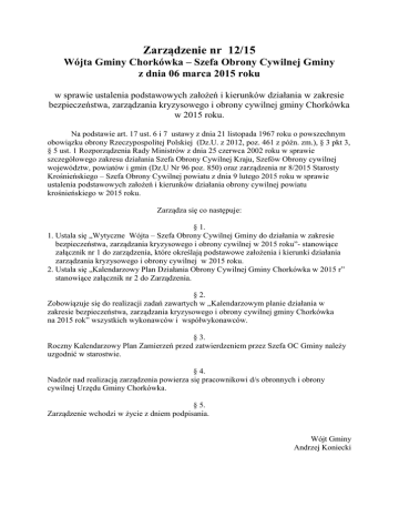 Zarządzenie nr 12/15 Wójta Gminy Chorkówka – Szefa Obrony Cywilnej Gminy z dnia 06 marca 2015 roku w sprawie ustalenia podstawowych założeń i kierunków działania w zakresie bezpieczeństwa, zarządzania kryzysowego i obrony cywilnej gminy Chorkówka w 2015 roku. Na podstawie art. 17 ust. 6 i 7 ustawy z dnia 21 listopada 1967 roku o powszechnym obowiązku obrony Rzeczypospolitej Polskiej (Dz.U. z 2012, poz. 461 z późn. zm.), § 3 pkt 3, § 5 ust. 1 Rozporządzenia Rady Ministrów z dnia 25 czerwca 2002 roku w sprawie szczegółowego zakresu działania Szefa Obrony Cywilnej Kraju, Szefów Obrony cywilnej województw, powiatów i gmin (Dz.U Nr 96 poz. 850) oraz zarządzenia nr 8/2015 Starosty Krośnieńskiego – Szefa Obrony Cywilnej powiatu z dnia 9 lutego 2015 roku w sprawie ustalenia podstawowych założeń i kierunków działania obrony cywilnej powiatu krośnieńskiego w 2015 roku. Zarządza się co następuje: § 1. 1. Ustala się „Wytyczne Wójta – Szefa Obrony Cywilnej Gminy do działania w zakresie bezpieczeństwa, zarządzania kryzysowego i obrony cywilnej w 2015 roku”- stanowiące załącznik nr 1 do zarządzenia, które określają podstawowe założenia i kierunki działania zarządzania kryzysowego i obrony cywilnej w 2015 roku. 2. Ustala się „Kalendarzowy Plan Działania Obrony Cywilnej Gminy Chorkówka w 2015 r” stanowiące załącznik nr 2 do Zarządzenia. § 2. Zobowiązuje się do realizacji zadań zawartych w „Kalendarzowym planie działania w zakresie bezpieczeństwa, zarządzania kryzysowego i obrony cywilnej gminy Chorkówka na 2015 rok” wszystkich wykonawców i współwykonawców. § 3. Roczny Kalendarzowy Plan Zamierzeń przed zatwierdzeniem przez Szefa OC Gminy należy uzgodnić w starostwie. § 4. Nadzór nad realizacją zarządzenia powierza się pracownikowi d/s obronnych i obrony cywilnej Urzędu Gminy Chorkówka. § 5. Zarządzenie wchodzi w życie z dniem podpisania. Wójt Gminy Andrzej Koniecki Załącznik Nr 1 do zarządzenia Wójta Gminy Chorkówka Nr 12 /15 z dnia 6 marca 2015 r. WYTYCZNE Wójta Gminy – Szefa Obrony Cywilnej Gminy Chorkówka w zakresie bezpieczeństwa, zarządzania kryzysowego i obrony cywilnej gminy Chorkówka w 2015 roku Zasadniczym celem działań podejmowanych w zakresie bezpieczeństwa, zarządzania kryzysowego i obrony cywilnej gminy w 2015 roku będzie doskonalenie obecnie obowiązujących rozwiązań organizacyjno-prawnych w dziedzinie obrony cywilnej, dostosowywanie ich do aktualnych wyzwań i potrzeb W dziedzinie bezpieczeństwa, w tym ze szczególnym uwzględnieniem zagadnień związanych z planowaniem, wykrywaniem zagrożeń, ostrzeganiem i alarmowaniem, dostosowywaniem struktur formacji OC do obowiązujących normatywów sprzętowych oraz zintensyfikowanie działań w zakresie edukacji, w tym edukacji społeczeństwa w ramach powszechnej samoobrony ludności. Realizacja zadań obrony cywilnej skoncentrowana będzie na: 1/ wdrożeniu do bieżącej działalności wytycznych Szefa Obrony Cywilnej Kraju z dnia 3 marca 2014 roku w sprawie normatywów w zakresie zaopatrywania organów i formacji obrony cywilnej w sprzęt, środki techniczne i umundurowanie niezbędne do wykonywania zadań obrony cywilnej. 2/ kontynuacji zadań mających na celu tworzenie regulacji prawnych określających organizację i funkcjonowanie obrony cywilnej w Polsce. 3/ analizowaniu istniejących rozwiązań w dziedzinie obrony cywilnej mając na uwadze Potrzeby występujące w zakresie bezpieczeństwa. 4/ prowadzeniu działań doskonalących w zakresie: planowania, szkolenia, systemów wykrywania zagrożeń, ostrzegani i alarmowania. Celem zapewnienia właściwego poziomu przygotowań obrony cywilnej w 2015 r. należy: I. W zakresie organizacyjnym : 1/ integrować i rozwijać współpracę pomiędzy organami rządowymi i samorządowymi w zakresie funkcjonowania systemów obserwacji , pomiarów, analiz prognozowania i powiadamiania o skażeniach i innych zagrożeniach dla ludzi; 2/ wzmacniać zdolność struktur administracyjnych do funkcjonowania w sytuacjach kryzysowych i wspierania obrony państwa. II. W zakresie planowania. 1/ dążyć do włączenia jak największej liczby jednostek ochotniczych straży pożarnych w struktury obrony cywilnej poprzez nadanie ich członkom przydziałów organizacyjno-mobilizacyjnych, 2/ dokonać sprawdzenia i weryfikacji kart przydziałów organizacyjno-mobilizacyjnych wszystkich członków formacji obrony cywilnej oraz uzgodnień w tym zakresie w WKU. 3/ prowadzić bieżąca aktualizację planów obrony cywilnej gminy. 4/ opracować ocenę w zakresie ochrony ludności i obrony cywilnej za 2014 r. wg wytycznych Szefa Obrony Cywilnej Kraju z dnia 10 lipca 2009 roku. 5/ dokonać analizy realizacji wytycznych Szefa Obrony Cywilnej Kraju do działalności w dziedzinie obrony cywilnej w 2014 roku. 6/ dokonać aktualizacji planów ochrony zabytków na terenie gminy. III. W zakresie edukacji. 1/ kontynuować edukację społeczeństwa w zakresie rodzajów alarmów i sygnałów alarmowych oraz komunikatów ostrzegawczych, a także zasad postępowania po ich usłyszeniu. 2/ prowadzić szkolenia w obszarze obrony cywilnej i ochrony ludności zgodnie z Wytycznymi Szefa Obrony Cywilnej Kraju z dnia 21 kwietnia 2009 r. w sprawie zasad organizacji i sposobu przeprowadzania szkoleń z zakresu ochrony ludności i obrony cywilnej. 3/ realizować ćwiczenia struktur i organów OC zgodnie Wytycznymi Szefa Obrony Cywilnej Kraju z dnia 23 listopada 2012 roku w sprawie organizowania ćwiczeń obrony cywilnej oraz poradnikiem metodycznym przygotowania i prowadzenia 4/ pozyskiwać i kierować na szkolenia kandydatów na instruktorów OC. 5/ kontynuować propagowanie wiedzy wśród ludności cywilnej i pracowników zakładów pracy w obszarze powszechnej samoobrony dot. potencjalnych zagrożeń czasu wojny i pokoju oraz sposobów zapobiegania tym zagrożeniom z wykorzystaniem środków masowego przekazu, stron inte