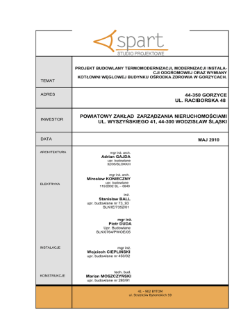 TEMAT PROJEKT BUDOWLANY TERMOMODERNIZACJI, MODERNIZACJI INSTALACJI ODGROMOWEJ ORAZ WYMIANY KOTŁOWNI WĘGLOWEJ BUDYNKU OŚRODKA ZDROWIA W GORZYCACH. ADRES INWESTOR 44-350 GORZYCE UL. RACIBORSKA 48 POWIATOWY ZAKŁAD ZARZĄDZANIA NIERUCHOMOŚCIAMI UL. WYSZYŃSKIEGO 41, 44-300 WODZISŁAW ŚLĄSKI DATA ARCHITEKTURA MAJ 2010 mgr inŜ. arch. Adrian GAJDA upr. budowlane 32/05/SLOKK/II mgr inŜ. arch. Mirosław KONIECZNY ELEKTRYKA upr. budowlane 115/2002 SL – 0840 inŜ. Stanisław BALL upr. budowlane nr 73_93 SLK/IE/7352/01 mgr inŜ. Piotr DUDA Upr. Budowlane SLK/0764/PWOE/05 INSTALACJE mgr inŜ. Wojciech CIEPLIŃSKI upr. budowlane nr 450/02 tech. bud. KONSTRUKCJE Marian MOSZCZYŃSKI upr. budowlane nr 280/91 41 – 902 BYTOM ul. Strzelców Bytomskich 59 1 ZAWARTOŚĆ PROJEKTU W CZĘŚCI ARCHITEKTONICZNEJ 1. 2. 3. 4. Strona tytułowa. Zawartość projektu. Opis techniczny. Część rysunkowa 4.1. 4.2. 4.3. nr I.2 4.4. 4.5. 4.6. 4.7. 4.8. 4.9. 4.10. 4.11. 4.12. 4.13. 4.14. 4.15. 4.16. 4.17. 4.18. 4.19. 4.20. 4.21. 4.22. 4.23. 4.24. Lokalizacja Elewacja południowa – stan istniejący Elewacja północprzyrynnna – stan istniejący skala rys. nr Z.1 skala 1:100 rys. nr I.1 skala 1:100 rys. Elewacja zachodnia – stan istniejący Elewacja wschodnia – stan istniejący Elewacja południowa – stan projektowany Elewacja północna – stan projektowany Elewacja zachodnia – stan projektowany Elewacja wschodnia – stan projektowany Likwidacja zsypów Zestawienie stolarki Przekrój ocieplenia stropodachu Detale cz. 1 Detale cz. 2 Detale cz. 3 Detale cz. 4 Detale cz. 5 Detale cz. 6 Detale cz. 7 Detale cz. 8 Detale cz. 9 Detale cz. 10 Likwidacja pasa przyrynnowego Sposób mocowania zadaszeń skala 1:100 skala 1:100 skala 1:100 skala 1:100 skala 1:100 skala 1:100 skala 1:100 skala - skala 1:100 skala 1:5 skala 1:20 skala - skala - skala - skala - skala - skala - skala - skala - skala 1:20 skala - - rys. nr I.3 rys. nr I.4 rys. nr A.1 rys. nr A.2 rys. nr A.3 rys. nr A.4 rys. nr A.5 rys. nr A.6 rys. nr A.7 rys. nr S.1 rys. nr S.2 rys. nr S.3 rys. nr S.4 rys. nr S.5 rys. nr S.6 rys. nr S.7 rys. nr S.8 rys. nr S.9 rys. nr S.10 rys. nr S.11 rys. nr S.12 2 OŚWIADCZENIE PROJEKTANTA LUB OSOBY SPRAWDZAJĄCEJ PROJEKT BUDOWLANY Zgodnie z art. 20 ust. 4 ustawy z dnia 07.07.1994r. Prawo budowlane (Dz.U.Nr 207 poz. 2016 z 2003r. Z róŜn. zm.) niniejszym oświadczam, Ŝe projekt budowlany pt:. PROJEKT BUDOWLANY TERMOMODERNIZACJI, MODERNIZACJI INSTALACJI ODGROMOWEJ ORAZ WYMIANY KOTŁOWNI WĘGLOWEJ BUDYNKU OŚRODKA ZDROWIA W GORZYCACH. (podać nazwę projektu budowlanego i adresu inwestycji) sporządzony dla: POWIATOWY ZAKŁAD ZARZĄDZANIA NIERUCHOMOŚCIAMI UL. WYSZYŃSKIEGO 41, 44-300 WODZISŁAW ŚLĄSKI (podać Inwestora) został wykonany zgodnie z obowiązującymi przepisami oraz zasadami wiedzy technicznej. mgr inŜ. arch. Adrian GAJDA upr. budowlane 32/05/SLOKK/II SL-1121 inŜ. Stanisław BALL upr. budowlane nr 73_93 SLK/IE/7352/01 mgr inŜ. Piotr DUDA upr. budowlane SLK/0764/PWOE/05 mgr inŜ. Wojciech CIEPLIŃSKI upr. budowlane nr 450/02 tech. bud. Marian MOSZCZYŃSKI upr. budowlane nr 280/91 mgr inŜ. arch. MIROSŁAW KONIECZNY upr. budowlane 115/2002 SL – 0840 3 A. PODMIOTY OPRACOWANIA ZAMAWIAJĄCY : POWIATOWY ZAKŁAD ZARZĄDZANIA NIERUCHOMOŚCIAMI UL. WYSZYŃSKIEGO 41, 44-300 WODZISŁAW ŚLĄSKI WYKONAWCA : STUDIO PROJEKTOWE SPART S.C. UL. STRZELCÓW BYTOMSKICH 59 41 – 902 BYTOM 3.2. B. Uzgodnienia z Inwestorem. C. Wizja lokalna. D. Obowiązujące normy i przepisy w zakresie projektowania. PRZEDMIOT I ZAKRES OPRACOWANIA Przedmiotem opracowania jest projekt budowlany termomodernizacji oraz zmiany kolorystyki elewacji budynku Ośrodka Zdrowia w Gorzycach. Dodatkowo projekt przewiduje modernizację instalacji odgromowej oraz wymianę kotłowni węglowej. 3.3. INWESTOR, UśYTKOWNIK I WŁAŚCICIEL TERENU Inwestorem powyŜszego zadania projektowego jest Powiatowy Zakład Zarządzania Nieruchomościami z siedzibą w Wodzisławiu Śląskim przy ul. Wyszyńskiego 41. Inwestor posiada wszystkie zaświadczenia umoŜliwiające mu wykonanie powyŜszych prac projektowych. 3.4. LOKALIZACJA Przedmiotowa inwestycja zlokalizowana jest przy ul. Raciborskiej 48 w Gorzycach koło Wodzisławia Śląskiego. 4 3.5. STAN ISTNIEJĄCY PODSTAWOWE PARAMETRY BRYŁY BUDYNKU. Przedmiotem opracowania jest dwukondygnacyjny, podpiwniczony, zwieńczony płaskim stropodachem, budynek Ośrodka Zdrowia. Kształt budynku nieregularny, w obrysie zbliŜony do kształtu litery „T”. Skrajne wymiary obiektu to: długość( w osi Wschód-Zachód ) – 25,8m, szerokość 26,5m( w osi Północ-Południe), natomiast wysokość budynku w najwyŜszym jego punkcie wynosi ok. 9,3m ponad poziom terenu. Grubość ścian zewnętrznych budynku to 40 cm. Główne wejścia do budynku znajdują się od strony południowej, ponadto od strony wschodniej usytuowane jest dodatkowe wejście oraz pochylnia, ułatwiająca wejście osobom poruszającym się na wózkach inwalidzkich. Od strony zachodniej zlokalizowane jest zadaszone zejście na poziom piwnic. Od strony północnej znajdują się zsypy słuŜące składowaniu opału dla kotłowni mieszczącej się na poziomie piwnicy opracowywanego budynku. ELEWACJA. Projekt termomodernizacji oraz zmiany kolorystyki dotyczy kaŜdej elewacji budynku. Obecnie pokrycie ścian zewnętrznych stanowi : - cokół do wysokości poziomu posadzki parteru, w projekcie przyjętym jako poziom ±0,00 ) - płytki klinkierowe, w kolorze Ŝółtym; - powyŜej cokołu - tynk cementowo-wapienny w kolorze szarym. - istniejąca stolarka okienna z profili PCV i drewna, w kolorze białym - istniejąca stolarka drzwiowa z profili aluminiowych (kolor czerwony) oraz profili stalowych( kolor brązowy) - zadaszenia nad wejściami z blachy trapezowej 3.6. STAN PROJEKTOWANY ELEWACJA Zakłada się prace polegające na dociepleniu elewacji budynku styropianem o grubości 14 cm • W części Południowej budynku projektuje się docieplenie budynku