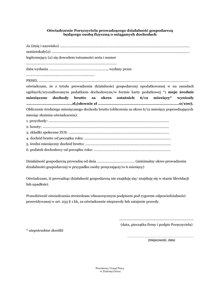 Oświadczenie Poręczyciela prowadzącego działalność gospodarczą będącego osobą fizyczną o osiąganych dochodach Ja (imię i nazwisko) ................................................................................................................................... zamieszkały(a) ........................................................................................................................................... legitymujący (a) się dowodem tożsamości seria i numer ........................................................................................... data wydania ………….…..........................................., wydany przez ………….……....……...……………………............. PESEL ....................................................................................................................................................... oświadczam, że z tytułu prowadzenia działalności gospodarczej opodatkowanej w na zasadach ogólnych/zryczałtowanym podatkiem dochodowym/w formie karty podatkowej *) moje średnie miesięczne dochody brutto za okres ostatnich 6/12 miesięcy* wyniosły …...................................zł,(słownie zł ...................................................................0/100). Obliczenie średniego miesięcznego dochodu brutto (obliczenia za okres 6/12 miesięcy poprzedzających miesiąc złożenia oświadczenia): 1. przychody: ......................................................................................................................... 2. koszty: ............................................................................................................................... 3. składki społeczne ZUS: ..................................................................................................... 4. dochód brutto od początku roku: ....................................................................................... 5. średni miesięczny dochód brutto: ...................................................................................... 6. podatek dochodowy od początku roku: ............................................................................. Działalność gospodarczą prowadzę od dnia ……………………………….. (minimalny okres prowadzenia działalności gospodarczej w przypadku osoby poręczającej to 6 miesięcy) Oświadczam, iż prowadząc działalność gospodarczą nie znajduję się/ znajduję się w stanie likwidacji lub upadłości. Prawdziwość oświadczenia stwierdzam własnoręcznym podpisem pod rygorem odpowiedzialności przewidywanej w art. 233 § 1 kk, za oświadczenie nieprawdy lub zatajenie prawdy. ........................................................................... (data, pieczątka firmy i podpis Poręczyciela) * niepotrzebne skreślić ……………………………………………… (miejscowość, data) Powiatowy Urząd Pracy w Zielonej Górze