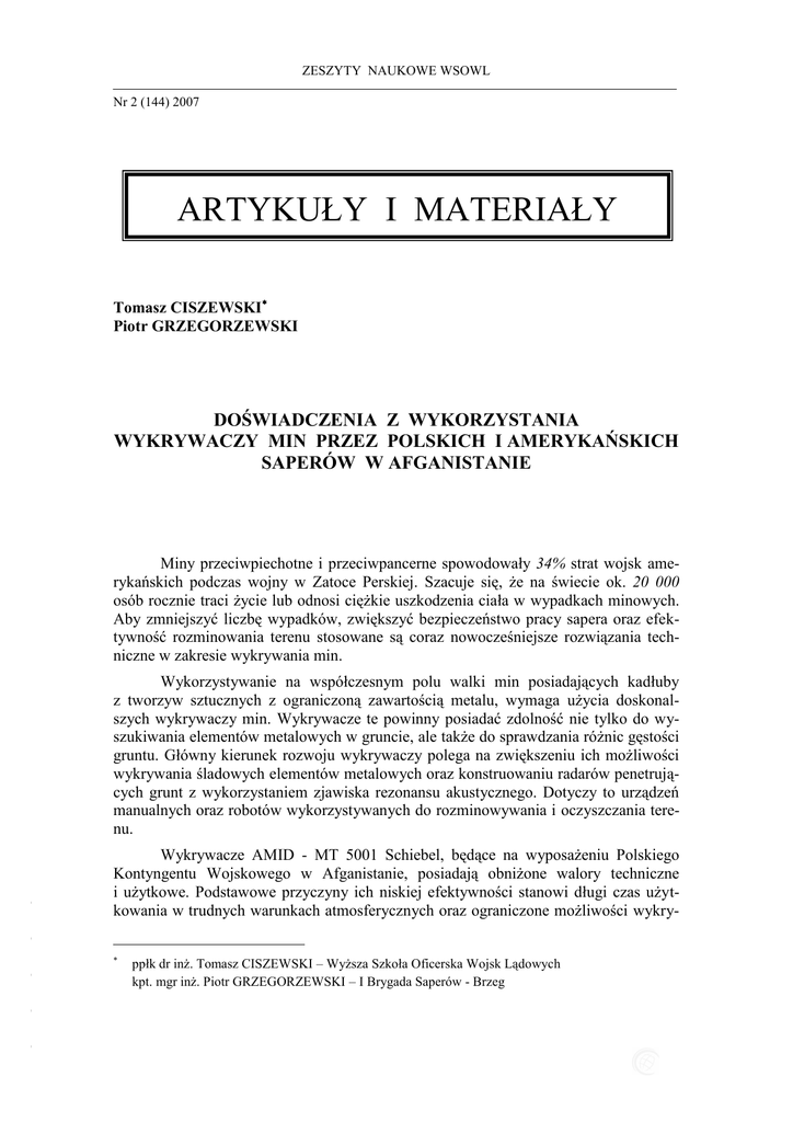ZESZYTY NAUKOWE WSOWL Nr 2 (144) 2007 ARTYKUŁY I MATERIAŁY Tomasz CISZEWSKI Piotr GRZEGORZEWSKI DOŚWIADCZENIA Z WYKORZYSTANIA WYKRYWACZY MIN PRZEZ POLSKICH I AMERYKAŃSKICH SAPERÓW W AFGANISTANIE Miny przeciwpiechotne i przeciwpancerne spowodowały 34% strat wojsk amerykańskich podczas wojny w Zatoce Perskiej. Szacuje się, że na świecie ok. 20 000 osób rocznie traci życie lub odnosi ciężkie uszkodzenia ciała w wypadkach minowych. Aby zmniejszyć liczbę wypadków, zwiększyć bezpieczeństwo pracy sapera oraz efektywność rozminowania terenu stosowane są coraz nowocześniejsze rozwiązania techniczne w zakresie wykrywania min. Wykrywacze AMID - MT 5001 Schiebel, będące na wyposażeniu Polskiego Kontyngentu Wojskowego w Afganistanie, posiadają obniżone walory techniczne i użytkowe. Podstawowe przyczyny ich niskiej efektywności stanowi długi czas użytkowania w trudnych warunkach atmosferycznych oraz ograniczone możliwości wykry- - - Wykorzystywanie na współczesnym polu walki min posiadających kadłuby z tworzyw sztucznych z ograniczoną zawartością metalu, wymaga użycia doskonalszych wykrywaczy min. Wykrywacze te powinny posiadać zdolność nie tylko do wyszukiwania elementów metalowych w gruncie, ale także do sprawdzania różnic gęstości gruntu. Główny kierunek rozwoju wykrywaczy polega na zwiększeniu ich możliwości wykrywania śladowych elementów metalowych oraz konstruowaniu radarów penetrujących grunt z wykorzystaniem zjawiska rezonansu akustycznego. Dotyczy to urządzeń manualnych oraz robotów wykorzystywanych do rozminowywania i oczyszczania terenu. - - - ppłk dr inż. Tomasz CISZEWSKI – Wyższa Szkoła Oficerska Wojsk Lądowych kpt. mgr inż. Piotr GRZEGORZEWSKI – I Brygada Saperów - Brzeg Tomasz CISZEWSKI, Piotr GRZEGORZEWSKI wania min, których kadłuby wykonane są z tworzyw sztucznych, z minimalną zawartość elementów metalowych. Praktyczny brak możliwości wykrywania tych min przy użyciu wykrywaczy Schiebel ogranicza bezpieczeństwo, zakres i tempo rozminowania. Doświadczenia zdobyte podczas prac z wykorzystaniem wykrywaczy Schiebel pozwalają stwierdzić, że urządzenia te są wrażliwe na warunki atmosferyczne. Przy dużej wilgotności gruntu (okres zimowy i wczesnowiosenny) następowało szybkie ich rozstrojenie. Średni czas prawidłowej pracy wykrywaczy wynosił 2 - 3 godz. Po tym okresie następowały trudności w ich działaniu. Po zestrojeniu, już po upływie kilkudziesięciu minut, następowało rozstrojenie głównego modułu wykrywacza, co uniemożliwiało prawidłową jego pracę, ograniczając właściwą lokalizację przedmiotów niebezpiecznych. Wykrywacze w czasie pracy często pomijały odłamki metalowe wskazując, że teren jest czysty. W ciągu zmiany trwającej 30 min trzeba było je kilkakrotnie zestrajać. Po ponownym nastrojeniu i sprawdzeniu tego samego terenu, wykrywacze wskazywały, że znajdują się w nim elementy metalowe. Wykrywacze Schiebel przeznaczone są do wykrywania elementów metalowych w gruncie nie posiadają możliwości wykrywania min z tworzyw sztucznych, z minimalną zawartością metalu. Nie podają sygnału znalezienia min YM – II i TC – 6. Po zbliżeniu wykrywacza do miny na odległość ok. 3 cm mimo, że na testerze wykazywana była jego sprawność i gotowość do działania, wykrywacz nie wskazywał sygnałem jej znalezienia. Wykrywacze Schiebel nie odróżniają zwykłych odłamków metalu od przedmiotów niebezpiecznych (miny, bomby, pociski). Pracując nimi w terenie z dużą ilością elementów metalowych, a tak jest w Afganistanie, trzeba przeszukiwać każdy centymetr gruntu, co zmniejsza efektywność pracy sapera. Ponadto używając tych wykrywaczy nie można znaleźć materiału wybuchowego ze zniszczonej miny, choć zadaniem saperów jest oczyścić teren z materiałów wybuchowych. Poza wykrywaczami Schiebel, na wyposażeniu Polskiego kontyngentu znajdują się także wykrywacze W3P. Możliwości ich wykorzystania w warunkach Afganistanu są jednak minimalne. Przeprowadzony w październiku 2005r. test w ośrodku szkolenia saperów w bazie Bagram wykazał, że wykrywacz W3P, na 10 rodzajów min ustawionych w gruncie znajduje tylko TM62M, a pozostałych min nie wykrywał. Wykrywacz AN/PSS - 14 - - - - Przykładem urządzenia nowej generacji jest wykrywacz min AN/PSS - 14 używany przez amerykańskich saperów w Afganistanie i Iraku (fot. 1 i 2). Wykrywacz ten opracowano tak aby uwzględniał warunki gruntowe Afganistanu i występujące tam miny. - 6 DOŚWIADCZENIA Z WYKORZYSTANIA WYKRYWACZY MIN… Fot. 1. Rozminowanie terenu wykrywaczem AN/PSS-14 Wykrywacz AN/PSS - 14 stanowi urządzenie w skład, którego wchodzi georadar (Ground Penetrating Radar - GPR) , czuły detektor metalu (metal detector) oraz wibrometr. Do pamięci urządzenia wprowadzono charakterystyki różnego rodzaju gruntów. Połączenie georadaru i wykrywacza umożliwia wykrywanie przeciwpiechotnych i przeciwpancernych min o małej zawartości metalu (low - metalic mines). Wykrywacz zapewnia duże prawdopodobieństwo wykrycia min, przy niskim poziomie sygnalizowania fałszywego alarmu o znalezieniu przedmiotu niebezpiecznego. Dotyczy to wszystkich rodzajów oraz stanów gruntu (gliniastego i piaszczystego, zawilgoconego, suchego, zamarzniętego, zanieczyszczonego odłamkami metalu). Zastosowanie w wykrywaczu programu komputerowego pozwala saperowi odróżniać fałszywe sygnały (po napotkaniu mało istotnych przedmiotów metalowych) od sygnałów wysyłanych przez minę. Sygnały odbierane przez wykrywacz uwzględniają właściwości gruntów, które są różne dla poszczególnych ich rodzajów. Rozpoznawanie odbywa się poprzez porównanie odbieranego sygnału z sygnałem zapisanym w bazie danych. Podczas rozminowania terenu urządzenie automatycznie dostosowuje się do zmieniających się warunków gruntowych. Potencjalny alarm dotyczący wykrycia miny przekazywany jest w formie syg