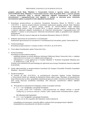 PROTOKÓŁ Z KONSULTACJI SPOŁECZNYCH projektu uchwały Rady Miejskiej w Tarnowskich Górach w sprawie zmiany uchwały Nr XXXVI/398/2012 Rady Miejskiej w Tarnowskich Górach z dnia 28 grudnia 2012r. w sprawie sposobu i zakresu świadczenia usług w zakresie odbierania odpadów komunalnych od właścicieli nieruchomości i zagospodarowania tych odpadów w zamian za uiszczoną przez właściciela nieruchomości opłatę za gospodarowanie odpadami komunalnymi 1. Konsultacje przeprowadzono na podstawie Zarządzenia Burmistrza Miasta Nr 589/2013 z dnia 15.03.2013r. w sprawie przeprowadzenia konsultacji społecznych projektu uchwały Rady Miejskiej w Tarnowskich Górach w sprawie zmiany uchwały Nr XXXVI/398/2012 Rady Miejskiej w Tarnowskich Górach z dnia 28 grudnia 2012r. w sprawie sposobu i zakresu świadczenia usług w zakresie odbierania odpadów komunalnych od właścicieli nieruchomości i zagospodarowania tych odpadów w zamian za uiszczoną przez właściciela nieruchomości opłatę za gospodarowanie odpadami komunalnymi. Projekt ww. uchwały stanowił załącznik do Zarządzenia Burmistrza Miasta Nr 589/2013. 2. Podmioty uprawnione do uczestnictwa w konsultacjach: Podmiotami uprawnionymi do uczestnictwa w konsultacjach byli mieszkańcy gminy Tarnowskich Gór. 3. Termin konsultacji: Konsultacje przeprowadzono w terminie od dnia 15.03.2013r. do 22.03.2013r. 4. Teren objęty konsultacjami: gmina Tarnowskie Góry. 5. Forma konsultacji: Konsultacje przeprowadzono poprzez: − publikację projektu na stronie Biuletynu Informacji Publicznej Miasta Tarnowskie Góry w zakładce ogłoszenia oraz na stronie www.odpady.tarnowskiegory.pl, − udostępnienie w wersji papierowej w Urzędzie Miejskim w Wydziale Gospodarki Miejskiej przy ul. Sienkiewicza 2, pok. 29 i 32. Wydruki stron internetowych potwierdzających ogłoszenie powyższego Zarządzenia stanowią załączniki do protokołu. 6. Osobą odpowiedzialną za przeprowadzenie konsultacji był Zastępca Naczelnika Wydziału Gospodarki Miejskiej – Krzysztof Czarnecki. 7. Wyniki konsultacji: W terminie do dnia 22.03.2013r., za pośrednictwem Kancelarii Ogólnej Urzędu Miejskiego w Tarnowskich Górach nie wpłynęła do Burmistrza Miasta żadna uwaga. Natomiast za pośrednictwem drogi elektronicznej na adres: [email protected] zostały wniesione do Burmistrza Miasta dwie uwagi dotyczące przedmiotu konsultacji, obie dotyczyły częstotliwości odbioru odpadów komunalnych. 1) Wnioskodawca zaproponował następujące zmiany do projektu uchwały: a) § 2. 1. ust 3 podpunkt c przyjmuje brzmienie: po cztery worki 120 l wykonane z folii przeznaczone na odpady zebrane w sposób selektywny tj. tworzywa sztuczne i metale, szkło i opakowania wielomateriałowe, papier, lub alternatywnie/zamiennie: b) § 3. 1. ust.3 podpunkt a przyjmuje brzmienie: jeden raz na dwa tygodnie dla budynków jednorodzinnych, uzasadniając powstawaniem i potrzebą odbioru większej ilości posegregowanych odpadów komunalnych na nieruchomości niż określa to uchwała. 2) Wnioskodawca zaproponował dla domów jednorodzinnych zmianę częstotliwości odbioru odpadów biodegradowalnych z jednego razu w miesiącu na odbiór co 2 tygodnie, uzasadniając uciążliwością przy tak długim okresie przechowywania oraz brakiem możliwości składowania nadwyżki takich odpadów w przydomowym kompostowniku. 8. Ustosunkowując się do wniosków złożonych w trakcie konsultacji przedstawiam następujące wyjaśnienia: − ilość powstających odpadów oraz częstotliwość ich odbioru z nieruchomości została określona statystycznie na jednego mieszkańca zgodnie z wytycznymi Wojewódzkiego Planu Gospodarki Odpadami dla naszego regionu, − na poszczególnych nieruchomościach mogą powstawać różnice w postaci nadwyżki lub niedoboru niektórych rodzajów pojemników lub worków, − w przypadku takich frakcji jak: tworzywa sztuczne, metale, opakowania wielomateriałowe, szkło, papier - ilość worków dostarczanych na nieruchomość będzie mogła być indywidualnie modyfikowana przez operatora, − w przypadku frakcji odpadów biodegradowalnych - nadwyżkę będzie można bezpłatnie przekazać w dowolnym momencie do Punktu Selektywnego Zbiórki Odpadów Komunalnych (PSZOK) dostarczając własnym transportem - miejsce i godziny pracy PSZOK zostaną podane do wiadomości mieszkańców w trakcie uruchomienia systemu, − do PSZOK będzie można dostarczyć nadwyżkę wszystkich frakcji posegregowanych odpadów komunalnych, oprócz wyżej wymienionych m.in. takie, jak: odpady wielkogabarytowe, opony, gruz z drobnych indywidualnych remontów, sprzęt elektryczny i elektroniczny - RTV-AGD, baterie i akumulatory, świetlówki, resztki farb i lakierów, pojemniki po olejach, aerozolach, benzynie, tonery i tusze do drukarek, taśmy wideo, materiały fotograficzne, stare kosmetyki, termometry, igły i strzykawki, itp. W związku z powyższym poddany konsultacjom projekt ww. uchwały Rady Miejskiej w Tarnowskich Górach zostanie przedłożony pod obrady Rady Miejskiej w Tarnowskich Górach. Protokół sporządził: Krzysztof Czarnecki dnia 25.03.2013 r. BURMISTRZ MIASTA /-/ Arkadiusz CZECH