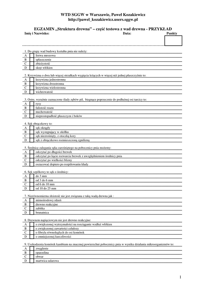 WTD SGGW w Warszawie, Paweł Kozakiewicz http://pawel_kozakiewicz.users.sggw.pl EGZAMIN „Struktura drewna” – część testowa z wad drewna - PRZYKŁAD Imię i Nazwisko: Data: Punkty 1. Do grupy wad budowy kształtu pnia nie należy: A listwa mrozowa B spłaszczenie C zbieżystość D skręt włókien 2. Krzywizna o dwu lub więcej strzałkach wygięcia leżących w więcej niż jednej płaszczyźnie to: A krzywizna jednostronna B krzywizna dwustronna C krzywizna wielostronna D wichrowatość 3. Ostre, wyraźnie zaznaczone ślady zębów pił, biegnące poprzecznie do podłużnej osi tarcicy to: A rysy B falistość rzazu C mechowatość D nieprostopadłość płaszczyzn i boków 4. Sęk obrączkowy to: A sęk okrągły B sęk występujący w okółku C sęk niezrośnięty, z otoczką kory D sęk z obrączkowo rozmieszczoną zgnilizną 5. Średnicę zalegania sęka zarośniętego na pobocznicy pnia możemy: A odczytać po długości brewek B odczytać po kącie rozwarcia brewek z uwzględnieniem średnicy pnia C odczytać po wielkości blizny D oszacować dopiero po rozpiłowaniu kłady 6. Sęk szpilkowy to sęk o średnicy: A do 3 mm B od 3 do 6 mm C od 6 do 10 mm D od 10 do 25 mm 7. Nierównomierna słoistość nie jest związana z taką wadą drewna jak : A mimośrodowy rdzeń B drewno reakcyjne C zabitka D brunatnica 8. Drewnem napięciowym nie jest drewno reakcyjne: A o zwiększonej wytrzymałości na rozciąganie wzdłuż włókien B o zwiększonej zawartości celulozy C o fibryla równoległych do osi komórek D o zmniejszonej kurczliwości 9. Uszkodzenia komórek kambium na znacznej powierzchni pobocznicy pnia w wyniku działania mikroorganizmów to: A zwęglenie B oparzelina C obwar D martwica udarowa 1 WTD SGGW w Warszawie, Paweł Kozakiewicz http://pawel_kozakiewicz.users.sggw.pl 10. Fale włóknistości nie są opisane przez taką wielkość jak: A długość fali B gęstość fali C kąt nachylenia grzbietów włóknistości D amplituda fali 11. Plamy lub smugi o niebiesko-czarnej barwie to: A zaszarzenia B zabarwienia od metalu C plamy garbnikowe D zaciągi słoneczne 12. Zranienia pobocznicy pnia wywołane ostrymi narzędziami to : A zaciosy B spałowania C odarcia kory D obwar 13. Pęknięcie łukowe to pęknięcie: A rdzeniowe B załamane C okrężne D zewnętrzne 14.Czerwień twardzieli to: A typ barwicy drewna wywołanej przez mikroorganizmy B typ zgnilizny drewna C typ fałszywej twardzieli D typ barwicy drewna wywołany przez czynniki atmosferyczne 15.Do najgroźniejszych grzybów wywołujących zgnilizny w drewnie wbudowanym (I grupa) nie należy:: A grzyb domowy właściwy B grzyb domowy biały C grzyb piwniczny D grzyb składnicowy Opracował: Paweł Kozakiewicz 2