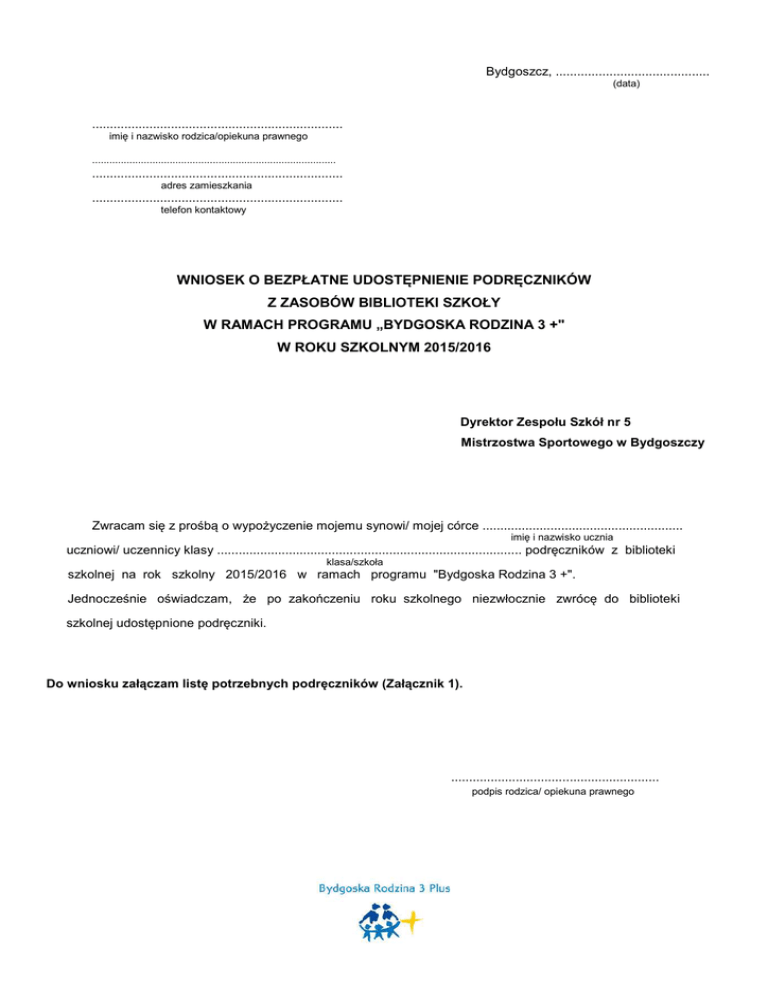 Bydgoszcz, ........................................... (data) ...................................................................... imię i nazwisko rodzica/opiekuna prawnego ..................................................................................... ...................................................................... adres zamieszkania ...................................................................... telefon kontaktowy WNIOSEK O BEZPŁATNE UDOSTĘPNIENIE PODRĘCZNIKÓW Z ZASOBÓW BIBLIOTEKI SZKOŁY W RAMACH PROGRAMU „BYDGOSKA RODZINA 3 +" W ROKU SZKOLNYM 2015/2016 Dyrektor Zespołu Szkół nr 5 Mistrzostwa Sportowego w Bydgoszczy Zwracam się z prośbą o wypożyczenie mojemu synowi/ mojej córce ........................................................ imię i nazwisko ucznia uczniowi/ uczennicy klasy ..................................................................................... podręczników z biblioteki klasa/szkoła szkolnej na rok szkolny 2015/2016 w ramach programu "Bydgoska Rodzina 3 +". Jednocześnie oświadczam, że po zakończeniu roku szkolnego niezwłocznie zwrócę do biblioteki szkolnej udostępnione podręczniki. Do wniosku załączam listę potrzebnych podręczników (Załącznik 1). .......................................................... podpis rodzica/ opiekuna prawnego