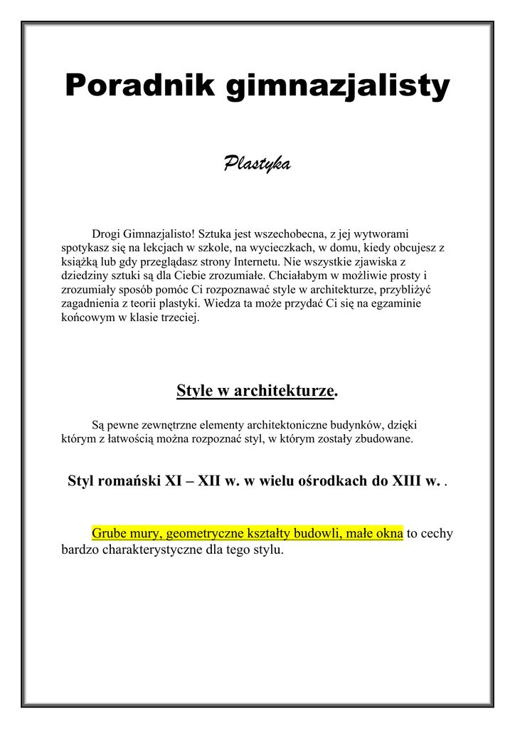 Poradnik gimnazjalisty Plastyka Drogi Gimnazjalisto! Sztuka jest wszechobecna, z jej wytworami spotykasz się na lekcjach w szkole, na wycieczkach, w domu, kiedy obcujesz z książką lub gdy przeglądasz strony Internetu. Nie wszystkie zjawiska z dziedziny sztuki są dla Ciebie zrozumiałe. Chciałabym w możliwie prosty i zrozumiały sposób pomóc Ci rozpoznawać style w architekturze, przybliżyć zagadnienia z teorii plastyki. Wiedza ta może przydać Ci się na egzaminie końcowym w klasie trzeciej. Style w architekturze. Są pewne zewnętrzne elementy architektoniczne budynków, dzięki którym z łatwością można rozpoznać styl, w którym zostały zbudowane. Styl romański XI – XII w. w wielu ośrodkach do XIII w. . Grube mury, geometryczne kształty budowli, małe okna to cechy bardzo charakterystyczne dla tego stylu. Kraków. Rotunda NMP. Na Wawelu rekonstrukcja. Rotunda to budowla na planie koła, kryta kopułą. Romańskie kościoły jednak najczęściej budowano na planie krzyża łacińskiego Schemat rzutu poziomego kościoła romańskiego. Bardzo charakterystyczne jest okno pojedyncze zakończone u góry półkoliście. Romańskie okno potrójne to triforium, podwójne nazywają się biforia a poczwórne quadriforia. Portal to opracowanie architektoniczne i rzeźbiarskie drzwi wejściowych. Romański łatwo można rozpoznać po półkolistym polu zwanym tympanonem nad wejściem.