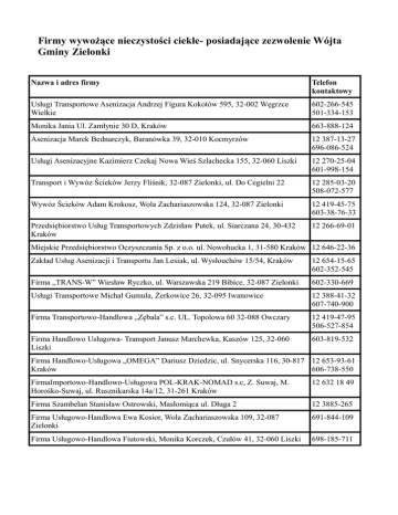 Firmy wywożące nieczystości ciekłe- posiadające zezwolenie Wójta Gminy Zielonki Nazwa i adres firmy Telefon kontaktowy Usługi Transportowe Asenizacja Andrzej Figura Kokotów 595, 32-002 Węgrzce Wielkie 602-266-545 501-334-153 Monika Jania Ul. Zamłynie 30 D, Kraków 663-888-124 Asenizacja Marek Bednarczyk, Baranówka 39, 32-010 Kocmyrzów 12 387-13-27 696-086-524 Usługi Asenizacyjne Kazimierz Czekaj Nowa Wieś Szlachecka 155, 32-060 Liszki 12 270-25-04 601-998-154 Transport i Wywóz Ścieków Jerzy Fliśnik, 32-087 Zielonki, ul. Do Cegielni 22 12 285-03-20 508-072-577 Wywóz Ścieków Adam Krokosz, Wola Zachariaszowska 124, 32-087 Zielonki 12 419-45-75 603-38-76-33 Przedsiębiorstwo Usług Transportowych Zdzisław Putek, ul. Siarczana 24, 30-432 Kraków 12 266-69-01 Miejskie Przedsiębiorstwo Oczyszczania Sp. z o.o. ul. Nowohucka 1, 31-580 Kraków 12 646-22-36 Zakład Usług Asenizacji i Transportu Jan Lesiak, ul. Wysłouchów 15/54, Kraków 12 654-15-65 602-352-545 Firma „TRANS-W” Wiesław Ryczko, ul. Warszawska 219 Bibice, 32-087 Zielonki 602-330-669 Usługi Transportowe Michał Gumula, Żerkowice 26, 32-095 Iwanowice 12 388-41-32 607-740-900 Firma Transportowo-Handlowa „Zębala” s.c. UL. Topolowa 60 32-088 Owczary 12 419-47-95 506-527-854 Firma Handlowo Usługowa- Transport Janusz Marchewka, Kaszów 125, 32-060 Liszki 603-819-532 Firma Handlowo-Usługowa „OMEGA” Dariusz Dziedzic, ul. Snycerska 116, 30-817 12 653-93-61 Kraków 606-738-550 FirmaImportowo-Handlowo-Usługowa POL-KRAK-NOMAD s.c, Z. Suwaj, M. Horośko-Suwaj, ul. Rusznikarska 14a/12, 31-261 Kraków 12 632 18 49 Firma Szambelan Stanisław Ostrowski, Masłomiąca ul. Długa 2 12 3885-265 Firma Usługowo-Handlowa Ewa Kosior, Wola Zachariaszowska 109, 32-087 Zielonki 691-844-109 Firma Usługowo-Handlowa Fiutowski, Monika Korczek, Czułów 41, 32-060 Liszki 698-185-711