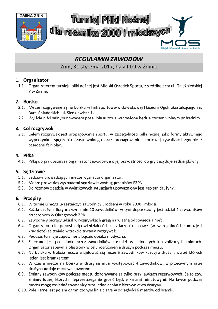 REGULAMIN ZAWODÓW Żnin, 31 stycznia 2017, hala I LO w Żninie 1. Organizator 1.1. Organizatorem turnieju piłki nożnej jest Miejski Ośrodek Sportu, z siedzibą przy ul. Gnieźnieńskiej 7 w Żninie. 2. Boisko 2.1. Mecze rozgrywane są na boisku w hali sportowo-widowiskowej I Liceum Ogólnokształcącego im. Barci Śniadeckich, ul. Sienkiewicza 1. 2.2. Wyjście piłki pełnym obwodem poza linie autowe wznowione będzie rzutem wolnym pośrednim. 3. Cel rozgrywek 3.1. Celem rozgrywek jest propagowanie sportu, w szczególności piłki nożnej jako formy aktywnego wypoczynku, spędzenia czasu wolnego oraz propagowanie sportowej rywalizacji zgodnie z zasadami fair-play. 4. Piłka 4.1. Piłkę do gry dostarcza organizator zawodów, a o jej przydatności do gry decyduje sędzia główny. 5. Sędziowie 5.1. Sędziów prowadzących mecze wyznacza organizator. 5.2. Mecze prowadzą wyznaczeni sędziowie według przepisów PZPN. 5.3. Do rozmów z sędzią w wyjątkowych sytuacjach upoważniony jest kapitan drużyny. 6. Przepisy 6.1. W turnieju mogą uczestniczyć zawodnicy urodzeni w roku 2000 i młodsi. 6.2. Każda drużyna liczy maksymalnie 10 zawodników, w tym dopuszczony jest udział 4 zawodników zrzeszonych w Okręgowych ZPN. 6.3. Zawodnicy biorący udział w rozgrywkach grają na własną odpowiedzialność. 6.4. Organizator nie ponosi odpowiedzialności za zdarzenia losowe (w szczególności kontuzje i kradzieże) zaistniałe w trakcie trwania rozgrywek. 6.5. Podczas turnieju zapewniona będzie opieka medyczna. 6.6. Zalecane jest posiadanie przez zawodników koszulek w jednolitych lub zbliżonych kolorach. Organizator zapewnia plastrony w celu rozróżnienia drużyn podczas meczu. 6.7. Na boisku w trakcie meczu znajdować się może 5 zawodników każdej z drużyn, wśród których jeden jest bramkarzem. 6.8. W czasie meczu na boisku w drużynie musi występować 4 zawodników, w przeciwnym razie drużyna oddaje mecz walkowerem. 6.9. Zmiany zawodników podczas meczu dokonywane są tylko przy ławkach rezerwowych. Są to tzw. zmiany lotne, których nieprzestrzeganie grozić będzie karami minutowymi. Na ławce podczas meczu mogą zasiadać zawodnicy oraz jedna osoba z kierownictwa drużyny. 6.10. Pole karne jest polem ograniczonym linią ciągłą w odległości 6 metrów od bramki. 6.11. Rzut karny wykonywany będzie z odległości wyznaczonego punktu w odległości 7 metrów od linii bramkowej. 6.12. W czasie wykonywanie rzutów wolnych, z autu lub rogu zawodnik drużyny przeciwnej musi zachować odległość 4 metrów od piłki. 6.13. Po wyjściu piłki za linię bramkową, bramkarz wznawia grę rękoma. Czas trzymania piłki w rękach bramkarza wynosi 6 sekund. Po ustawieniu piłki na nawierzchni boiska, bramkarz nie może ponownie dotknąć jej rękoma. Z chwilą ustawienia przez bramkarza piłki na nawierzchni gra zostaje wznowiona. 6.14. Bramkarz nie może chwytać piłki w ręce po podaniu od zawodnika swojej drużyny. 6.15. W rozgrywkach nie obowiązują spalone. 6.16. Zabrania się wchodzenia w przeciwnika tzw. wślizgiem. 6.17. W czasie meczów obowiązuje obuwie przeznaczone do gry na hali sportowej. 6.18. Nie jest dozwolona gra w obuwiu z korkami i małymi koreczkami. 6.19. Walkower za niestawienie się do meczu zostaje odgwizdany po upływie 5 minut od pierwszego gwizdka sędziego. 6.20. Za zniszczenia sprzętu i infrastruktury odpowiada osoba, która owego zniszczenia dokonała. W przypadku nieustalenia sprawcy zniszczenia, odpowiedzialność i koszty rozłożone zostaną na wszystkich uczestników turnieju. 6.21. Pozostałe przepisy gry pozostają zgodne z Regulaminem PZPN. 7. Kary dla zawodników i drużyn 7.1. Indywidualnie zawodnicy karani będą karami dwuminutowymi lub większymi. 7.2. W przypadku wybitnie niesportowego zachowania zawodnik otrzymywać będzie czerwoną kartkę, równoznaczną z wykluczeniem z reszty turnieju. Organizator MIEJSKI OŚRODEK SPORTU w Żninie 24 stycznia 2017