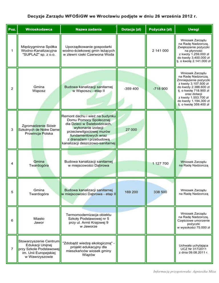 Decyzje Zarządu WFOŚiGW we Wrocławiu podjęte w dniu 26 września 2012 r. Poz. 1 2 3 Wnioskodawca Międzygminna Spółka Wodno-Kanalizacyjna "SUPLAZ" sp. z o.o. Gmina Wąsosz Nazwa zadania Uporządkowanie gospodarki wodno-ściekowej gmin leżących w zlewni rzeki Czerwona Woda Budowa kanalizacji sanitarnej w Wąsoszu - etap II Remont dachu i wież na budynku Domu Pomocy Społecznej dla Dzieci w Świebodzicach, Zgromadzenie Sióstr wykonanie izolacji Szkolnych de Notre Dame przeciwwilgociowej murów Prowincja Polska fundamentowych wraz z drenażem i przebudową kanalizacji deszczowo-sanitarnej 4 Gmina Twardogóra Budowa kanalizacji sanitarnej w miejscowości Dąbrowa 5 Gmina Twardogóra Budowa kanalizacji sanitarnej w miejscowości Dąbrowa - etap II Miasto Jawor Termomodernizacja obiektu Szkoły Podstawowej nr 5 przy ul. Armii Krajowej 9 w Jaworze 6 7 Dotacja (zł) Stowarzyszenie Centrum "Zdobądź wiedzę ekologiczną" Edukacji Unijnej projekt edukacyjny dla przy Szkole Podstawowej mieszkańców wiosek gminy im. Unii Europejskiej Wiązów w Wawrzyszowie -359 400 Pożyczka (zł) Uwagi 2 141 000 Wniosek Zarządu na Radę Nadzorczą. Zwiększenie pożyczki na płynność z kwoty 1.259.000 zł do kwoty 3.400.000 zł tj. o kwotę 2.141.000 zł -718 900 Wniosek Zarządu na Radę Nadzorczą. Zmniejszenie pożyczki z kwoty 3.107.500 zł do kwoty 2.388.600 zł tj. o kwotę 718.900 zł oraz dotacji z kwoty 1.553.700 zł do kwoty 1.194.300 zł tj. o kwotę 359.400 zł 1 127 700 Wniosek Zarządu na Radę Nadzorczą 338 500 Wniosek Zarządu na Radę Nadzorczą 27 000 169 200 Wniosek Zarządu na Radę Nadzorczą. Częściowe umorzenie pożyczki w wysokości 75.000 zł Uchwała uchylająca UCZ Nr 317/2011 z dnia 09.08.2011 r. Informację przygotowała: Agnieszka Miza 8 9 10 Gmina Pęcław Zakup lekkiego samochodu do ratownictwa chemicznoekologicznego dla Ochotniczej Straży Pożarnej w Piersnej Uchwała uchylająca UCZ Nr 401/2012 z dnia 05.10.2012 r. Fundacja Kierunek Przygoda "Lato z przygodą” - profilaktyka zdrowotna dzieci i młodzieży z terenu Wrocławia na koloniach letnich w Świętouściu oraz obozie wypoczynkowym w Kurnędzu nad Pilicą Zmniejszenie dotacji z kwoty 28.000 zł do kwoty 25.200 zł tj. o kwotę 2.800 zł Program Usuwania Azbestu -2 800 Informacja Zarządu na Radę Nadzorczą. Przyjęcie Regulaminu do III edycji konkursu. Informację przygotowała: Agnieszka Miza