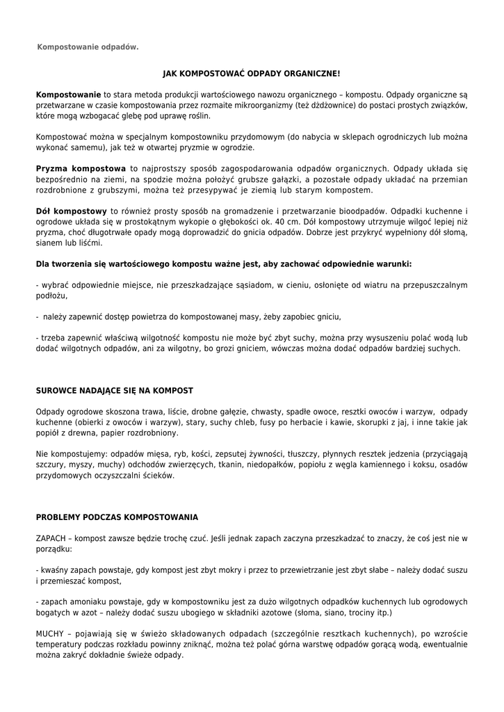 Kompostowanie odpadów. JAK KOMPOSTOWAĆ ODPADY ORGANICZNE! Kompostowanie to stara metoda produkcji wartościowego nawozu organicznego – kompostu. Odpady organiczne są przetwarzane w czasie kompostowania przez rozmaite mikroorganizmy (też dżdżownice) do postaci prostych związków, które mogą wzbogacać glebę pod uprawę roślin. Kompostować można w specjalnym kompostowniku przydomowym (do nabycia w sklepach ogrodniczych lub można wykonać samemu), jak też w otwartej pryzmie w ogrodzie. Pryzma kompostowa to najprostszy sposób zagospodarowania odpadów organicznych. Odpady układa się bezpośrednio na ziemi, na spodzie można położyć grubsze gałązki, a pozostałe odpady układać na przemian rozdrobnione z grubszymi, można też przesypywać je ziemią lub starym kompostem. Dół kompostowy to również prosty sposób na gromadzenie i przetwarzanie bioodpadów. Odpadki kuchenne i ogrodowe układa się w prostokątnym wykopie o głębokości ok. 40 cm. Dół kompostowy utrzymuje wilgoć lepiej niż pryzma, choć długotrwałe opady mogą doprowadzić do gnicia odpadów. Dobrze jest przykryć wypełniony dół słomą, sianem lub liśćmi. Dla tworzenia się wartościowego kompostu ważne jest, aby zachować odpowiednie warunki: - wybrać odpowiednie miejsce, nie przeszkadzające sąsiadom, w cieniu, osłonięte od wiatru na przepuszczalnym podłożu, - należy zapewnić dostęp powietrza do kompostowanej masy, żeby zapobiec gniciu, - trzeba zapewnić właściwą wilgotność kompostu nie może być zbyt suchy, można przy wysuszeniu polać wodą lub dodać wilgotnych odpadów, ani za wilgotny, bo grozi gniciem, wówczas można dodać odpadów bardziej suchych. SUROWCE NADAJĄCE SIĘ NA KOMPOST Odpady ogrodowe skoszona trawa, liście, drobne gałęzie, chwasty, spadłe owoce, resztki owoców i warzyw, odpady kuchenne (obierki z owoców i warzyw), stary, suchy chleb, fusy po herbacie i kawie, skorupki z jaj, i inne takie jak popiół z drewna, papier rozdrobniony. Nie kompostujemy: odpadów mięsa, ryb, kości, zepsutej żywności, tłuszczy, płynnych resztek jedzenia (przyciągają szczury, myszy, muchy) odchodów zwierzęcych, tkanin, niedopałków, popiołu z węgla kamiennego i koksu, osadów przydomowych oczyszczalni ścieków. PROBLEMY PODCZAS KOMPOSTOWANIA ZAPACH – kompost zawsze będzie trochę czuć. Jeśli jednak zapach zaczyna przeszkadzać to znaczy, że coś jest nie w porządku: - kwaśny zapach powstaje, gdy kompost jest zbyt mokry i przez to przewietrzanie jest zbyt słabe – należy dodać suszu i przemieszać kompost, - zapach amoniaku powstaje, gdy w kompostowniku jest za dużo wilgotnych odpadków kuchennych lub ogrodowych bogatych w azot – należy dodać suszu ubogiego w składniki azotowe (słoma, siano, trociny itp.) MUCHY – pojawiają się w świeżo składowanych odpadach (szczególnie resztkach kuchennych), po wzroście temperatury podczas rozkładu powinny zniknąć, można też polać górna warstwę odpadów gorącą wodą, ewentualnie można zakryć dokładnie świeże odpady. GRYZONIE – przyciągają je świeże odpady, więc wymieszanie nowej warstwy ze starą i odpowiednie dozowanie suszu, przyspieszając rozkład zabezpieczą kompostownik przed gryzoniami i innymi zwierzętami. PLEŚŃ – pojawienie się pleśni nie jest poważnym błędem, zdarza się gdy kompost pozostawiony był w spokoju przez kilka dni. Należy dbać o to, aby kompost miał stałe dostawy odpadów i żeby nie był zbyt wilgotny. PREPARATY WSPOMAGAJĄCE KOMPOSTOWANIE Można je kupić w sklepach ogrodniczych. Ich rolą jest przyspieszanie kompostowania, uregulowanie stosunków węgla do azotu, niedopuszczanie do rozwoju organizmów chorobotwórczych, czy kiełkowania nasion chwastów, regulowanie odczynu pH kompostu, poprawa jakości kompostu. Do kompostownika można też włożyć specjalne gatunki dżdżownic, które znacznie przyspieszają i udoskonalają proces kompostowania bioodpadów. Kompostowniki i pryzmy warto zakładać pod bzem czarnym, leszczyną, kaliną koralową, grabem, sprzyjają one reakcjom w kompostowanym materiale. Dla zwiększenia zawartości azotu w kompoście, pryzmę można obsiać łubinem. Fusy od kawy natomiast przywabiają do kompostu dżdżownice, które przetwarzają masę biologiczną. Zachęcamy do kompostowania odpadów w przydomowych kompostownikach. Obecnie ludzie coraz częściej chcą żyć w zgodzie z prawami natury, dbając o swoje zdrowie i środowisko, w którym żyją. Wykorzystywanie do uprawy roślin kompostu jest jednym ze sposobów zdrowego stylu życia.