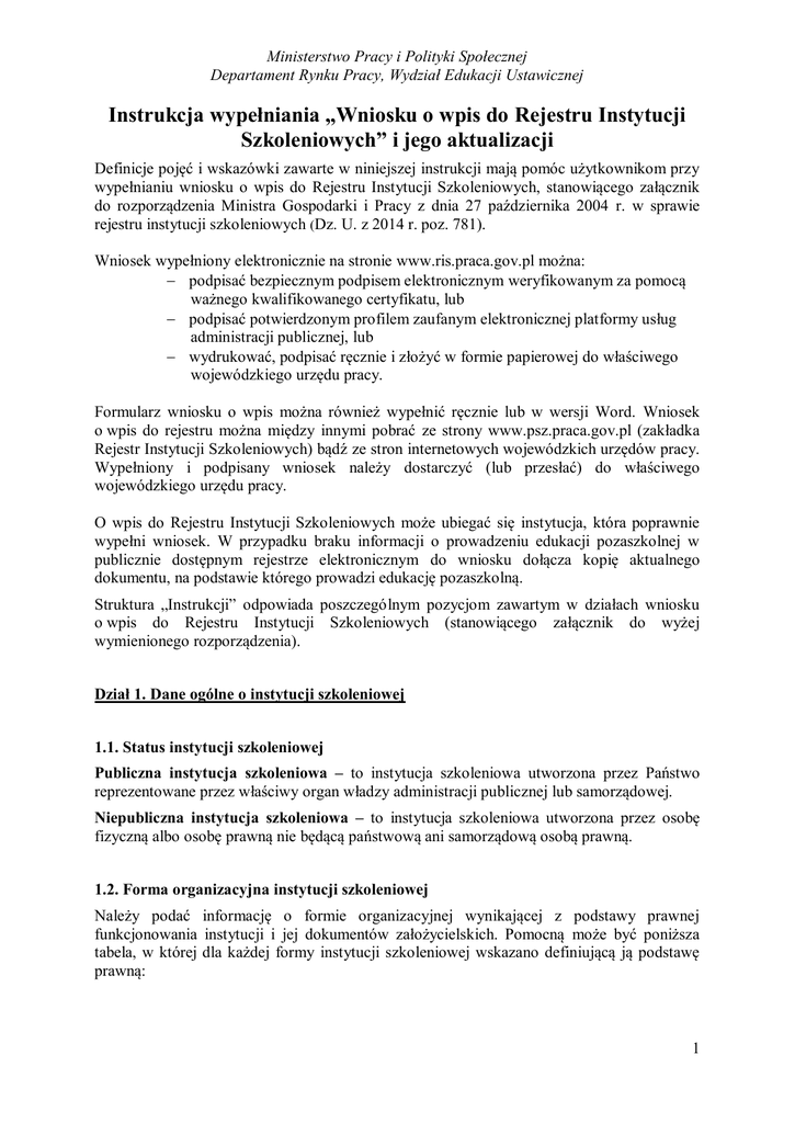 Ministerstwo Pracy i Polityki Społecznej Departament Rynku Pracy, Wydział Edukacji Ustawicznej Instrukcja wypełniania „Wniosku o wpis do Rejestru Instytucji Szkoleniowych” i jego aktualizacji Definicje pojęć i wskazówki zawarte w niniejszej instrukcji mają pomóc użytkownikom przy wypełnianiu wniosku o wpis do Rejestru Instytucji Szkoleniowych, stanowiącego załącznik do rozporządzenia Ministra Gospodarki i Pracy z dnia 27 października 2004 r. w sprawie rejestru instytucji szkoleniowych (Dz. U. z 2014 r. poz. 781). Wniosek wypełniony elektronicznie na stronie www.ris.praca.gov.pl można: podpisać bezpiecznym podpisem elektronicznym weryfikowanym za pomocą ważnego kwalifikowanego certyfikatu, lub podpisać potwierdzonym profilem zaufanym elektronicznej platformy usług administracji publicznej, lub wydrukować, podpisać ręcznie i złożyć w formie papierowej do właściwego wojewódzkiego urzędu pracy. Formularz wniosku o wpis można również wypełnić ręcznie lub w wersji Word. Wniosek o wpis do rejestru można między innymi pobrać ze strony www.psz.praca.gov.pl (zakładka Rejestr Instytucji Szkoleniowych) bądź ze stron internetowych wojewódzkich urzędów pracy. Wypełniony i podpisany wniosek należy dostarczyć (lub przesłać) do właściwego wojewódzkiego urzędu pracy. O wpis do Rejestru Instytucji Szkoleniowych może ubiegać się instytucja, która poprawnie wypełni wniosek. W przypadku braku informacji o prowadzeniu edukacji pozaszkolnej w publicznie dostępnym rejestrze elektronicznym do wniosku dołącza kopię aktualnego dokumentu, na podstawie którego prowadzi edukację pozaszkolną. Struktura „Instrukcji” odpowiada poszczególnym pozycjom zawartym w działach wniosku o wpis do Rejestru Instytucji Szkoleniowych (stanowiącego załącznik do wyżej wymienionego rozporządzenia). Dział 1. Dane ogólne o instytucji szkoleniowej 1.1. Status instytucji szkoleniowej Publiczna instytucja szkoleniowa – to instytucja szkoleniowa utworzona przez Państwo reprezentowane przez właściwy organ władzy administracji publicznej lub samorządowej. Niepubliczna instytucja szkoleniowa – to instytucja szkoleniowa utworzona przez osobę fizyczną albo osobę prawną nie będącą państwową ani samorządową osobą prawną. 1.2. Forma organizacyjna instytucji szkoleniowej Należy podać informację o formie organizacyjnej wynikającej z podstawy prawnej funkcjonowania instytucji i jej dokumentów założycielskich. Pomocną może być poniższa tabela, w której dla każdej formy instytucji szkoleniowej wskazano definiującą ją podstawę prawną: 1 Ministerstwo Pracy i Polityki Społecznej Departament Rynku Pracy, Wydział Edukacji Ustawicznej Nazwa formy Podstawa prawna pkt 1 wniosku - Szkoła ponadgimnazjalna art. 2 ust. 3a ustawy z dnia 7 września 1991 r. o systemie oświaty (tekst jedn. Dz. U. z 2004 r., Nr 256, poz. 2572 z późn. zm.) pkt 2 wniosku - Szkoła wyższa ustawa z dnia 27 lipca 2005 r. Prawo o szkolnictwie wyższym (Dz. U. z 2012 r., Nr 572 z późn. zm.) pkt 2 wniosku - Kolegium ustawa z dnia 7 września 1991 r. o systemie oświaty (tekst jedn. Dz. U. z 2004 r., Nr. 256 poz. 2572 z późn. zm.) rozporządzenie Ministra Edukacji Narodowej z dnia 12 sierpnia 1997 r. w sprawie zakładów kształcenia nauczycieli (Dz. U. z 1997 r., Nr 104, poz. 664 z późn. zm.) pkt 3 wniosku - Placówka kształcenia ustawicznego, placówka kształcenia praktycznego ustawa z dnia 7 września 1991 r. o systemie oświaty (tekst jedn. Dz. U. z 2004 r., Nr. 256, poz. 2572 z późn. zm.) rozporządzenie Ministra Edukacji Narodowej z dnia 11 stycznia 2012 r. w sprawie kształcenia ustawicznego w formach pozaszkolnych (tekst jedn. Dz. U. z 2014 r., poz. 622) pkt 4 wniosku - Ośrodek dokształcania i doskonalenia zawodowego art. 2 ust. 3a ustawy z dnia 7 września 1991 r. o systemie oświaty (tekst jedn. Dz. U. z 2004 r., N. 256, poz. 2572 z późn. zm.) rozporządzenie Ministra Edukacji Narodowej z dnia 11 stycznia 2012 r. w sprawie kształcenia ustawicznego w formach pozaszkolnych (tekst jedn. Dz.U. z 2014 r., poz. 622) pkt 5. wniosku - Placówka naukowa, ustawa z dnia 30 kwietnia 2010 r. Placówka naukowo-badawcza, Ośrodek o instytucjach badawczych (Dz. U. z Nr 96, poz. 618) badawczo-rozwojowy pkt 6 wniosku - Zakład pracy ustawa z dnia 26 czerwca 1974 r. Kodeks (Przedsiębiorstwo, instytucja, firma, pracy (tekst jedn. Dz. U. z 2014 r., poz. 1502 organizacja gospodarcza oferująca produkty z późn. zm.) lub usługi, która obok swojej podstawowej działalności podejmuje także działania o charakterze szkoleniowym na rzecz swoich pracowników, kandydatów na pracowników lub pracowników innych przedsiębiorstw działających w porozumieniu) 2 Ministerstwo Pracy i Polityki Społecznej Departament Rynku Pracy, Wydział Edukacji Ustawicznej pkt 7 wniosku – Stowarzyszenie, Zakład Doskonalenia Zawodowego ustawa z dnia 7 kwietnia 1989 r. Prawo o stowarzyszeniach (tekst jedn. Dz. U. z 2001 r., Nr 79, poz. 855 z późn. zm.) pkt 7 wniosku – Fundacja ustawa z dnia 6 kwietnia 1984 o fundacjach (tekst jedn. Dz. U. z 1991 r., Nr 46 poz. 203 z późn. zm.) pkt 7 wniosku – Spółka ustawa z dnia 15 września 2000 r. Kodeks spółek handlowych (tekst jedn. Dz. U. z 2013 r., poz. 1030 z późn. zm.) pkt 7 wniosku – Inna osoba prawna stosownie dla danej osoby prawnej (Przykłady innych osób prawnych: kościół, spółdzielnia, związek zawodowy, partia polityczna, fundusz, instytucja kultury i inne) ustawa z dnia 2 lipca 2004 r. o swobodzie (Jednoosobowy przedsiębiorca będący osobą działalności gospodarczej (tekst jedn. Dz. U. fizyczną, wykonującą działalność 2013 r., poz. 672 z późn. zm.) gospodarczą na podstawie przepisów o swobodzie działalności gospodarczej) pkt 8 wniosku - Osoba fizyczna 1.3. Rok powstania instytucji szkoleniowej - należy rozumieć jako rok powstania tej instytucji, podany w jej dokumencie założycielskim. 1.4. A